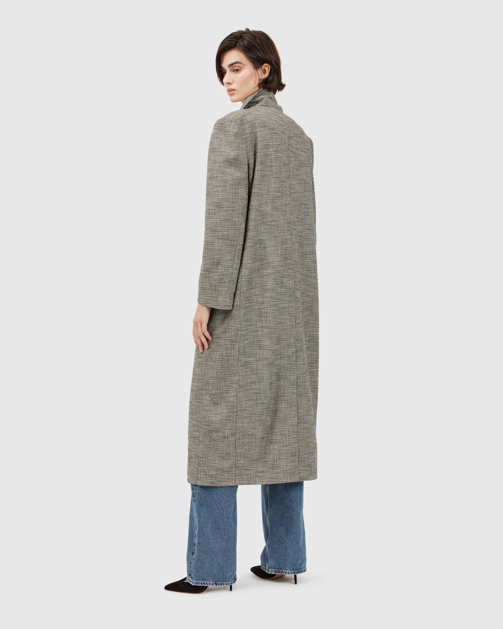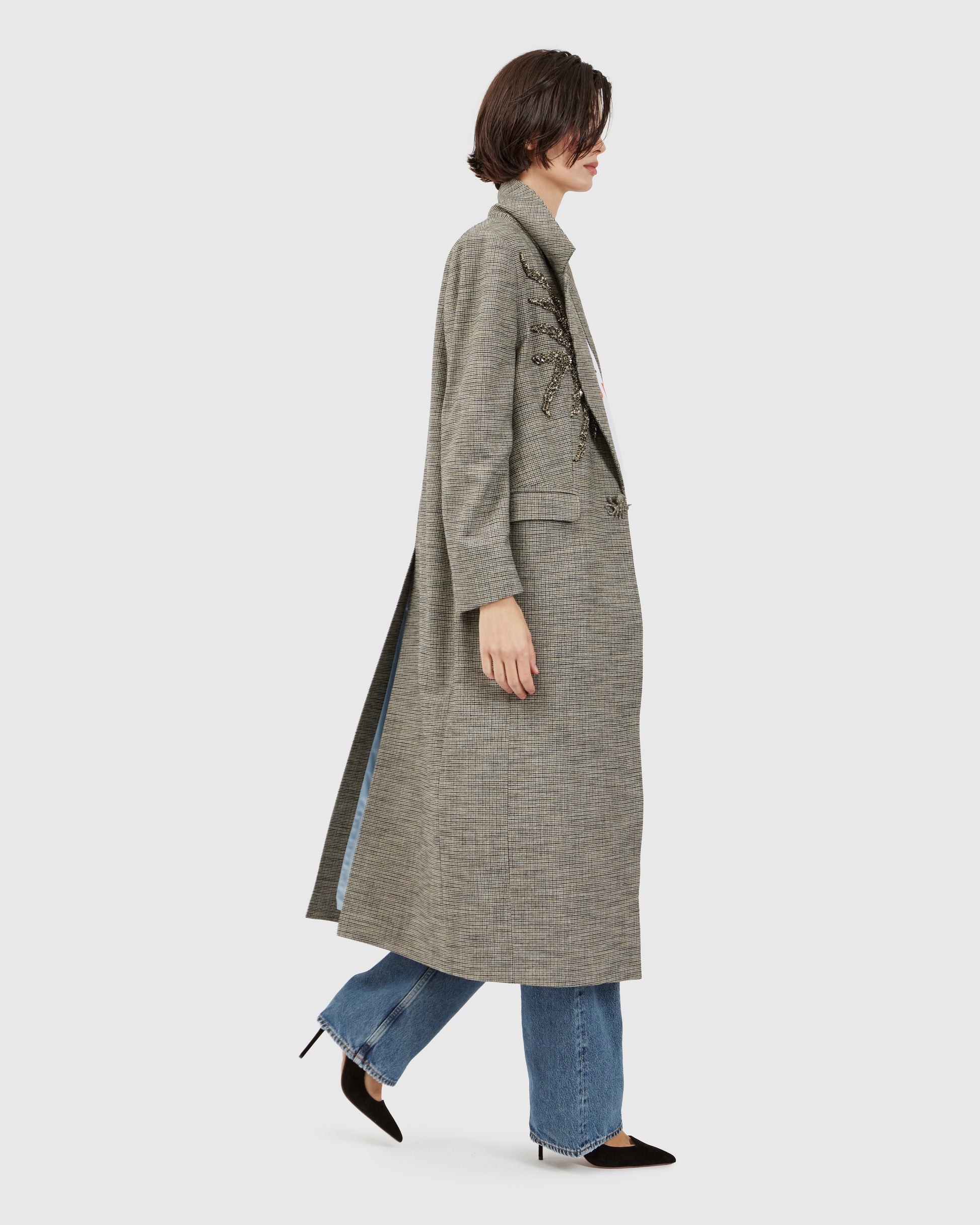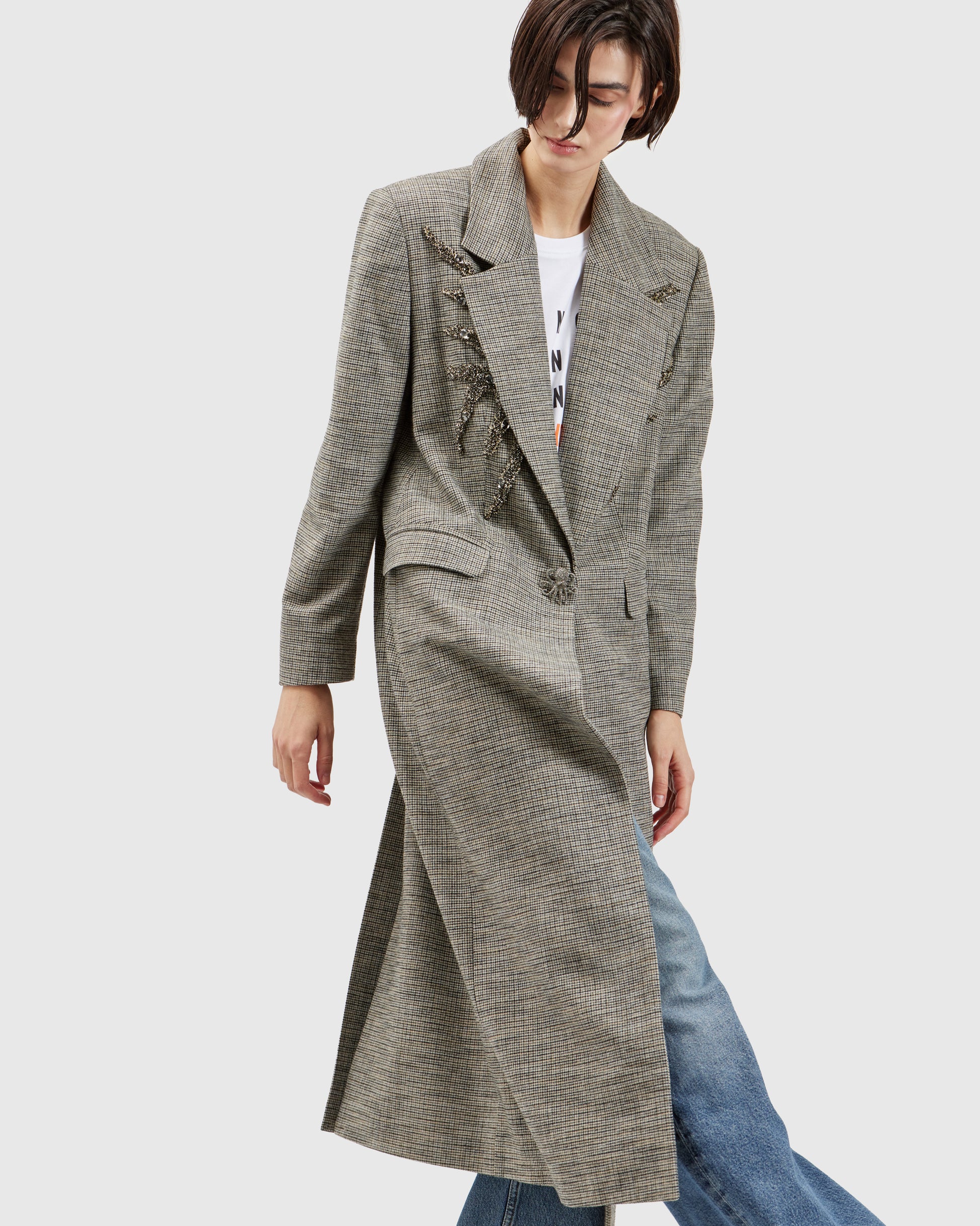 A grey overcoat, threaded with silver filaments, hints at tentacles peeking from behind the collar. A sculpted silver octopus rests near the waist, adding a striking focal point. The interplay of shimmering appliqués and fluid form gives the piece a dramatic, avant-garde presence.