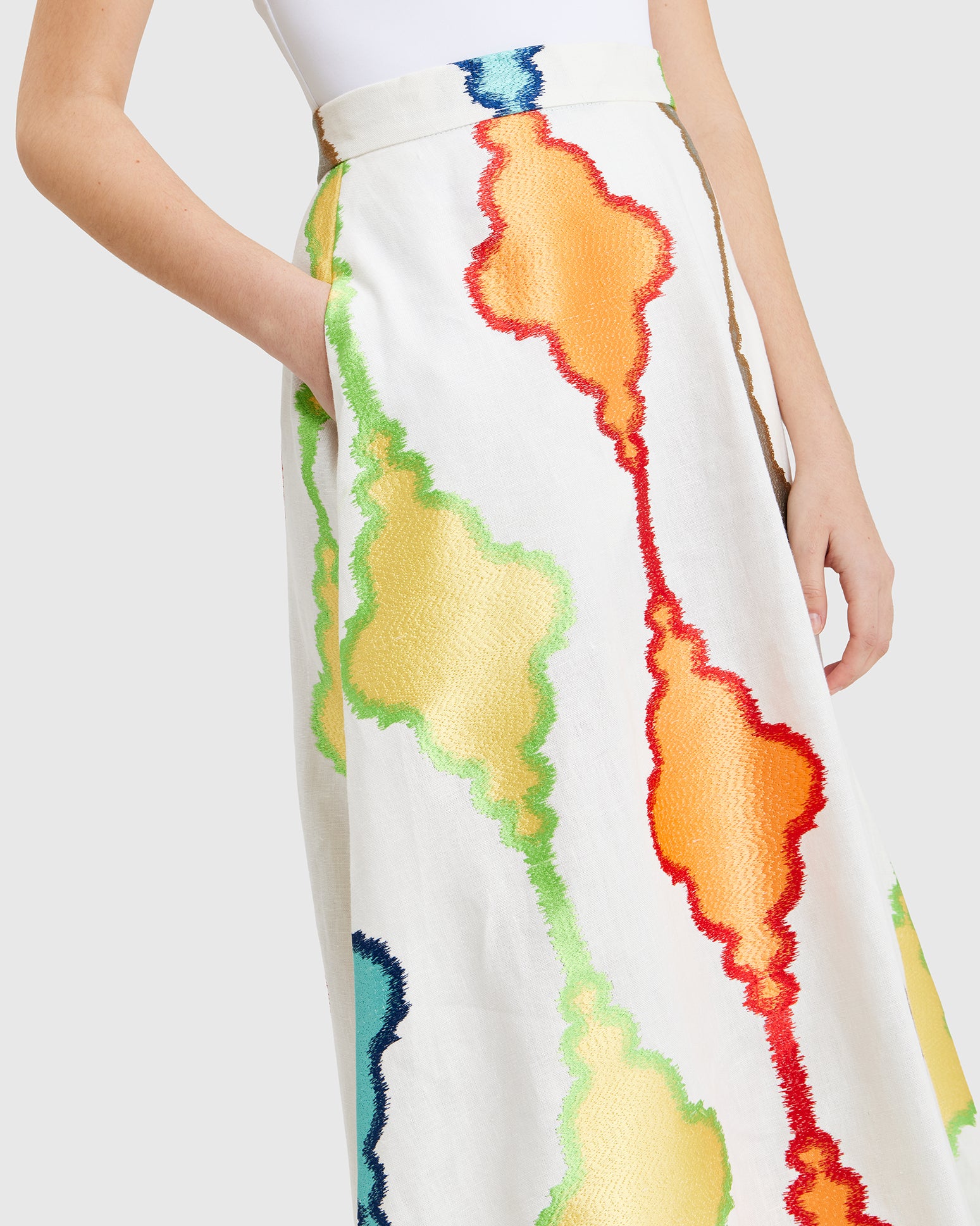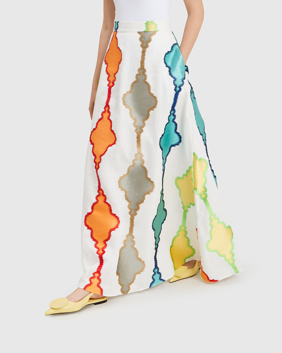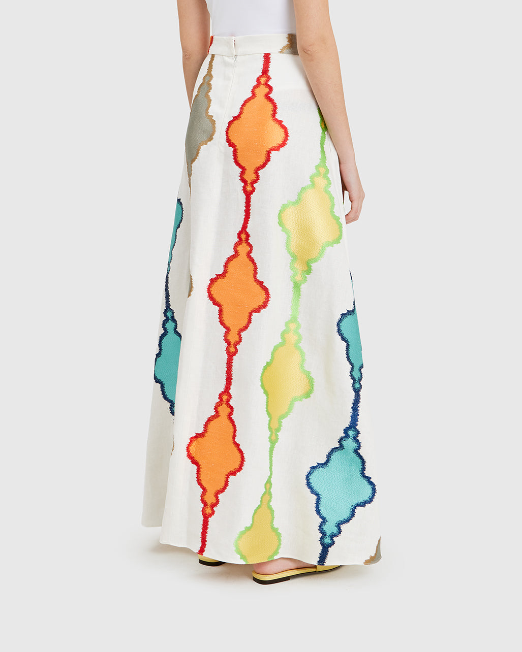 This white linen A-line skirt moves with exceptional fluidity, catching glances with every step. Its multicolored motifs bring a sense of joyful movement, as if the fabric had gathered stories from every place it’s been. A piece made to roam: light, vivid, and endlessly open.