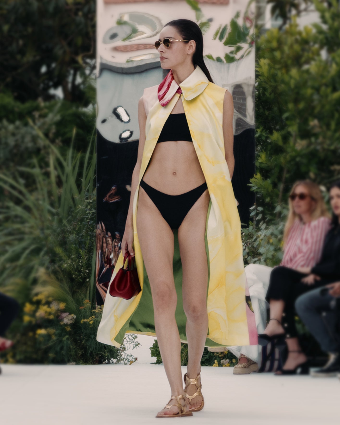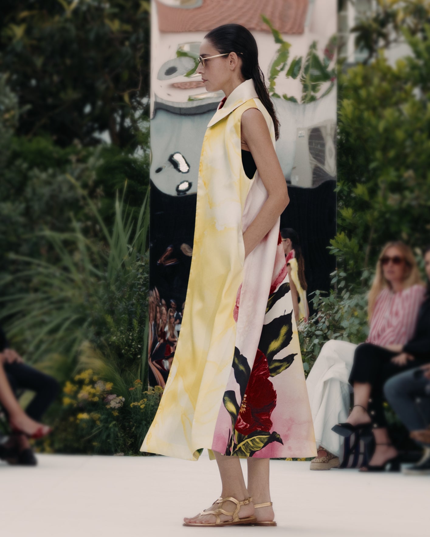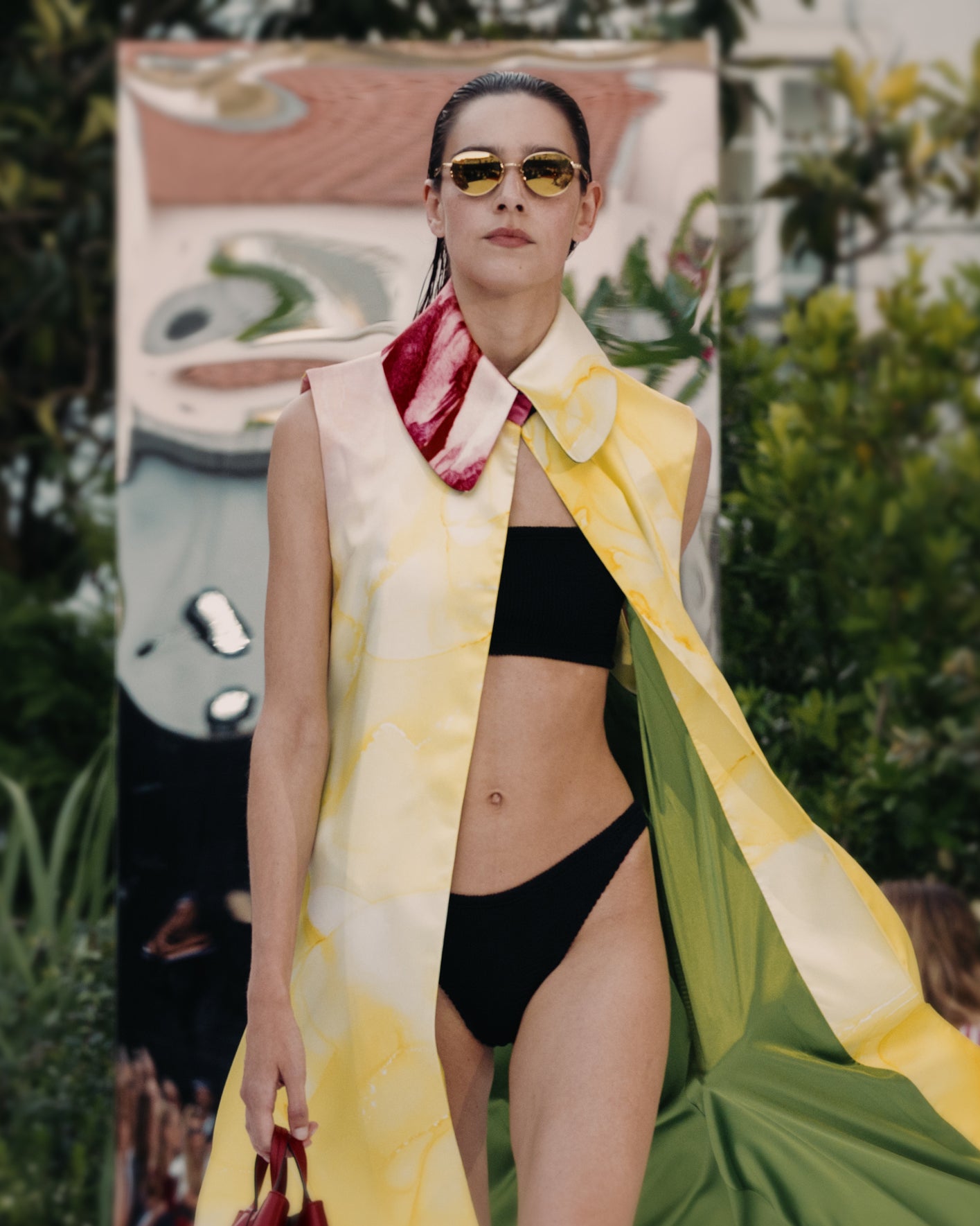 This tailored vest flows gently, with generous lapels and a light, easy shape. Its palette blends yellow, rose and red in a sun-washed, calming harmony. Fully lined in fresh green, it’s made to move, to brighten, and to stay close like a warm feeling that lingers.