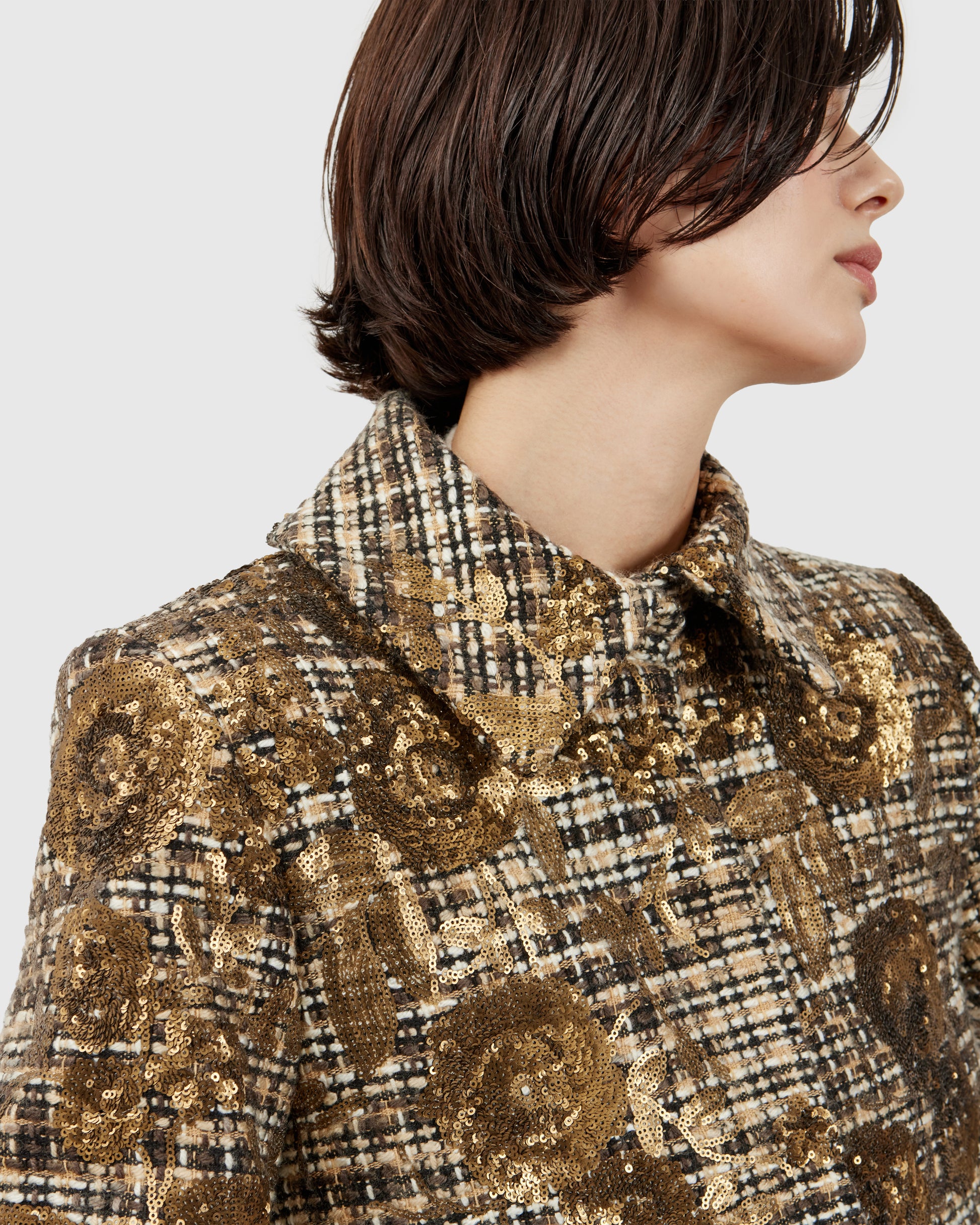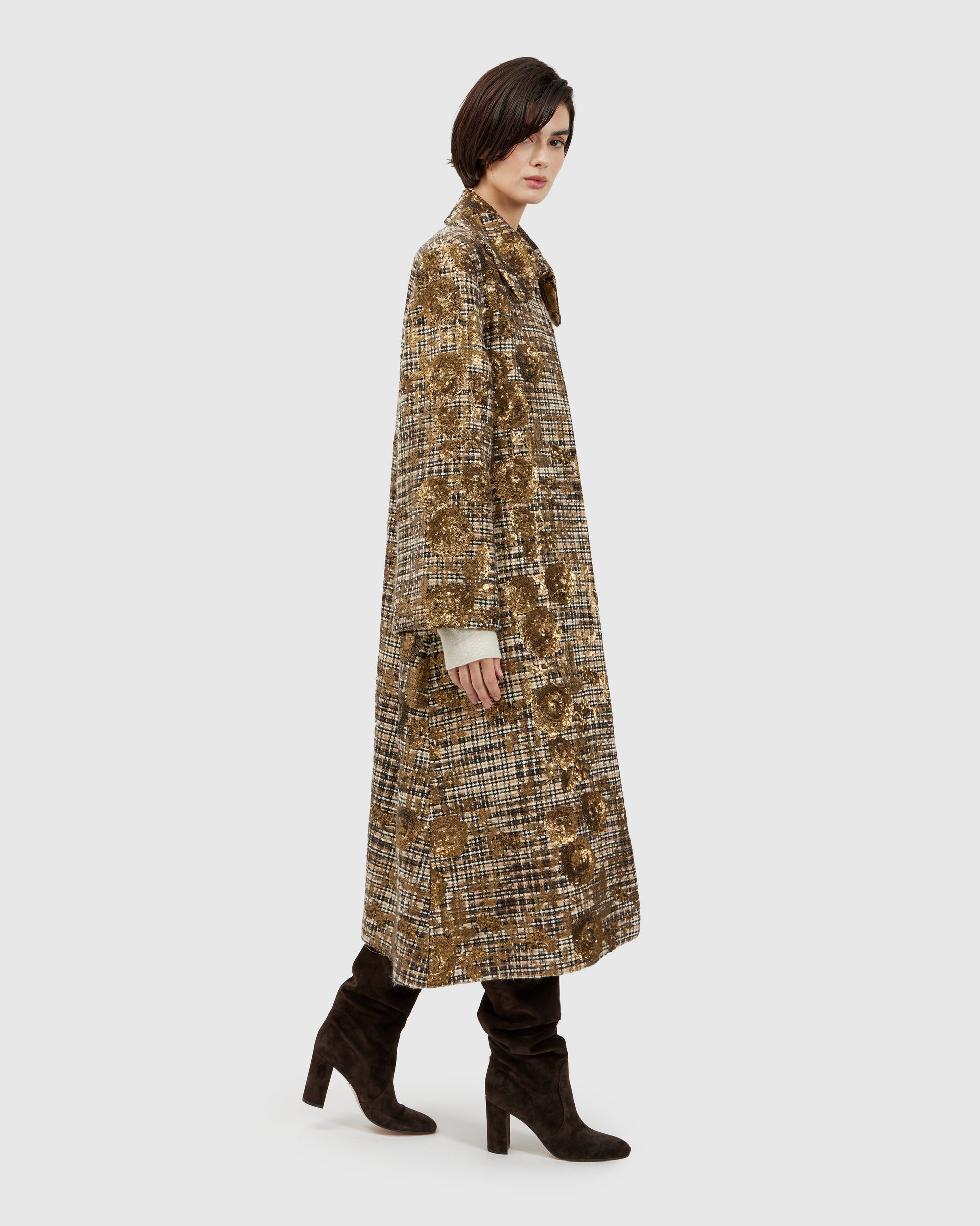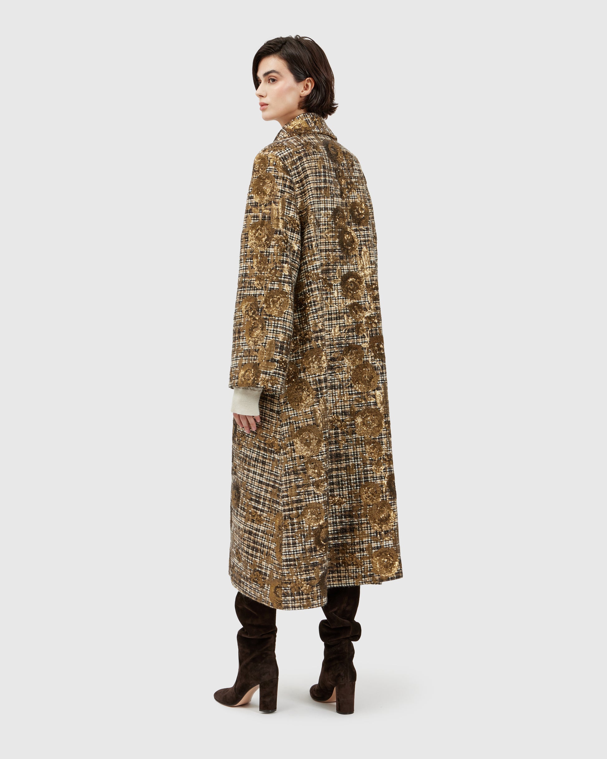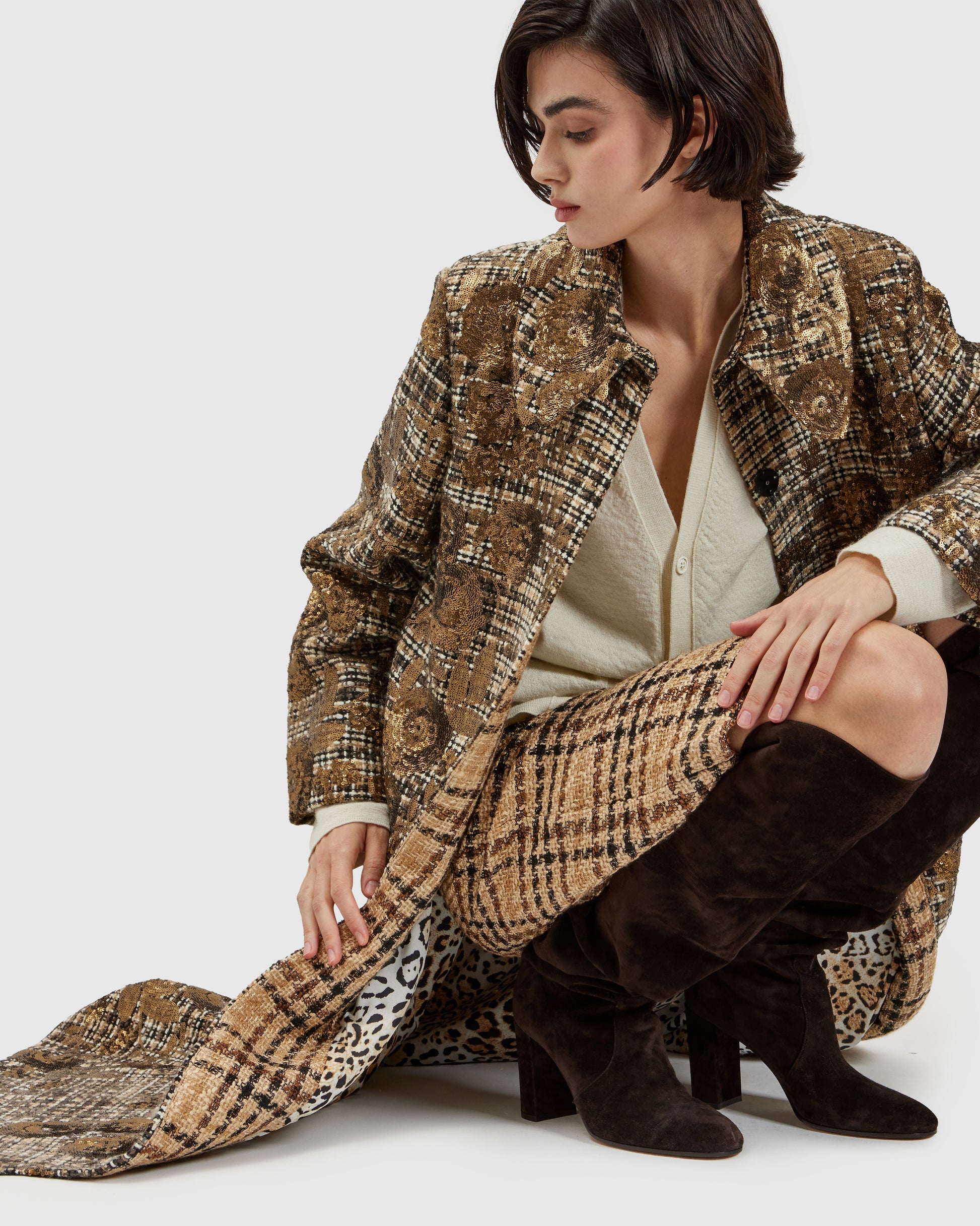 Aureline blends caramel, pearl and black into a single tweed duster.