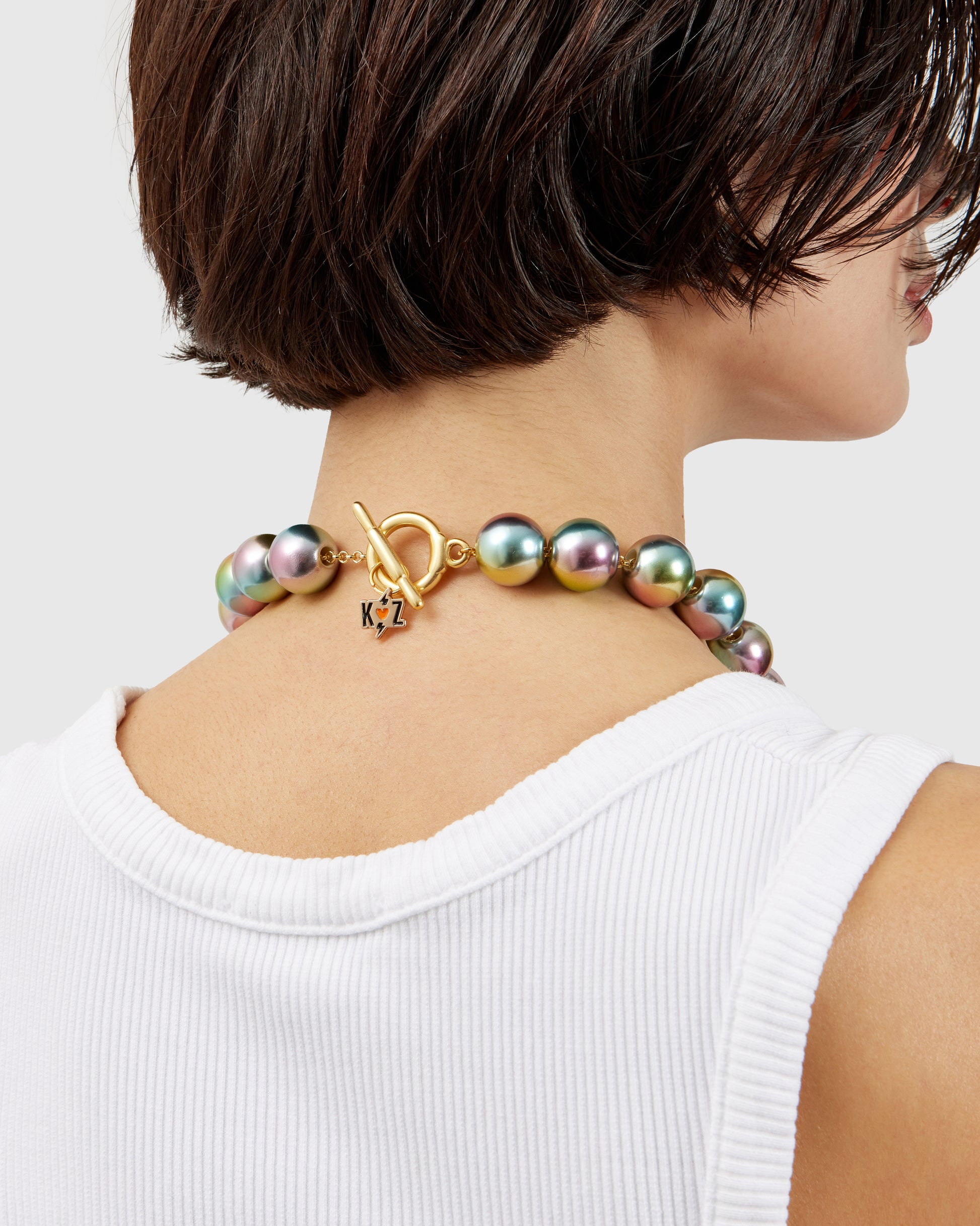 A delicate necklace with a metallic rainbow sheen that shifts with every movement, catching the light in endless reflections. Lightweight and flexible, it adapts effortlessly to any outfit, adding a glow that is both subtle and striking.