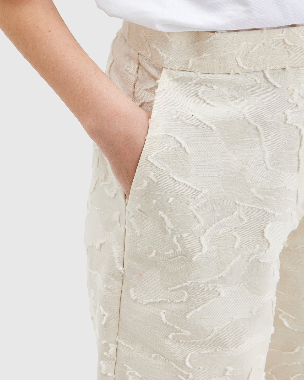 These sculpted white shorts features a textured surface of scale-like forms that shift gently with the light. Worn with its matching vests and jackets, it becomes a tailored ensemble with subtle edge and versatility.
