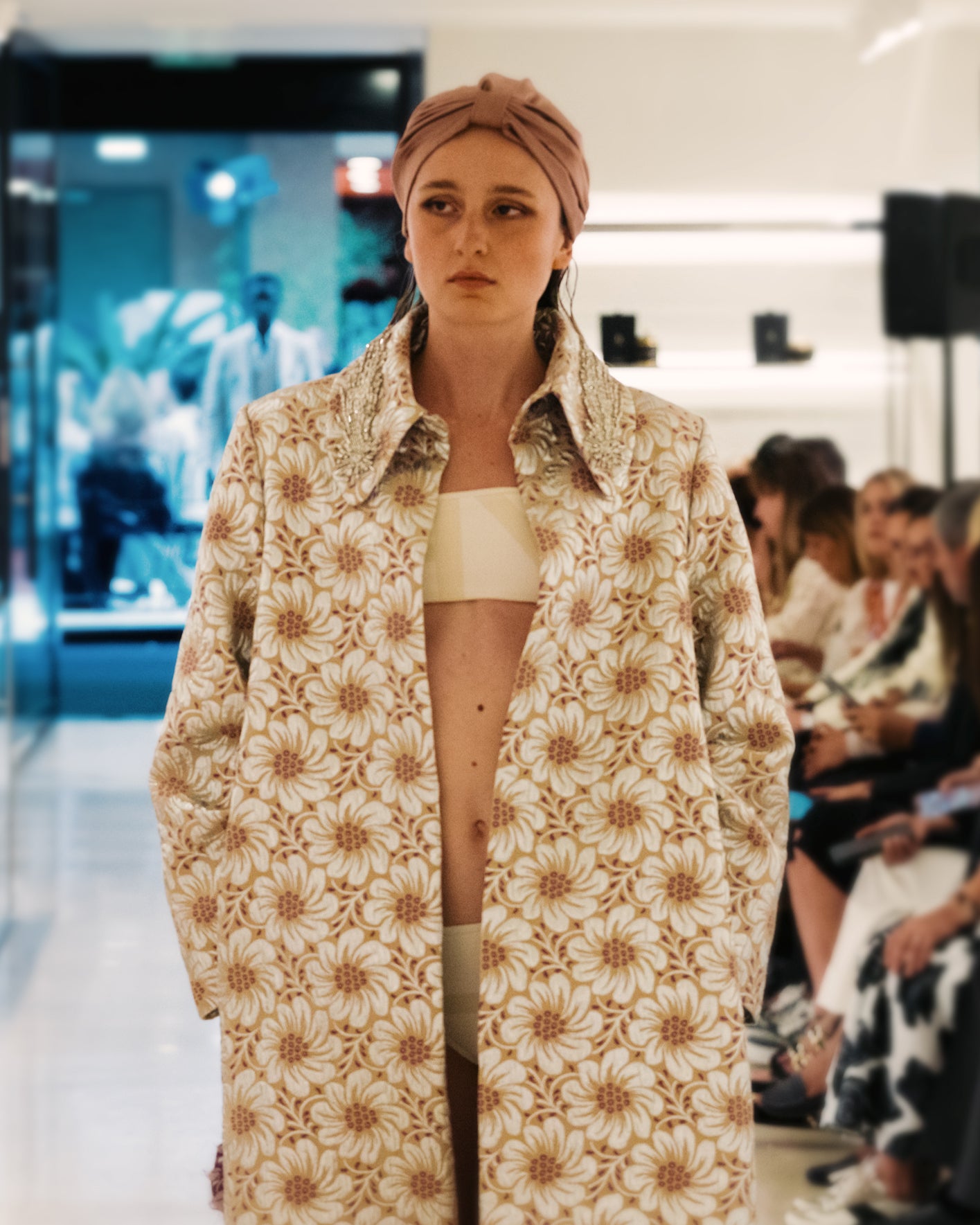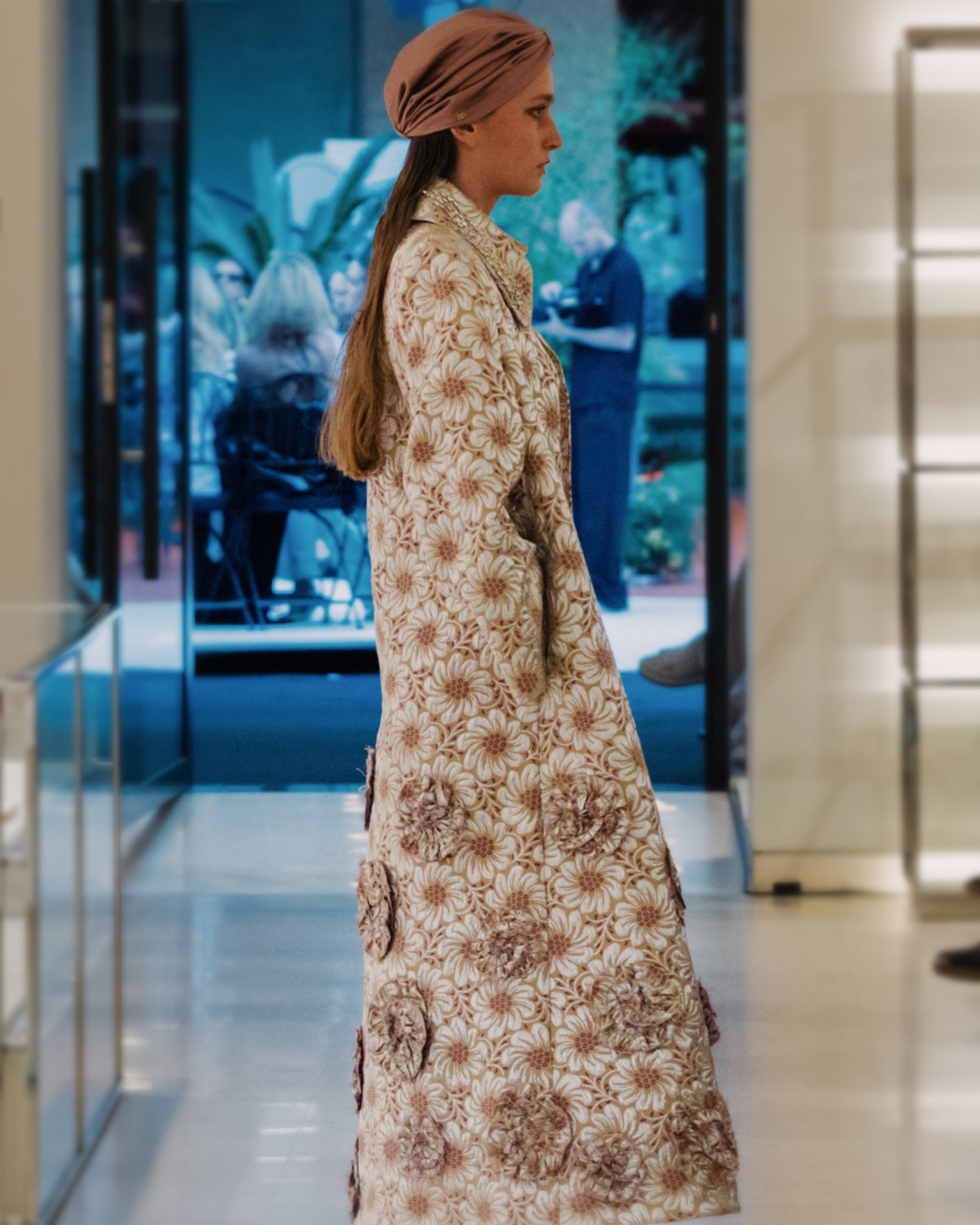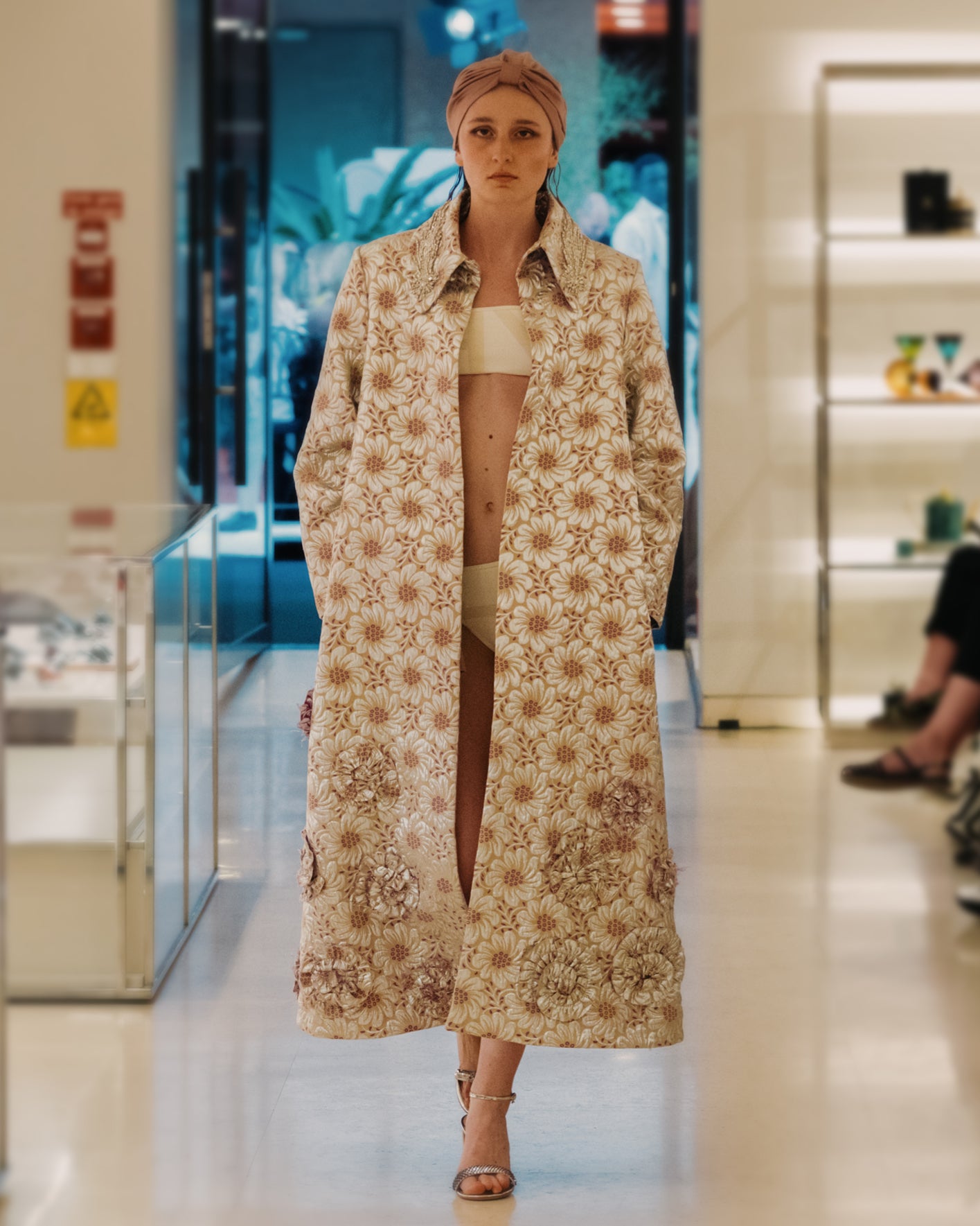 Covered in silver florals, this duster catches the eye through detail: comet-shaped crystal appliqués brighten the collar, while embroidered flowers bloom near the hem. A piece that dances with movement and light, in a graceful way. Refined, radiant, and hard to forget.