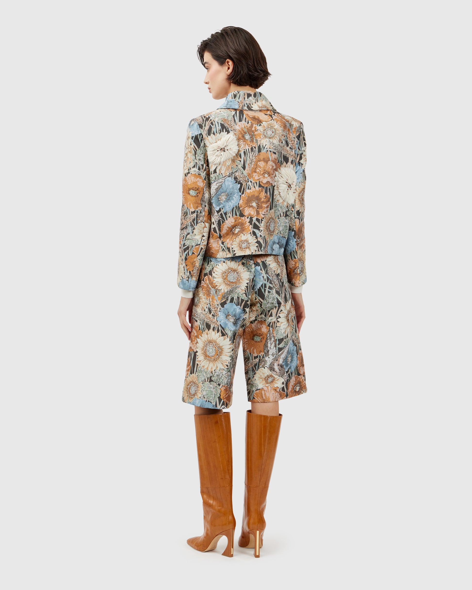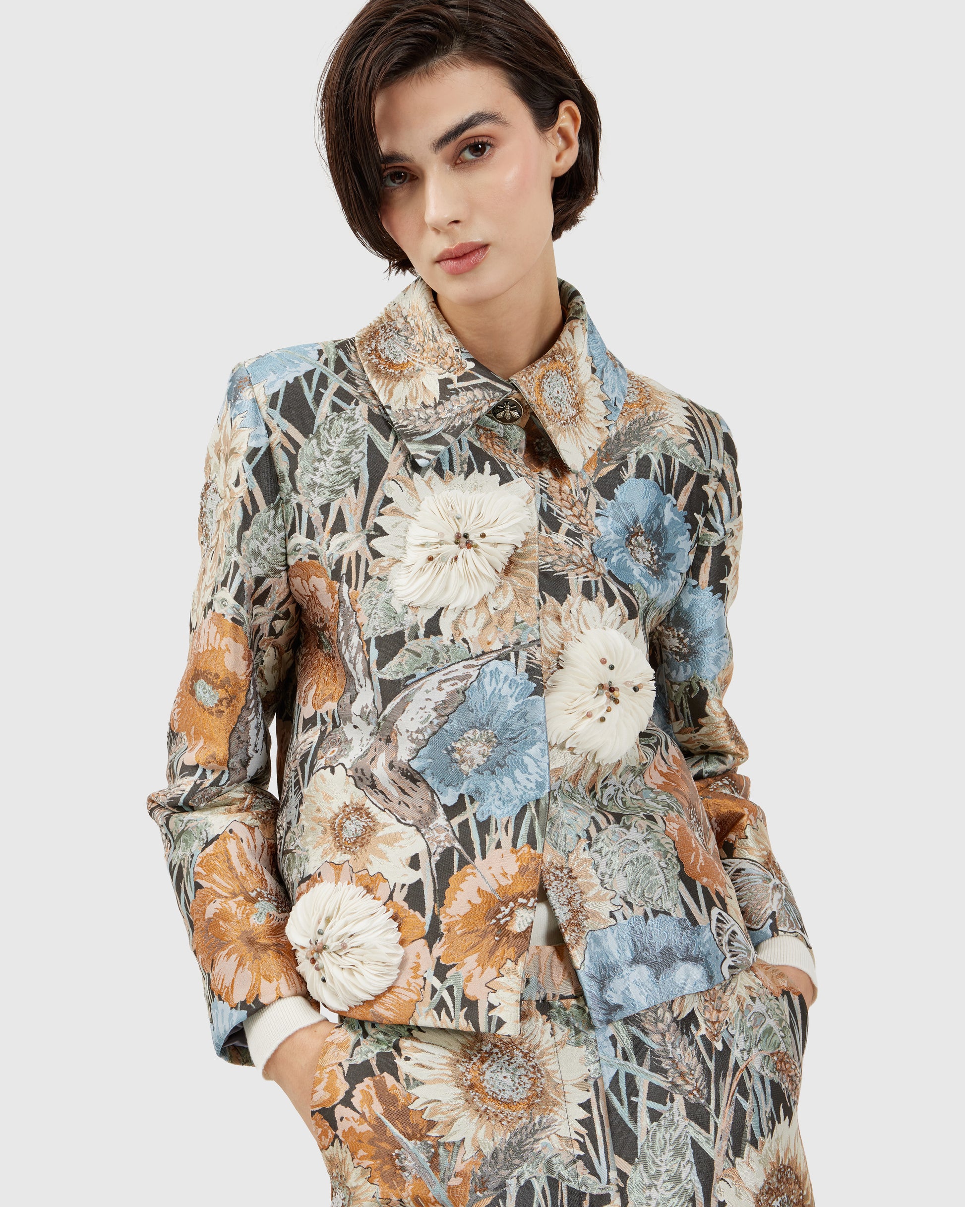 These two cropped jackets bring the garden to life. One is a meadow of daisies, dahlias and other blooms, with 3D organza flowers dotted with polished beads in shades of grey, earth, beige and pearl. The other is an imperial garden, rich with gilded appliqués on the collar, back and shoulder. Both complete the look when paired with tailored shorts.