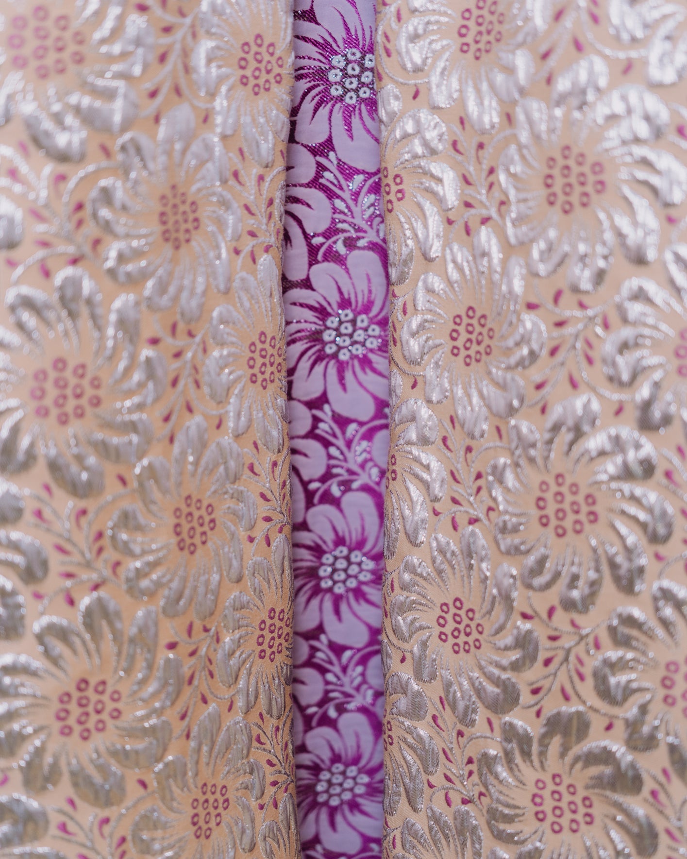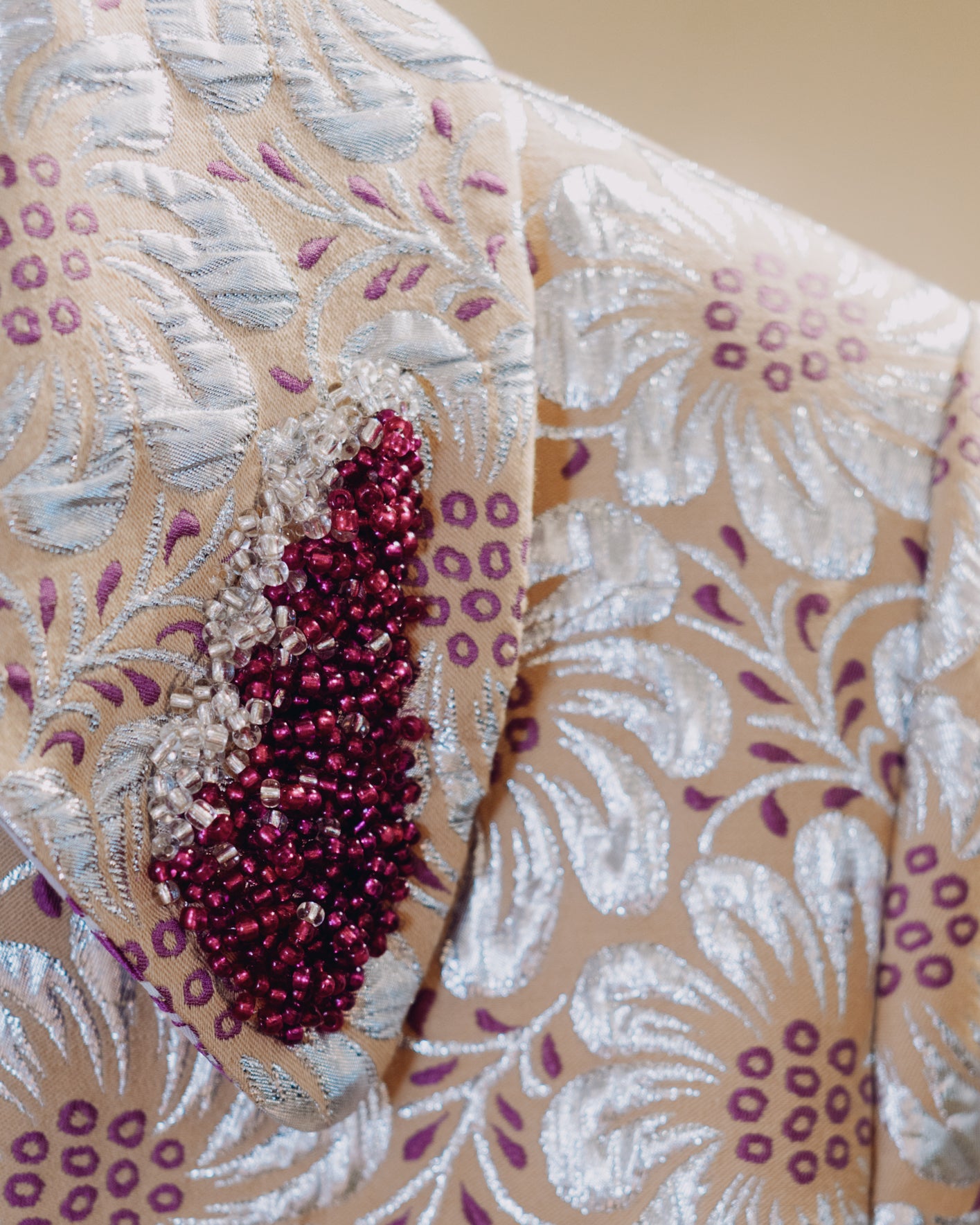 This silver-floral duster flows like shimmering morning mist. The only embellishment appears at the collar: red embroidery and beading that glow gently against the cool fabric. Fully lined in deep violet, it reveals its depth in motion — layered, composed, and unexpected.