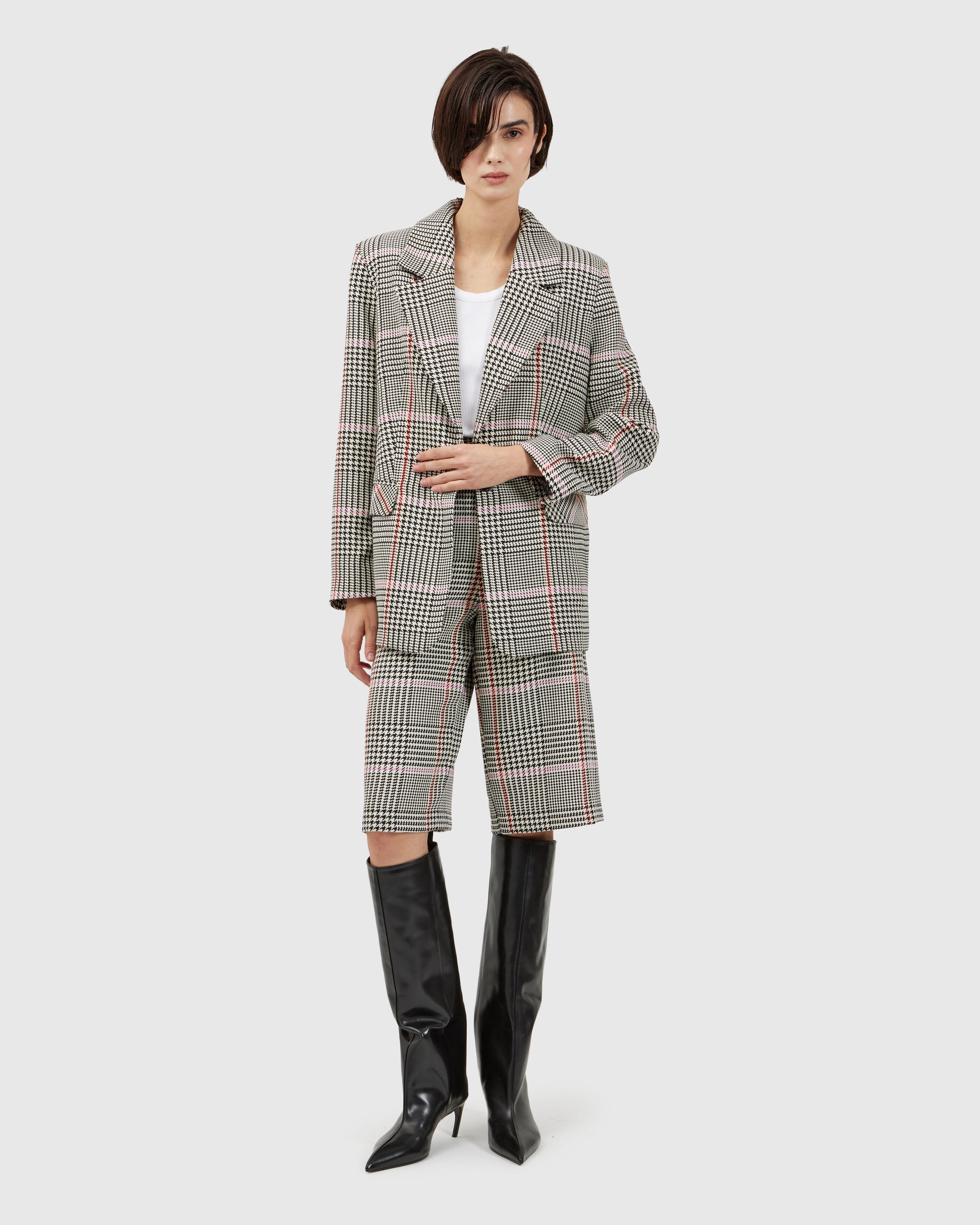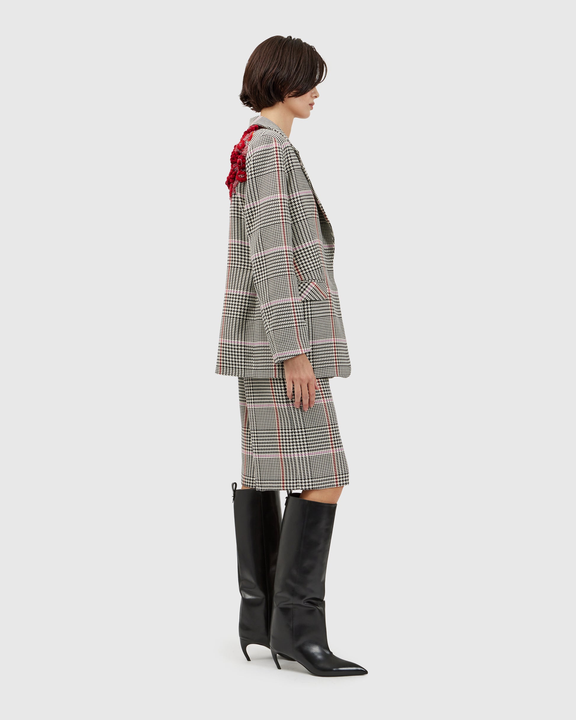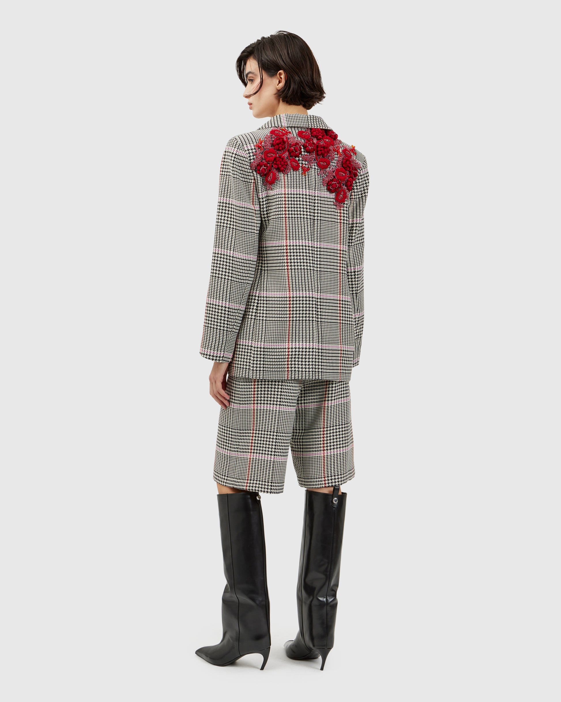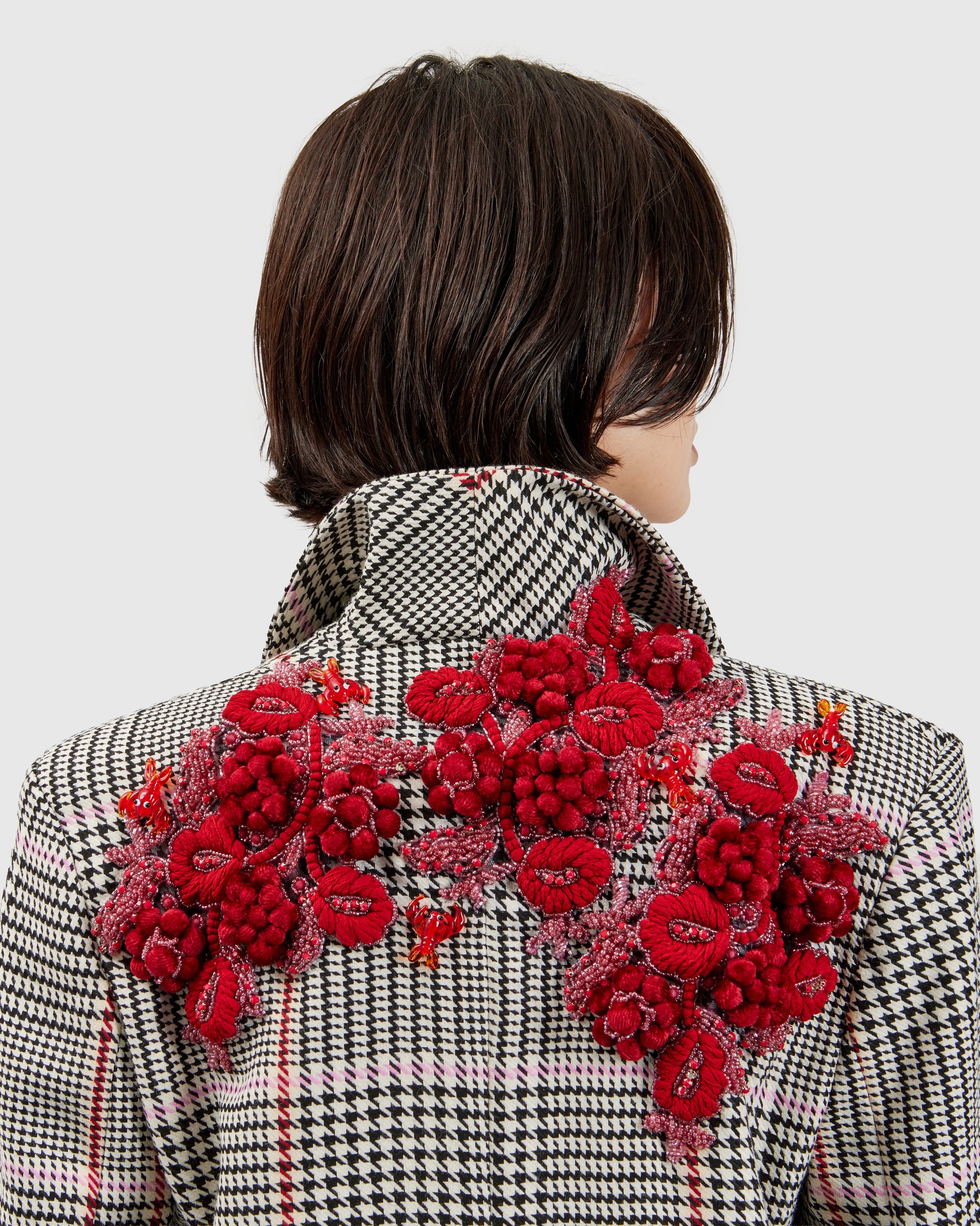A white blazer provides the canvas for a cascade of red lobster appliqués, clustered into a dramatic, sculptural ensemble. Each tiny lobster seems to swim across the fabric as the wearer moves. Matching shorts echo the same fabric and motif, completing the playful, whimsical look.