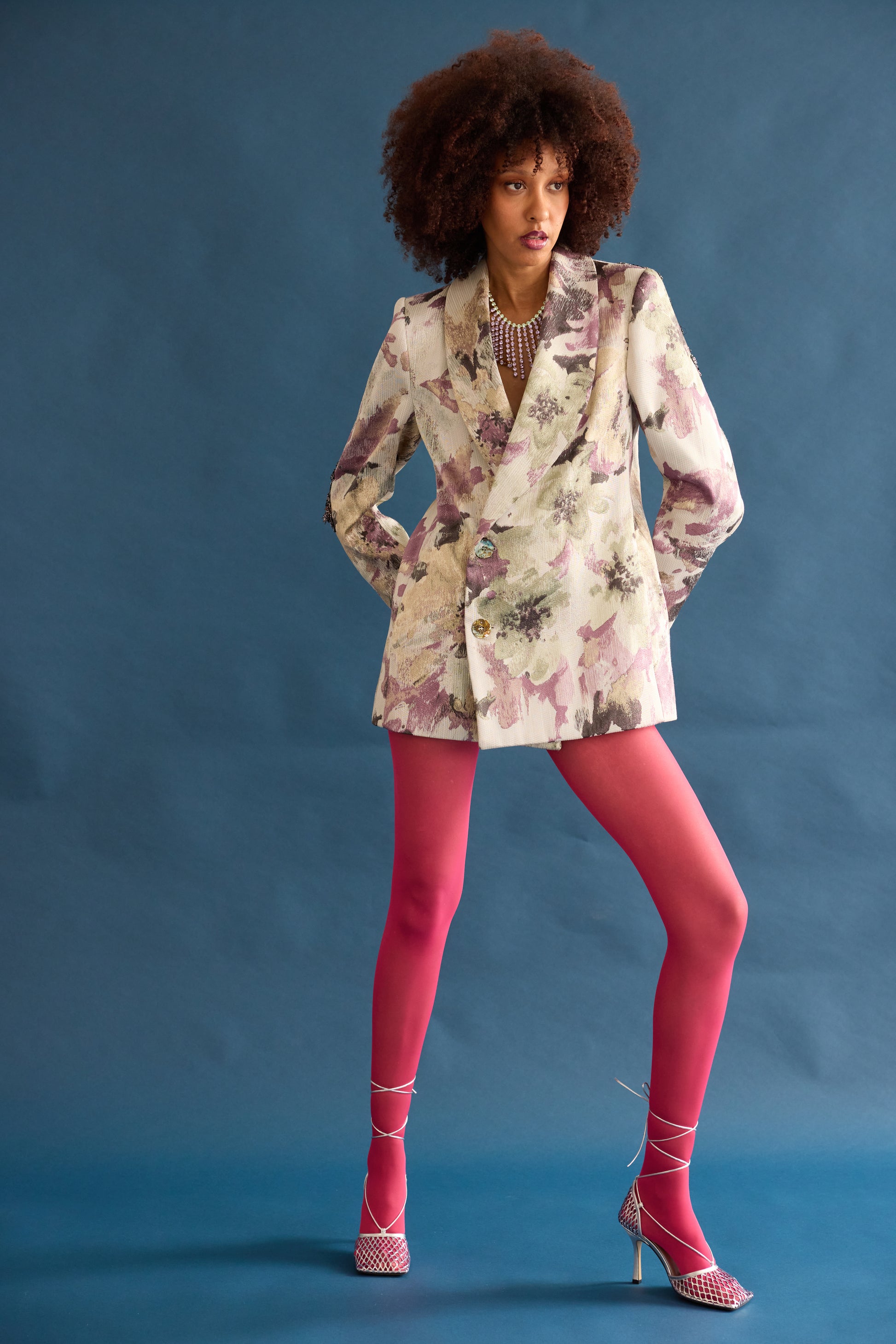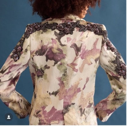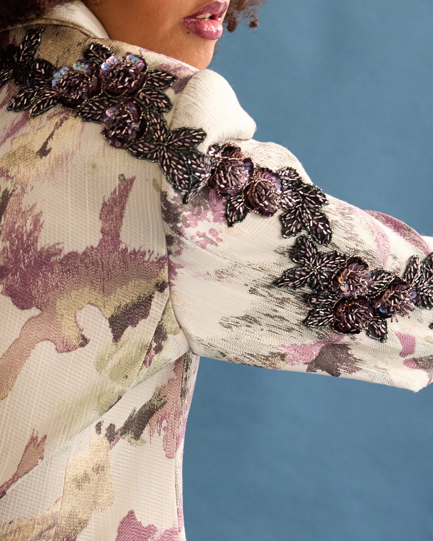 This blazer features strokes of color on a white canvas, creating an organic and sophisticated blend of green and violet shades. Flowing across the back and arms, the design showcases exquisite craftsmanship, evoking a sense of movement, like wild vines reclaiming untouched landscapes.