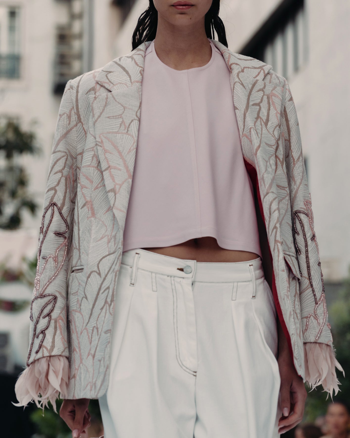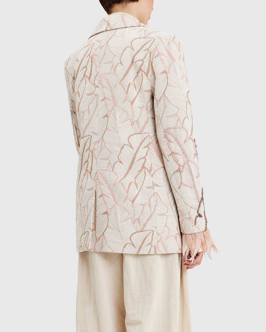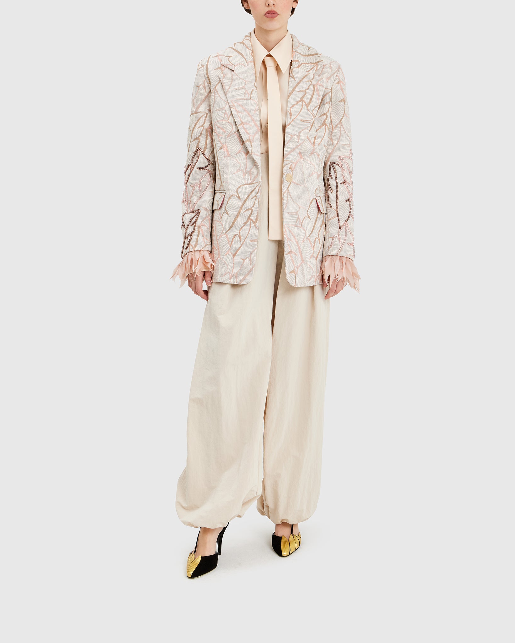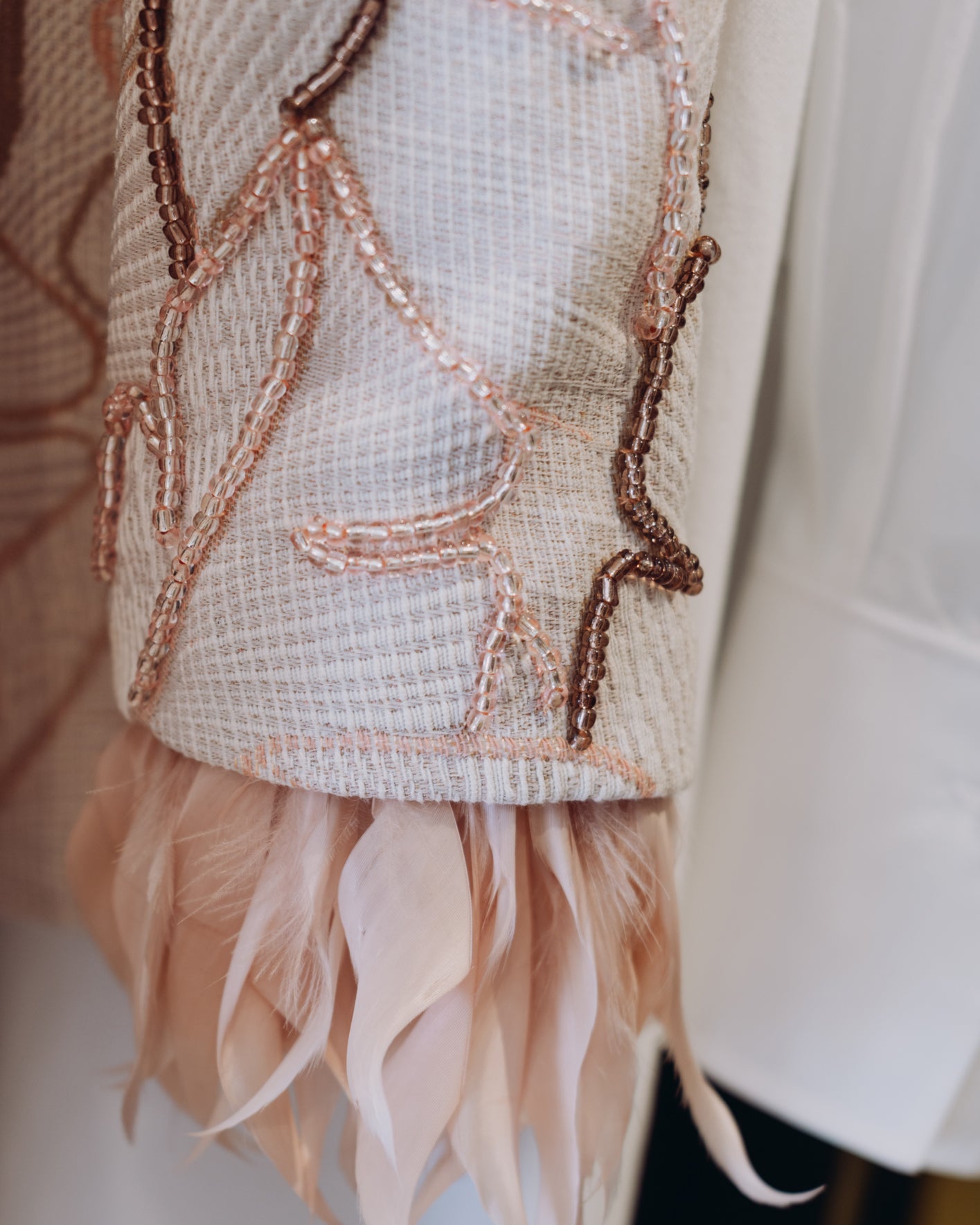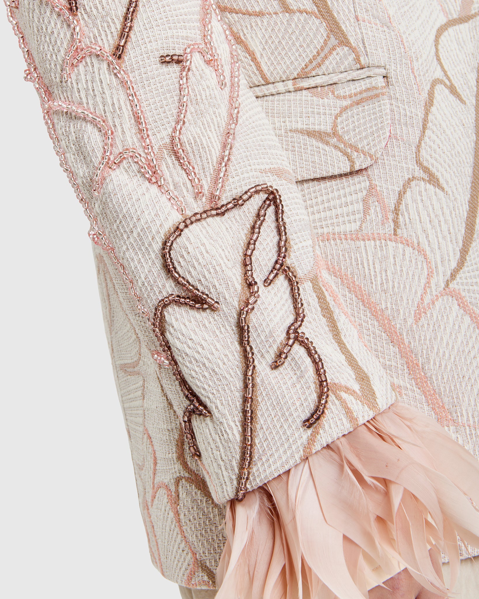 This off white/light pink blazer is traced with delicate leaf motifs in rose tones, as if nature itself had left a mark. Beaded accents bring subtle texture to the sleeves, while the removable feather trims add a final touch of movement. Inside, a strawberry-pink lining offers an unexpected warmth beneath its crisp, white surface.