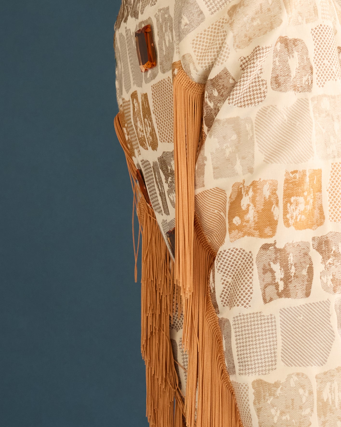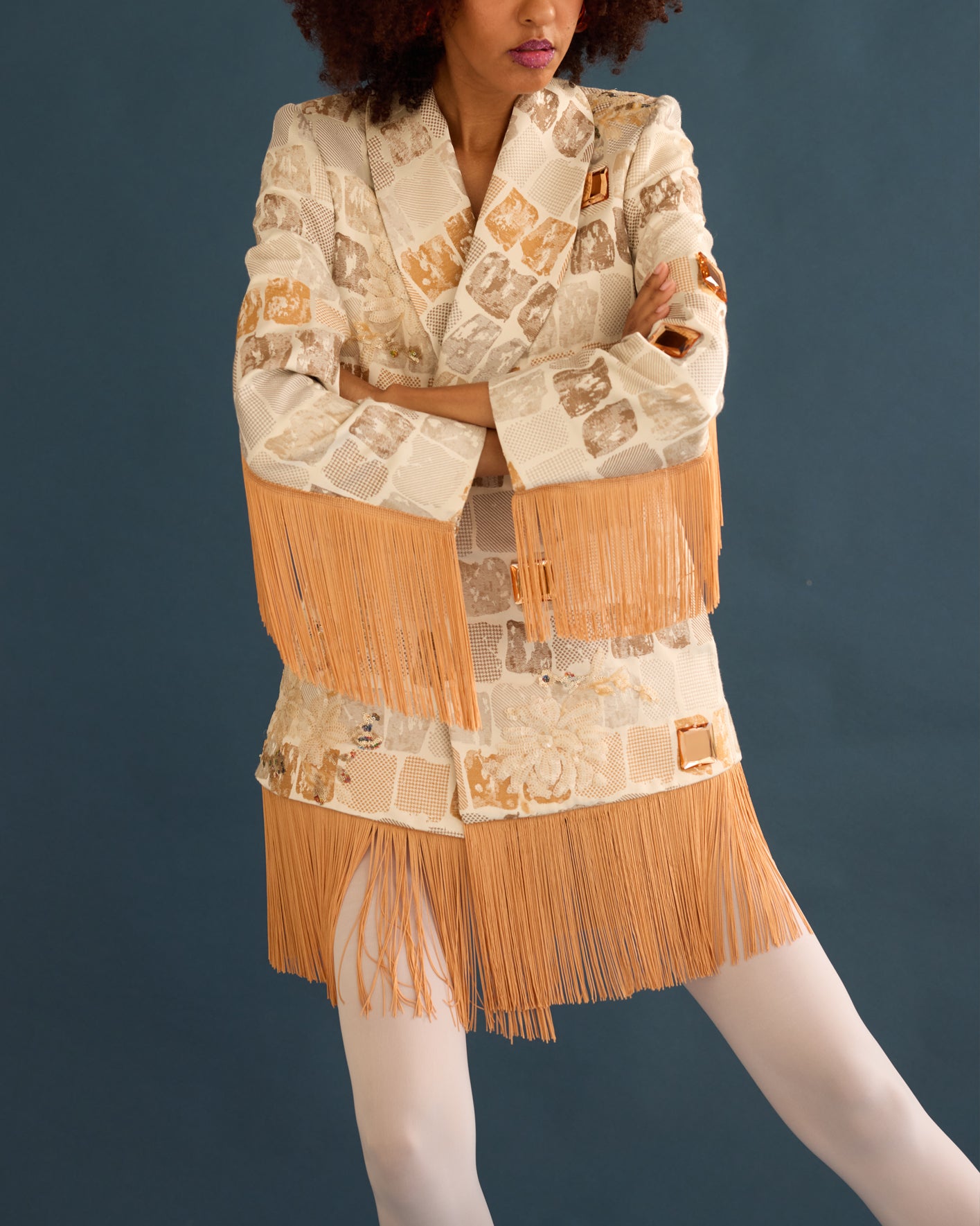 Large square bead applications create a striking pattern across its surface, while flowing fringes on the sleeves and hem add rhythm and grace, evoking the spirit of the 1920s. The blend of bold shapes and gentle movement makes this piece a confident statement.