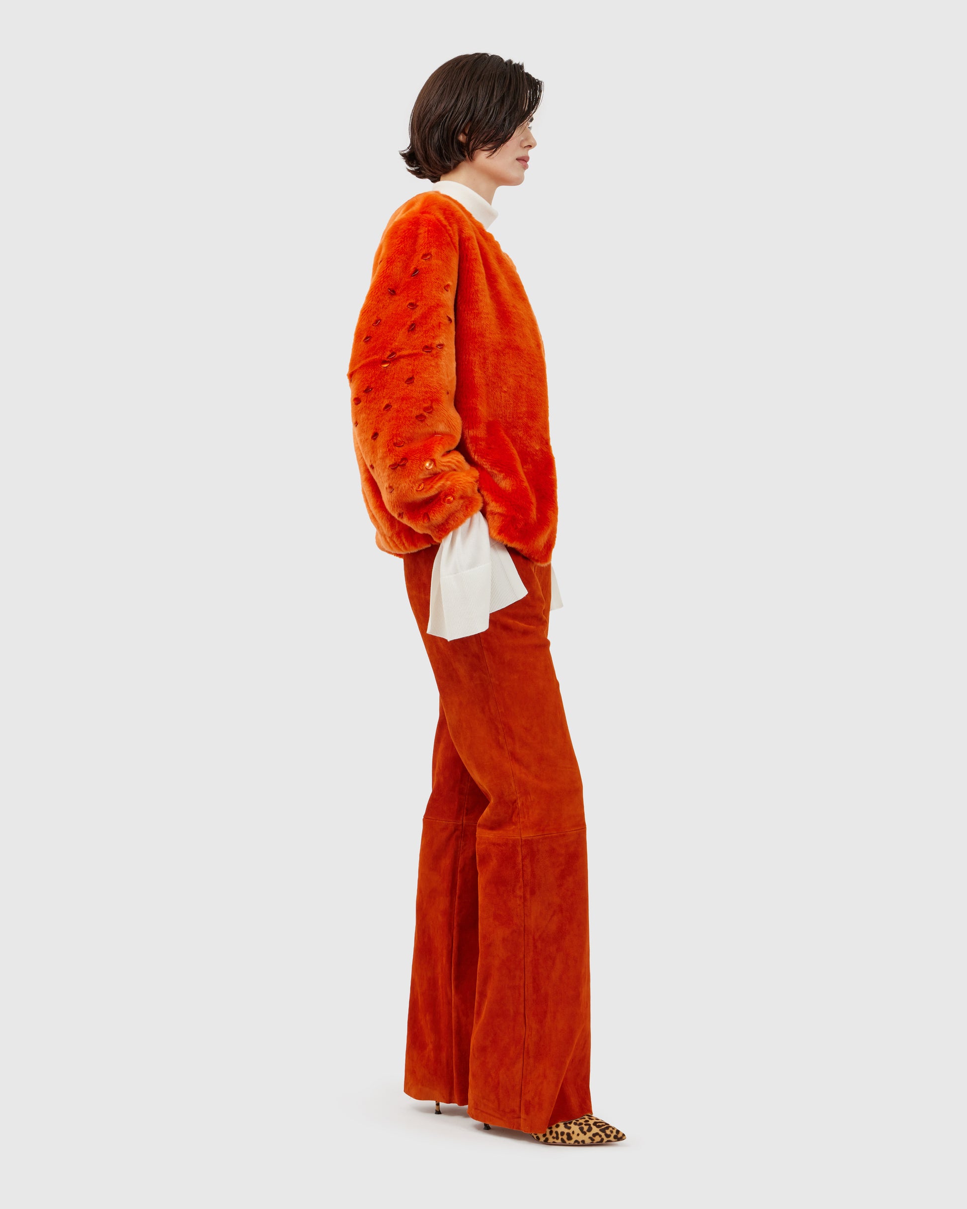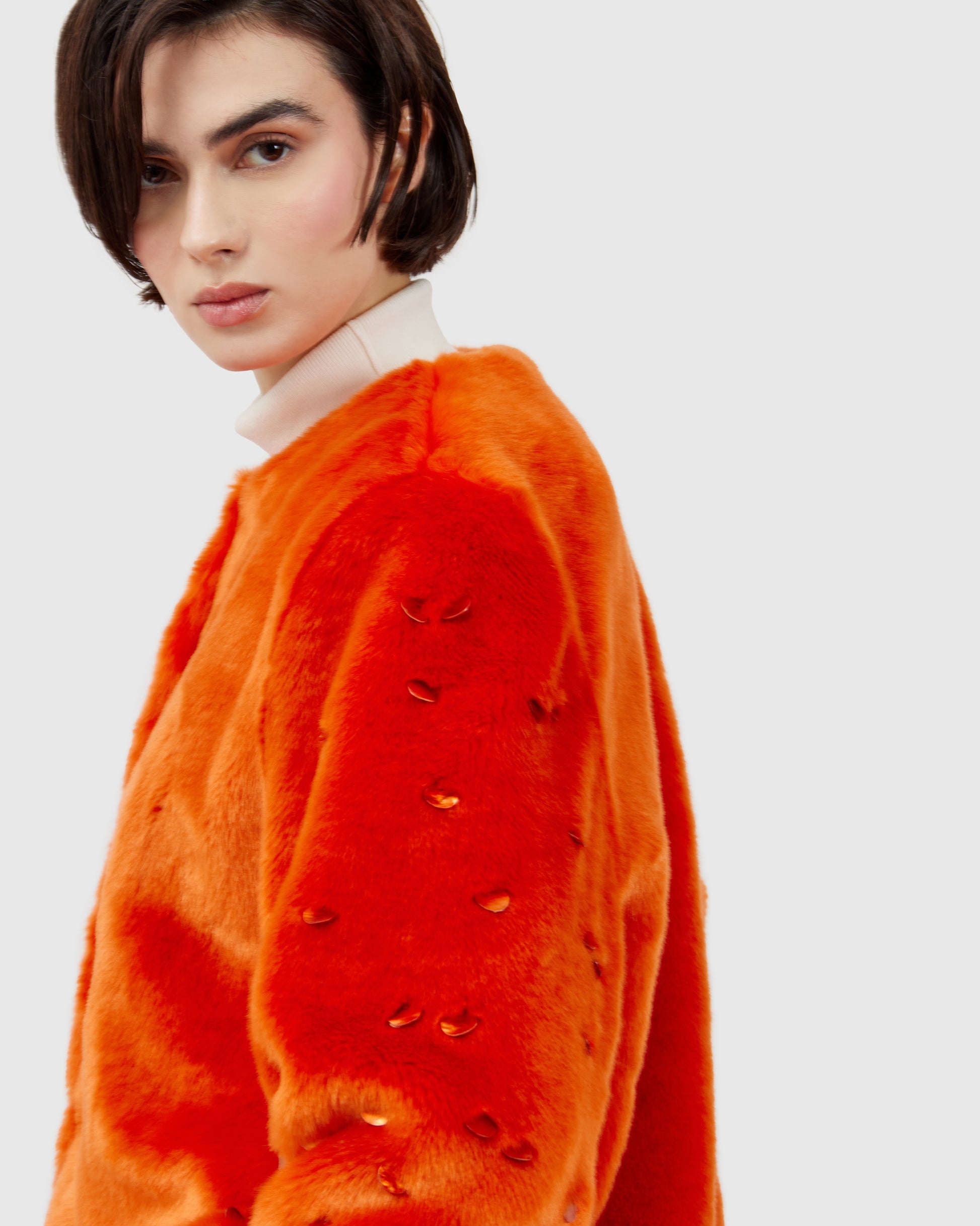 This vivid orange cropped jacket, crafted in soft fur, radiates an immediate warmth that transcends generations. Along the sleeves, orange mother-of-pearl appliqués rise from the surface, giving the piece a sculpted, three-dimensional effect. It stands somewhere between flare and form, full of emotion.