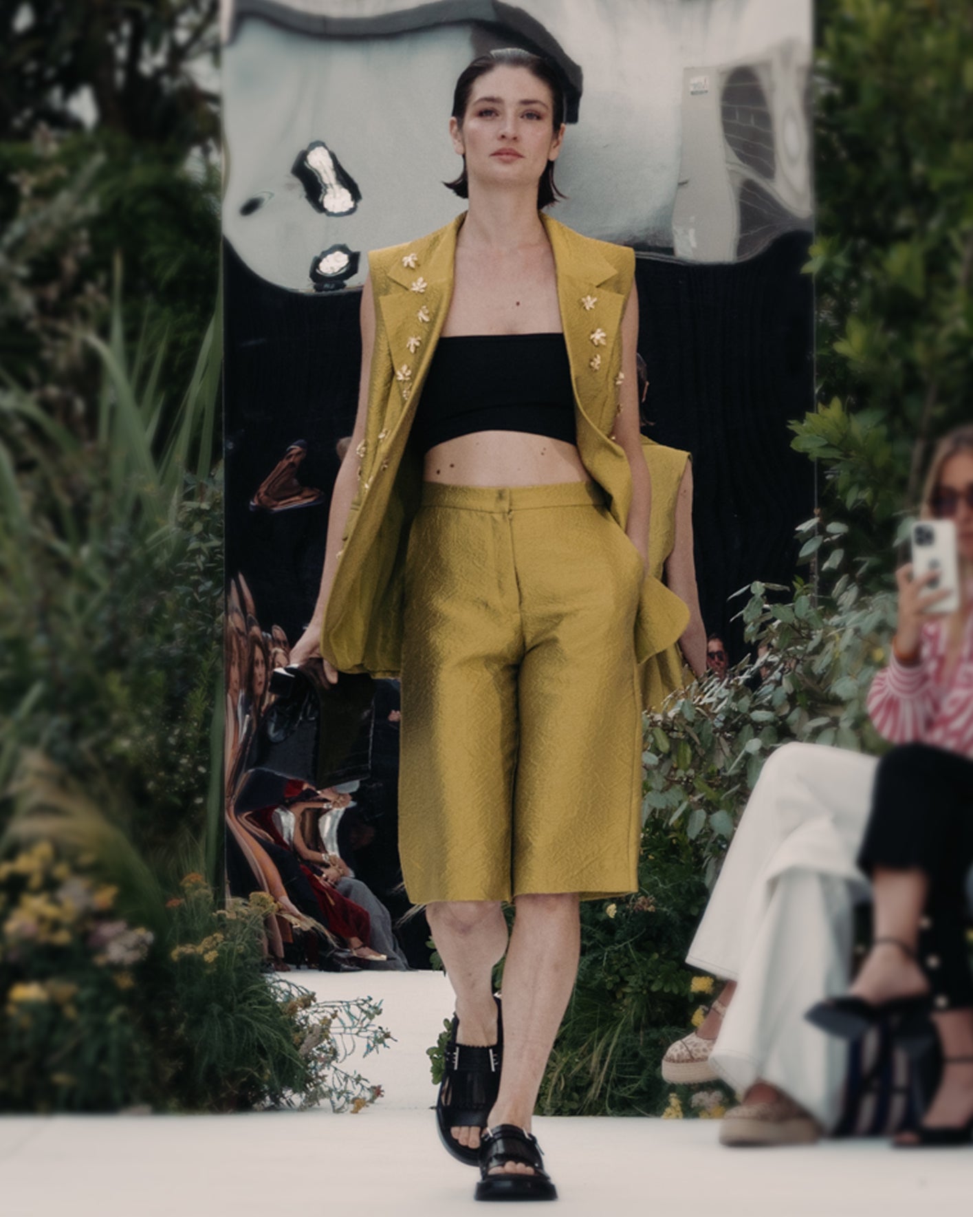 This tailored vest and matching shorts come in a soft mustard-green hue, delicately adorned with small golden metallic leaves that catch the light. The shorts can be worn separately or as a set, offering versatility for any occasion. Designed to shimmer quietly or stand out when you choose.