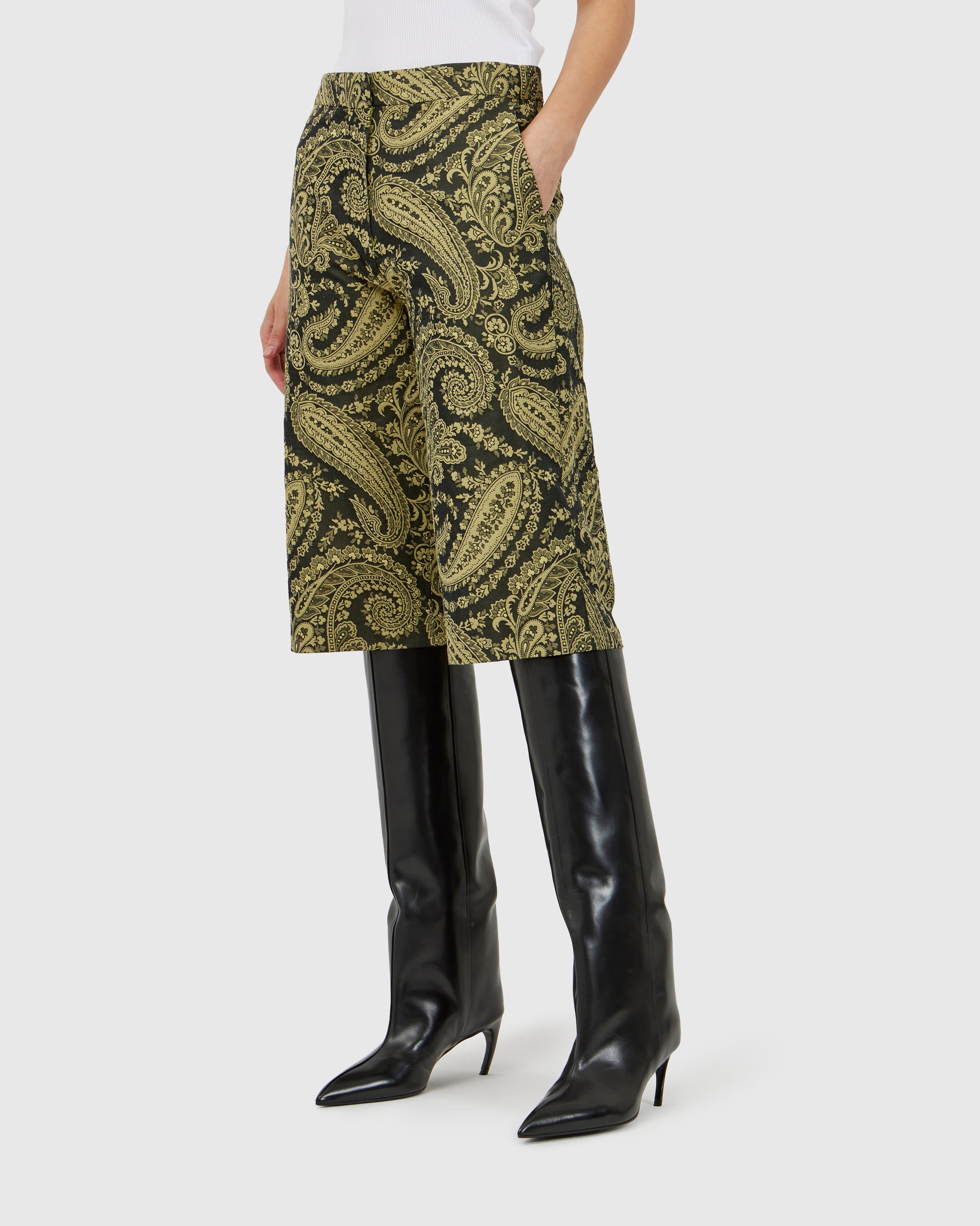 These tailored black shorts are adorned with organic shapes and intricate citrus-hued florals. This is a set that balances sharpness with delicacy.