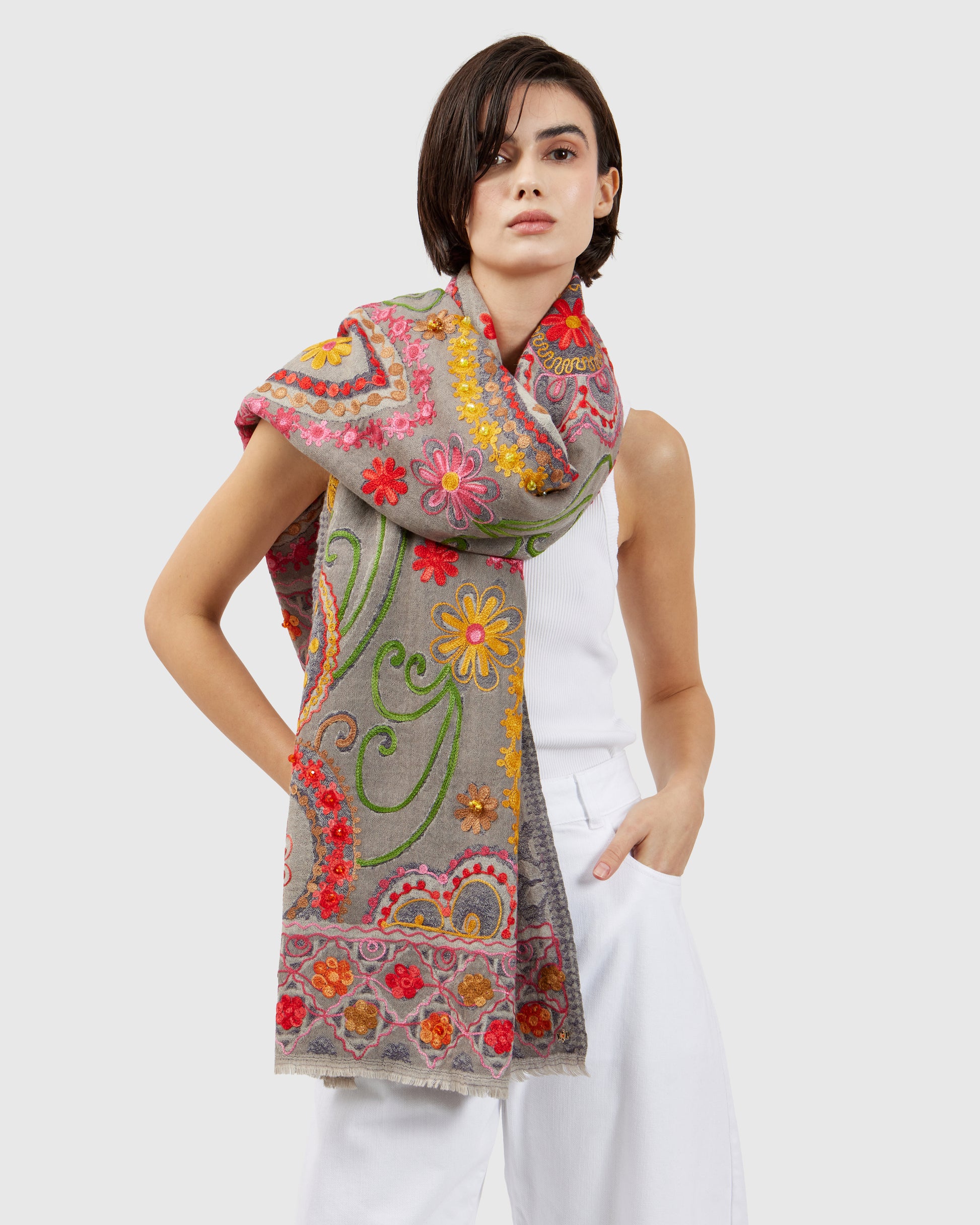 These embroidered scarves trace delicate vegetal motifs, evoking the rich heritage of Portuguese needlework. Each stitch and pattern plays with texture and color, while the beadwork adds bold, three-dimensional relief. They carry a quiet elegance, a nod to history reimagined for the modern wardrobe.