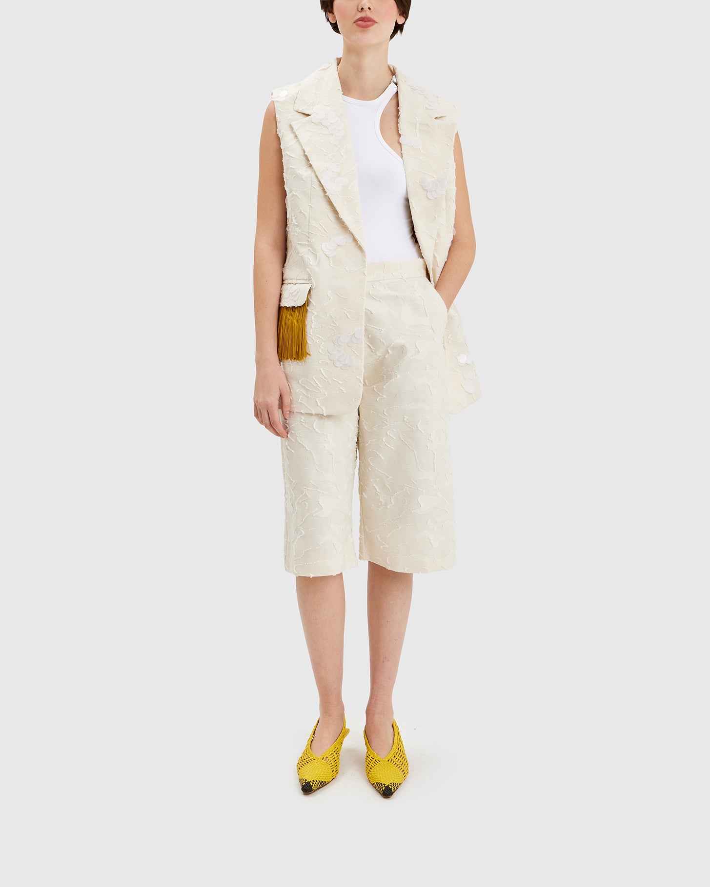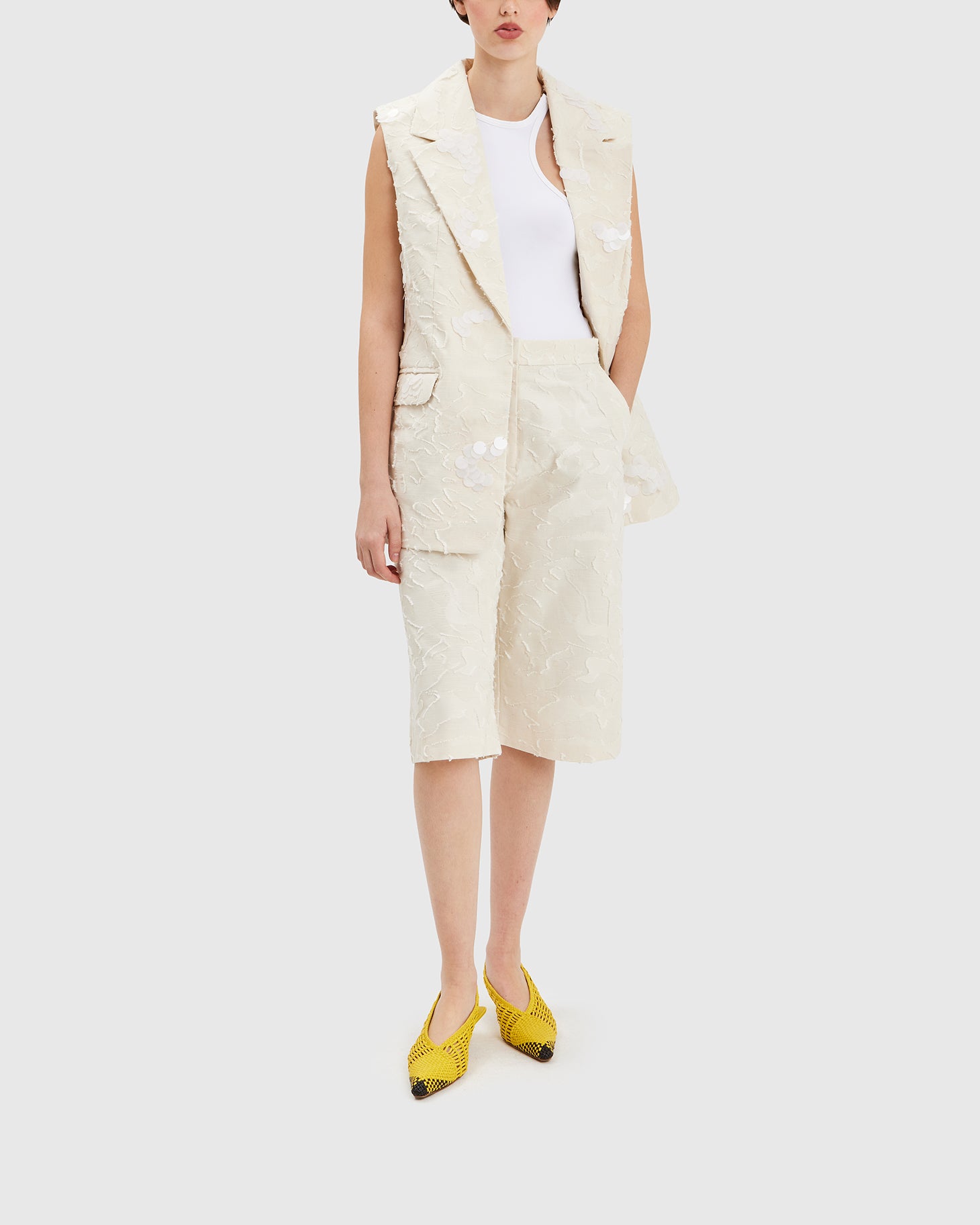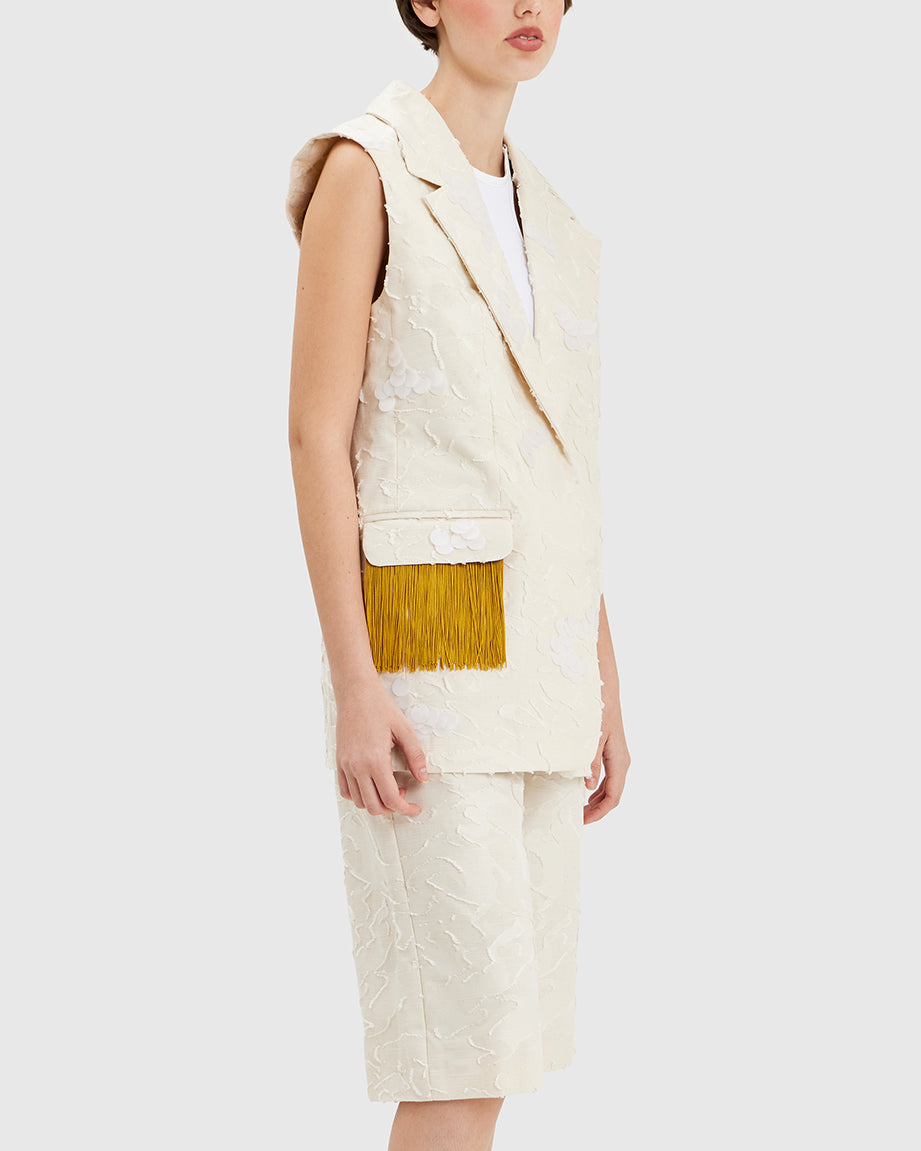 This sculpted white vest features a textured surface of scale-like forms that shift gently with the light. At the pocket, removable fringes add a sense of rhythm and play. Worn with its matching shorts, it becomes a tailored ensemble with subtle edge and versatility.