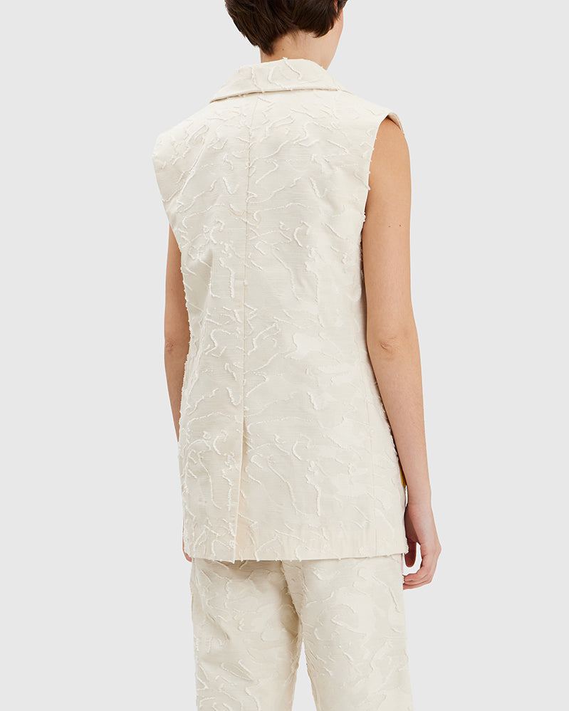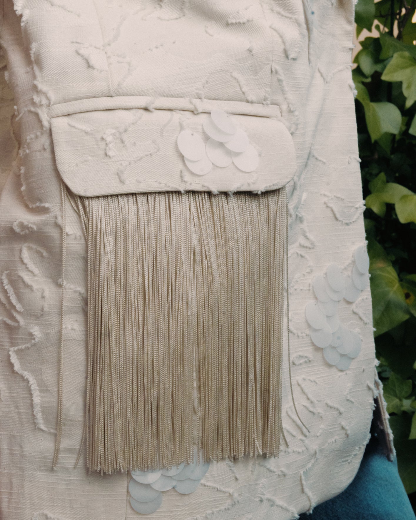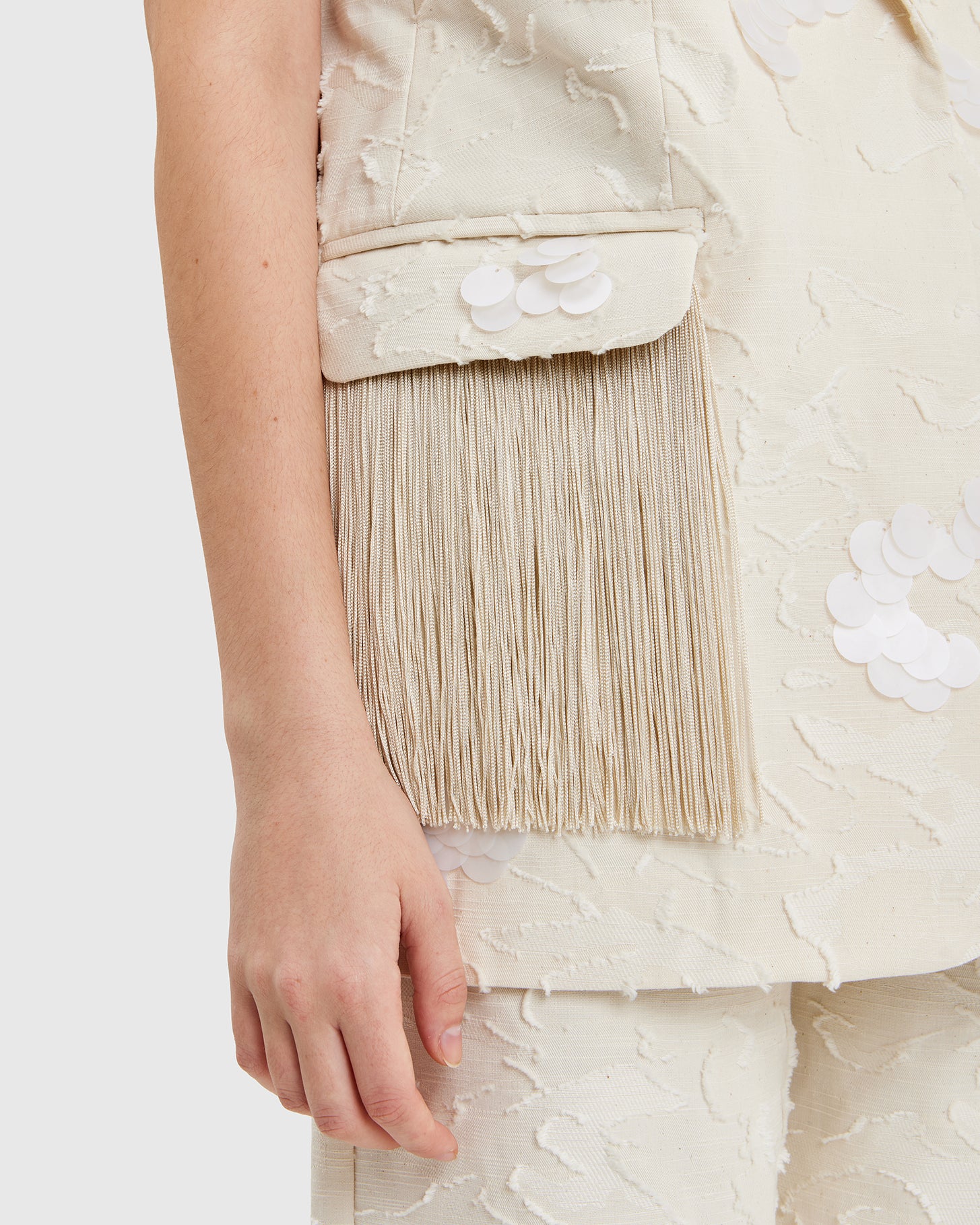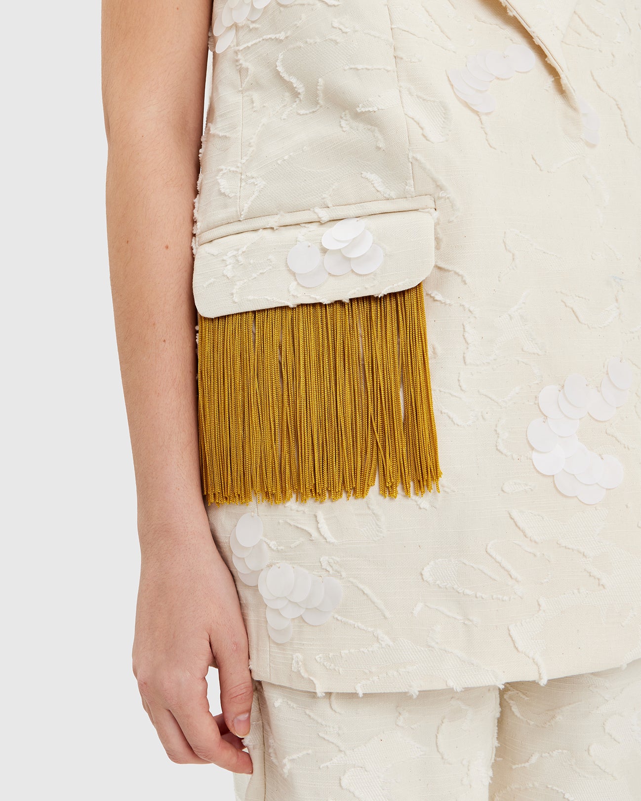 This sculpted white vest features a textured surface of scale-like forms that shift gently with the light. At the pocket, removable fringes add a sense of rhythm and play. Worn with its matching shorts, it becomes a tailored ensemble with subtle edge and versatility.