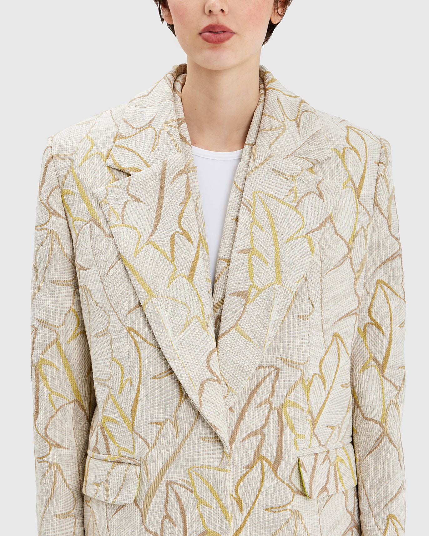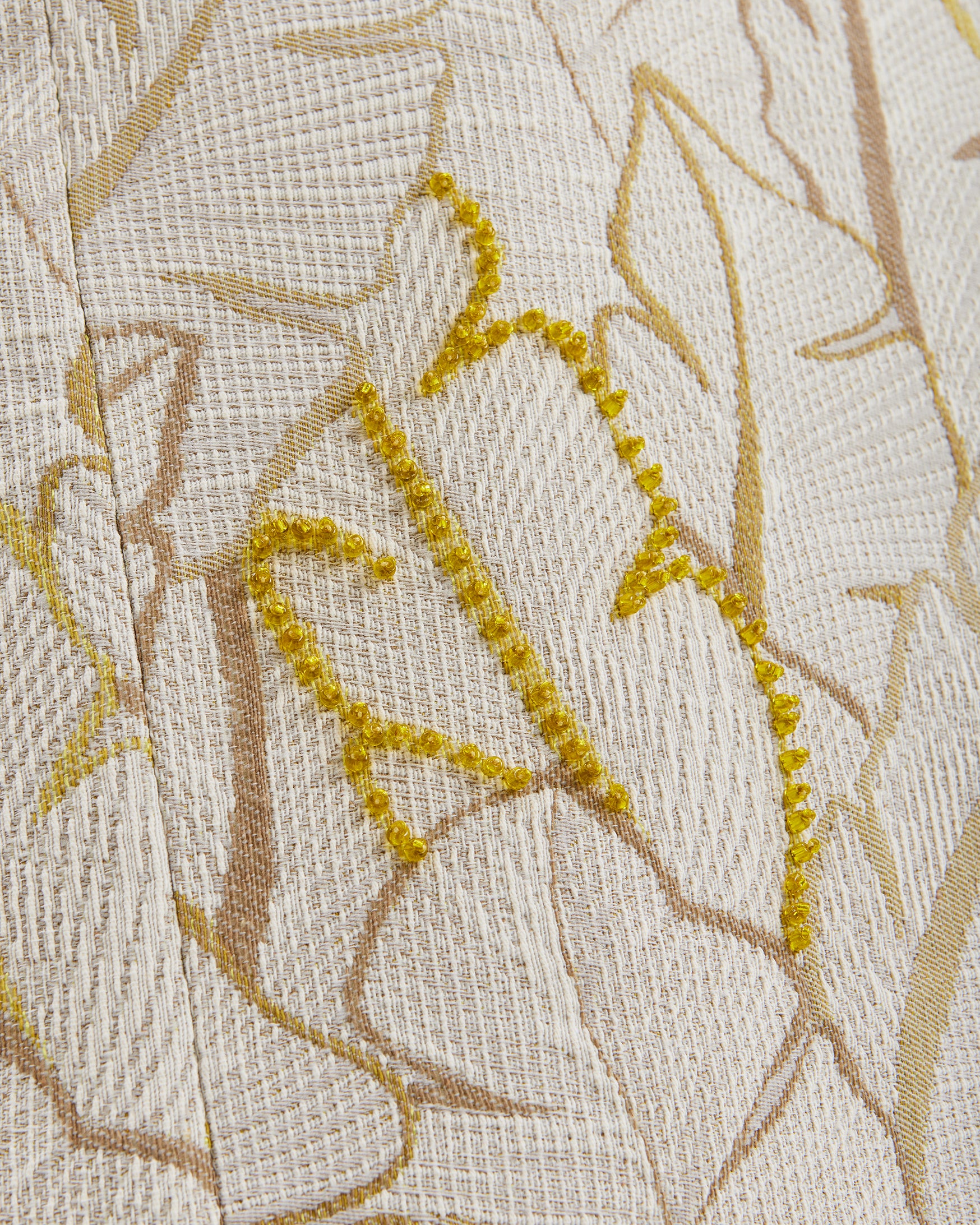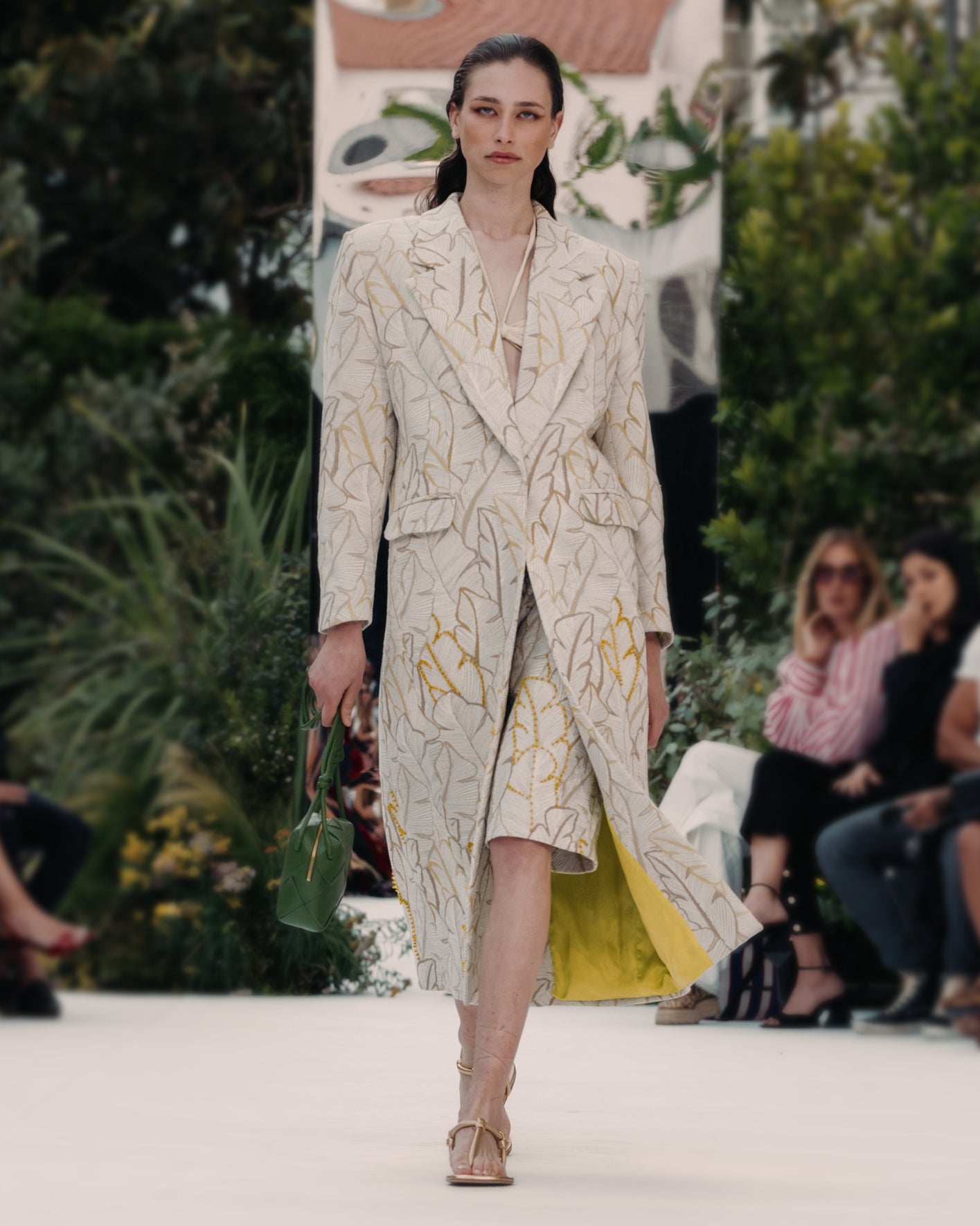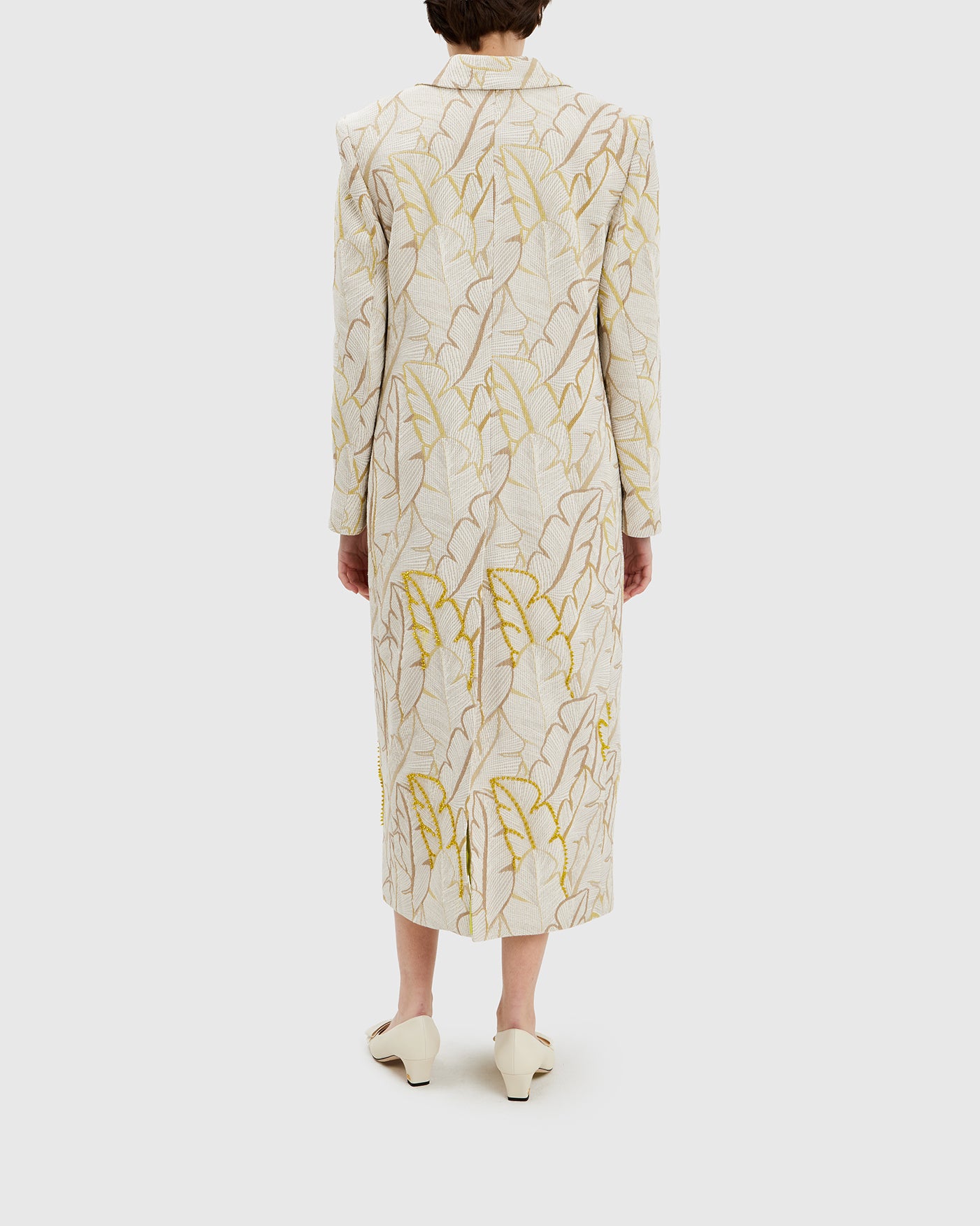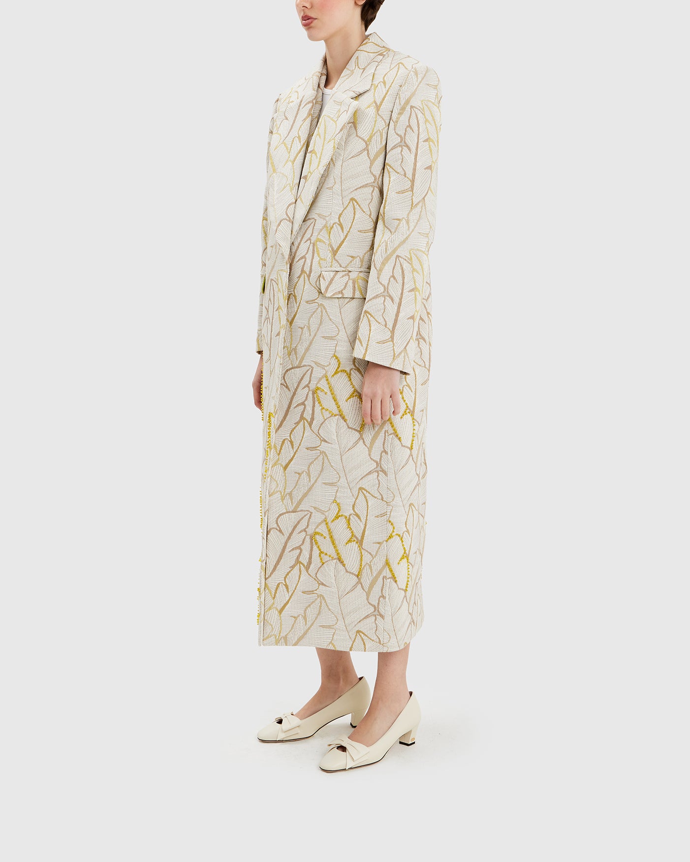 This long coat’s pristine white exterior is delicately embellished with acid-yellow beadwork and subtle leaf motifs, creating a refined interplay of texture and pattern. It makes a statement through nuanced details and a hidden burst of color.