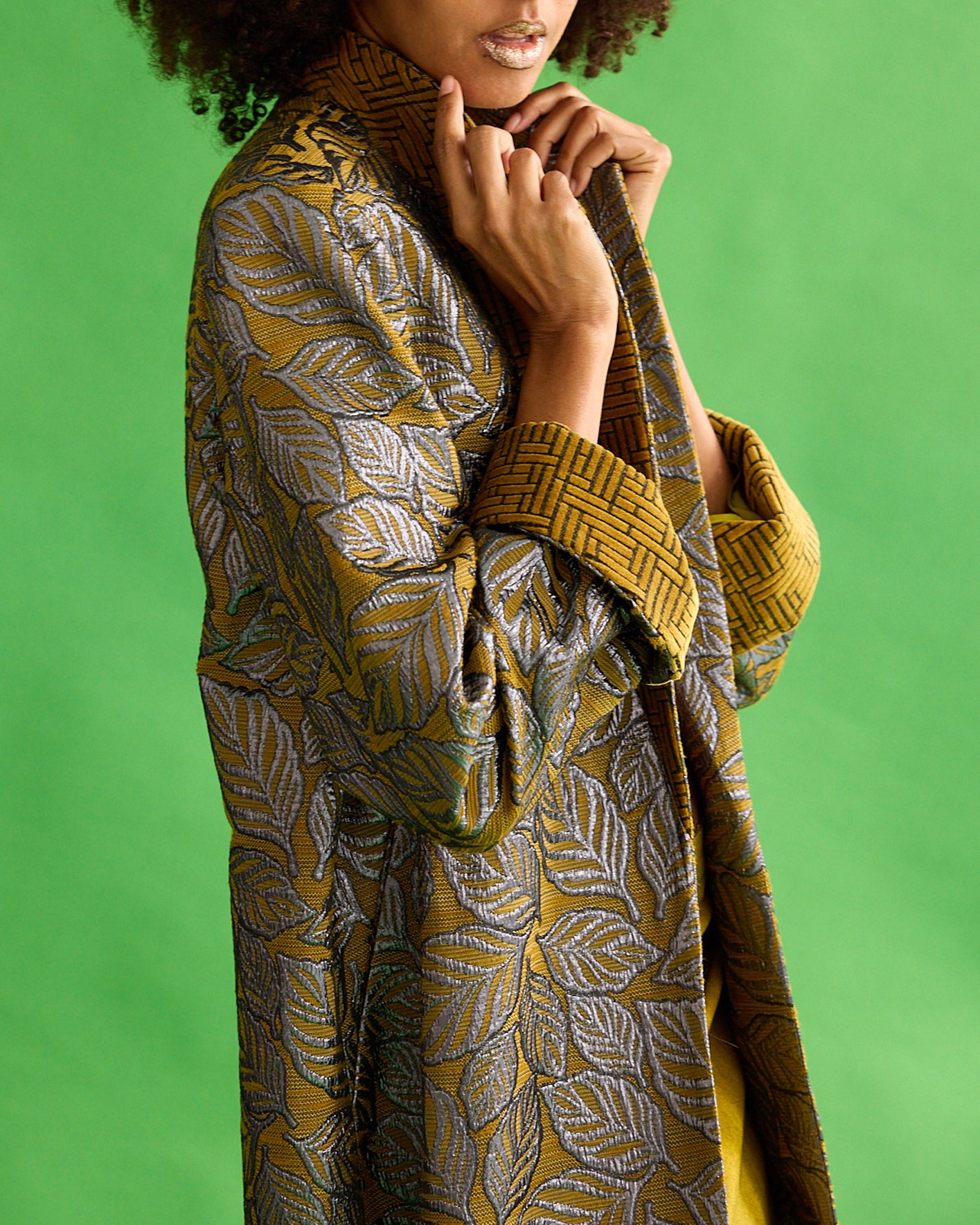 Uprising merges organic beauty with intricate detailing, creating a piece that radiates both power and grace. It features metallic charcoal leaves, intricately embroidered with bead applications that add dimension to the design. The rich detailing imparts a bold, commanding presence, making it a perfect blend of elegance and strength.