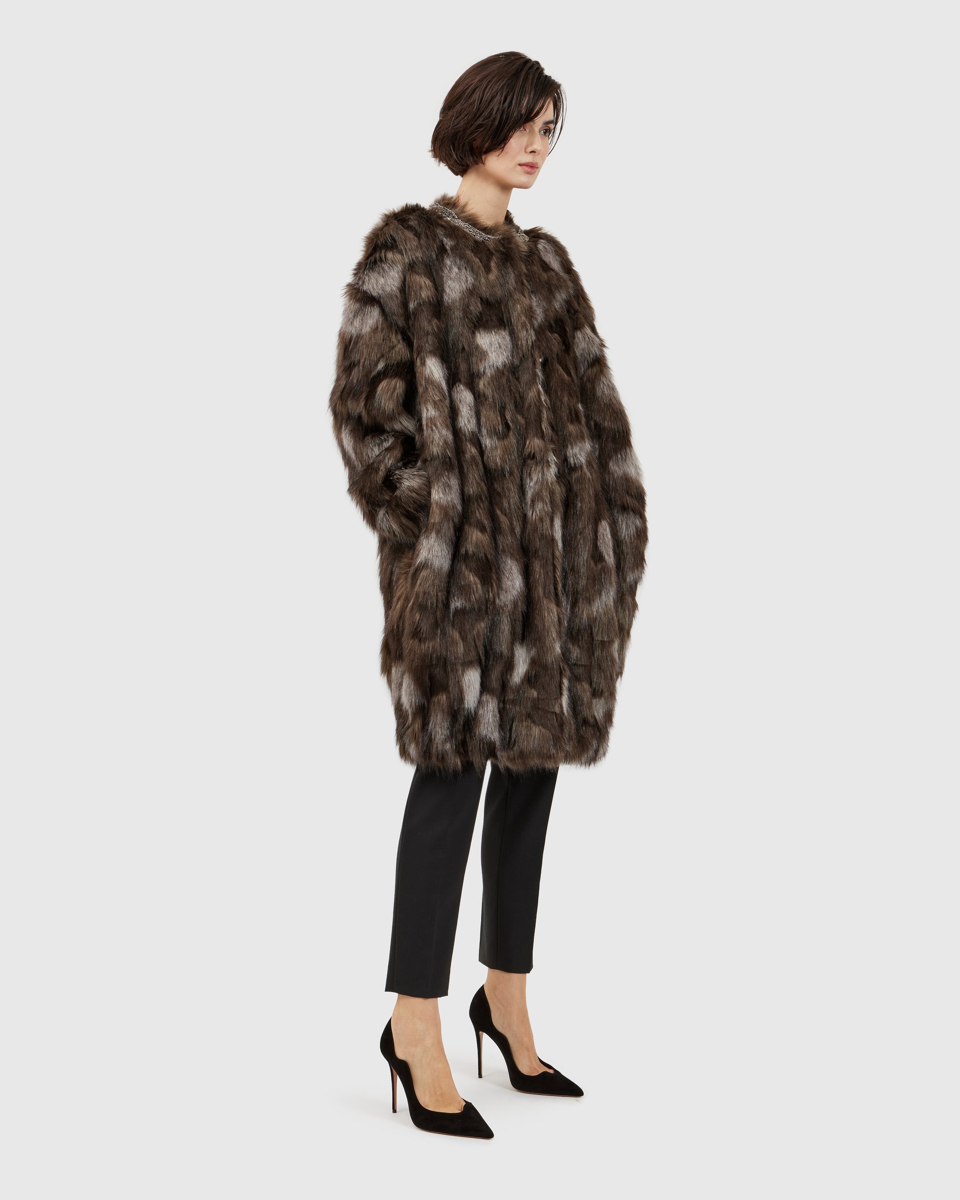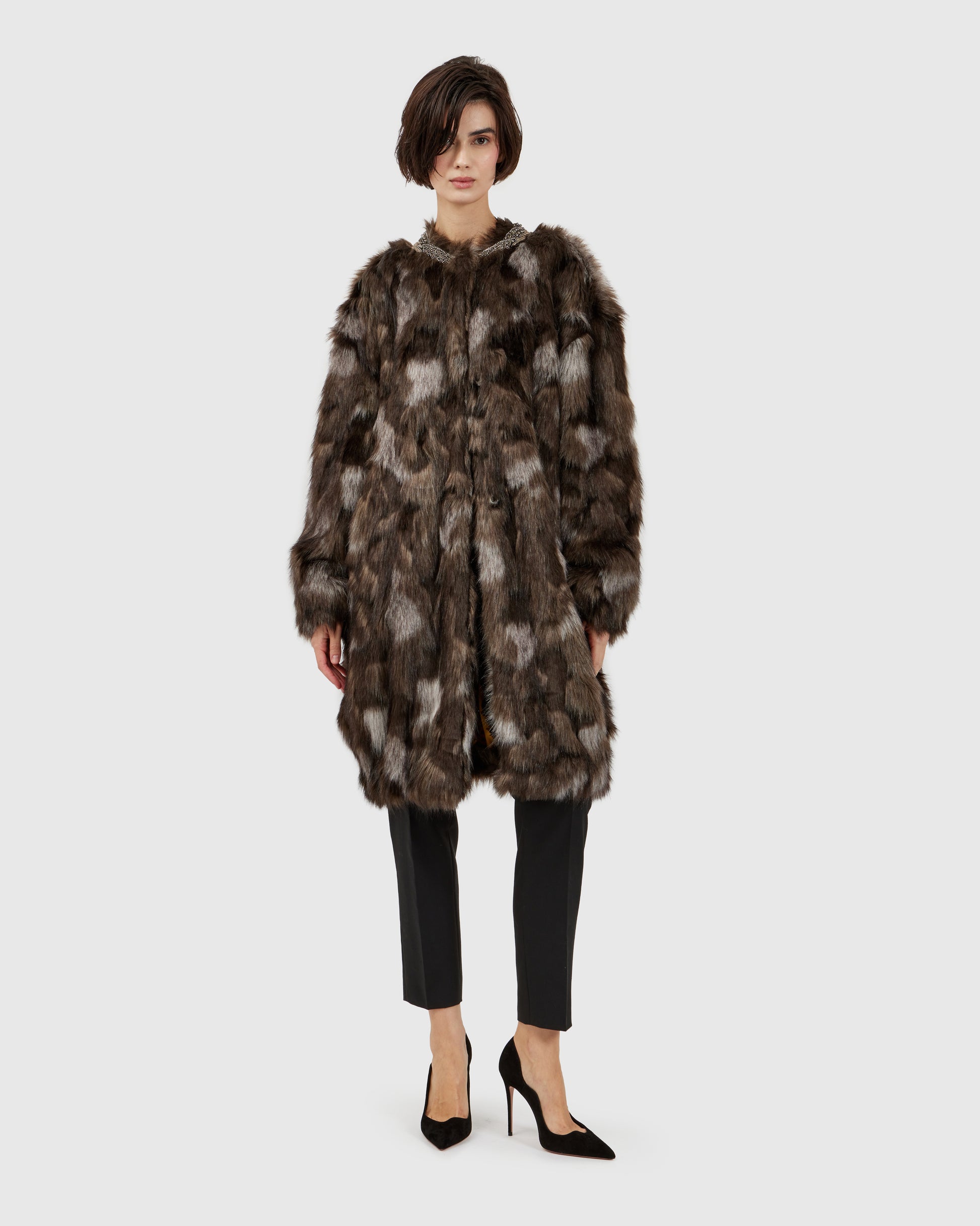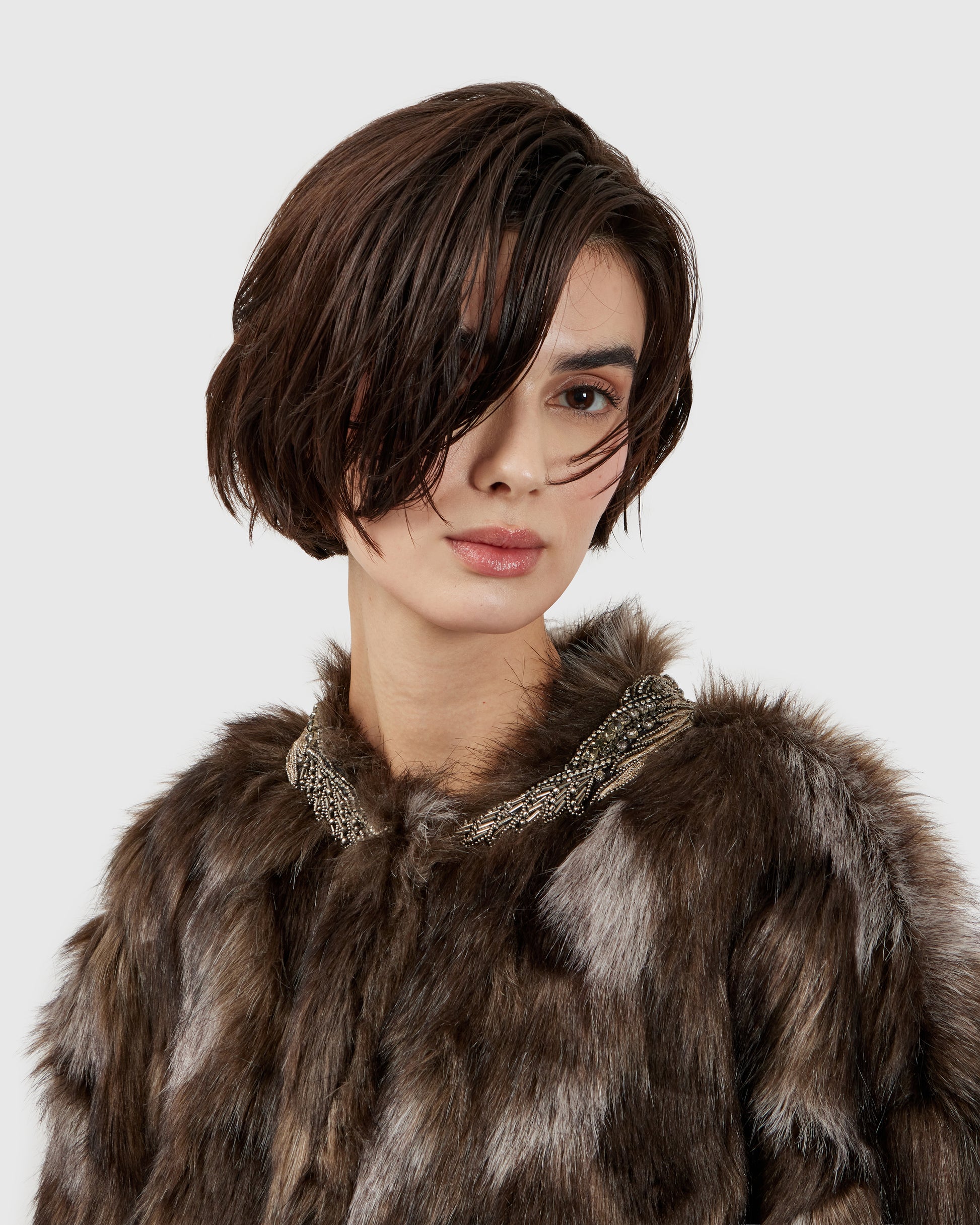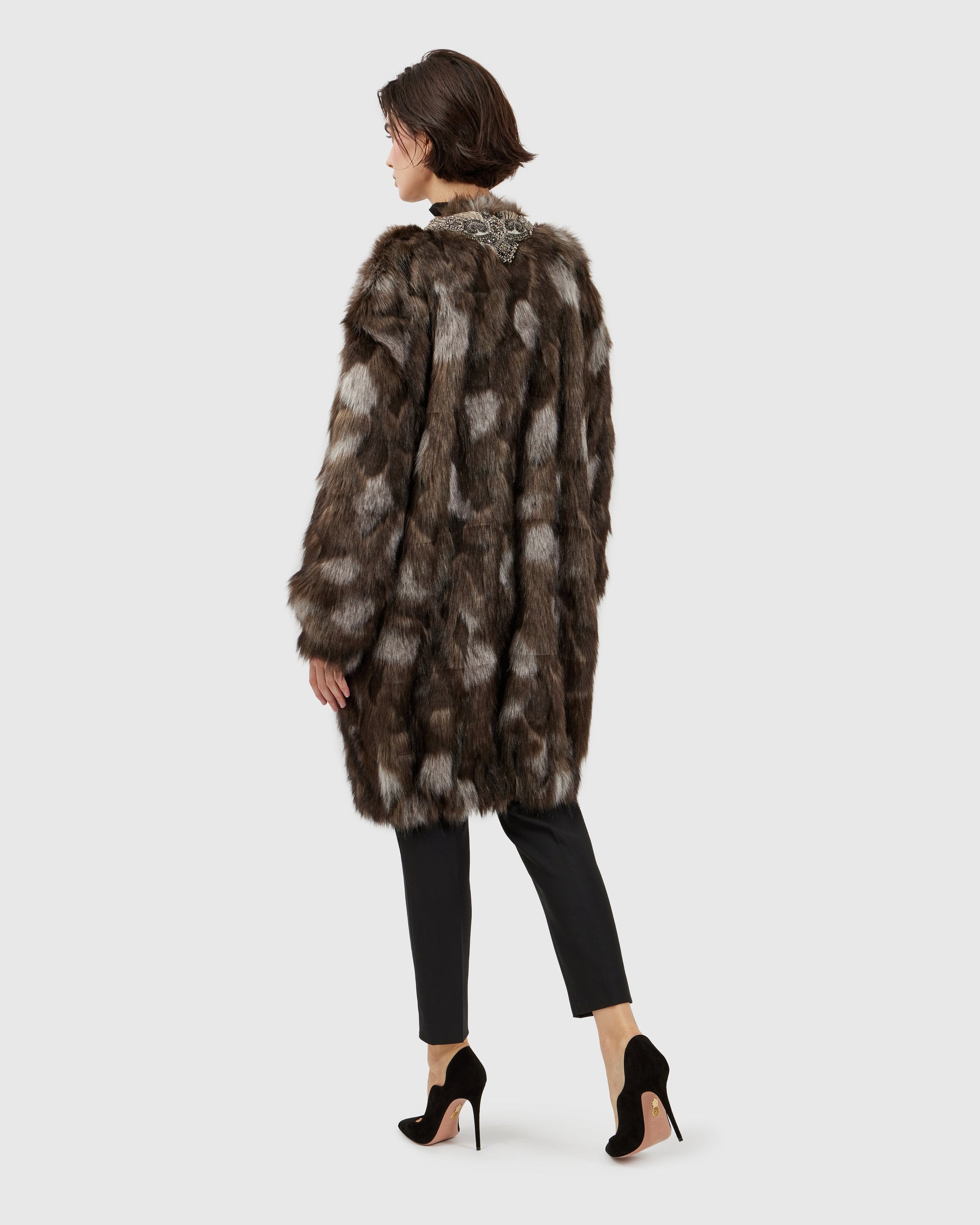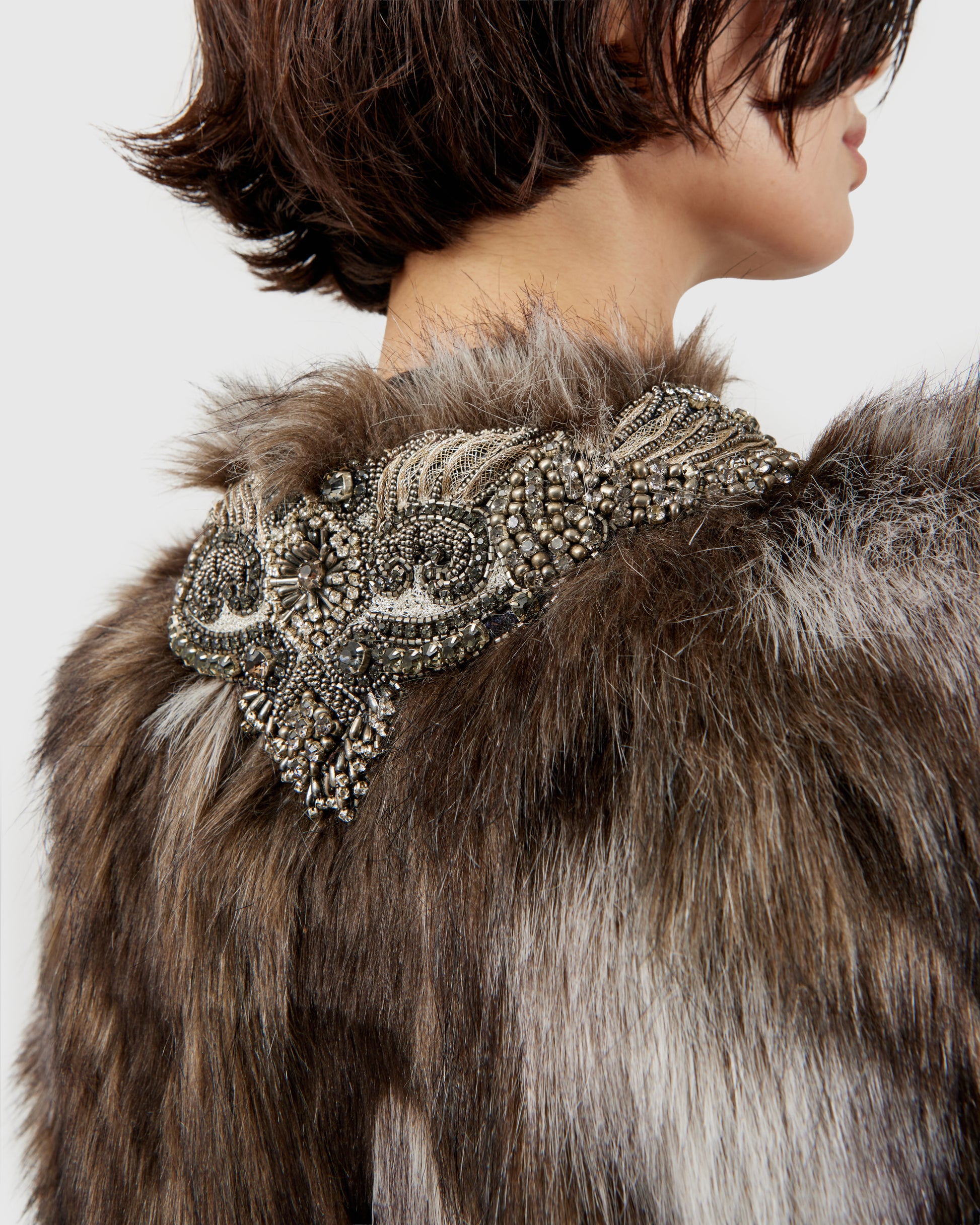 This mid length coat in grey faux fur channels the rough grace of a wolf’s pelt. At the collar and upper back, ornate detailing evokes the armor of ancient empires, adding a sense of ritual and power. It claims its presence with quiet intensity and the steady pulse of something untamed.