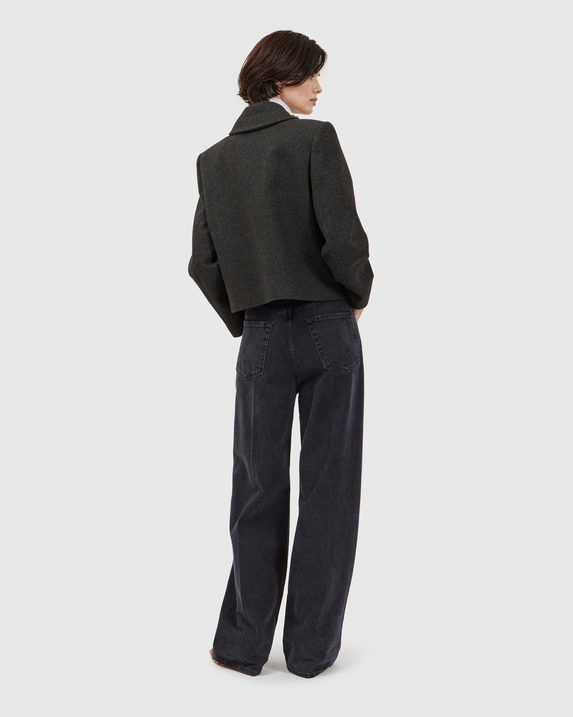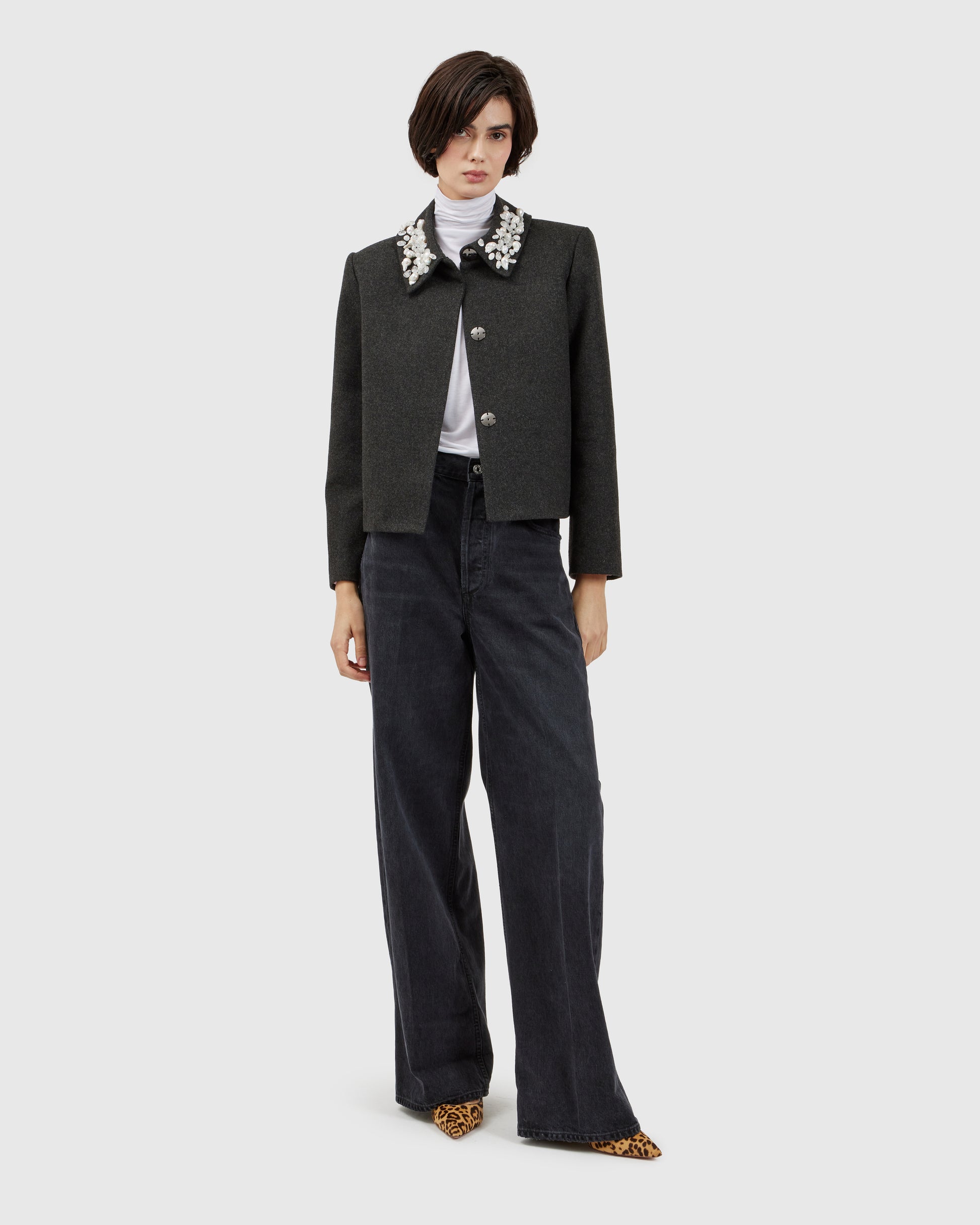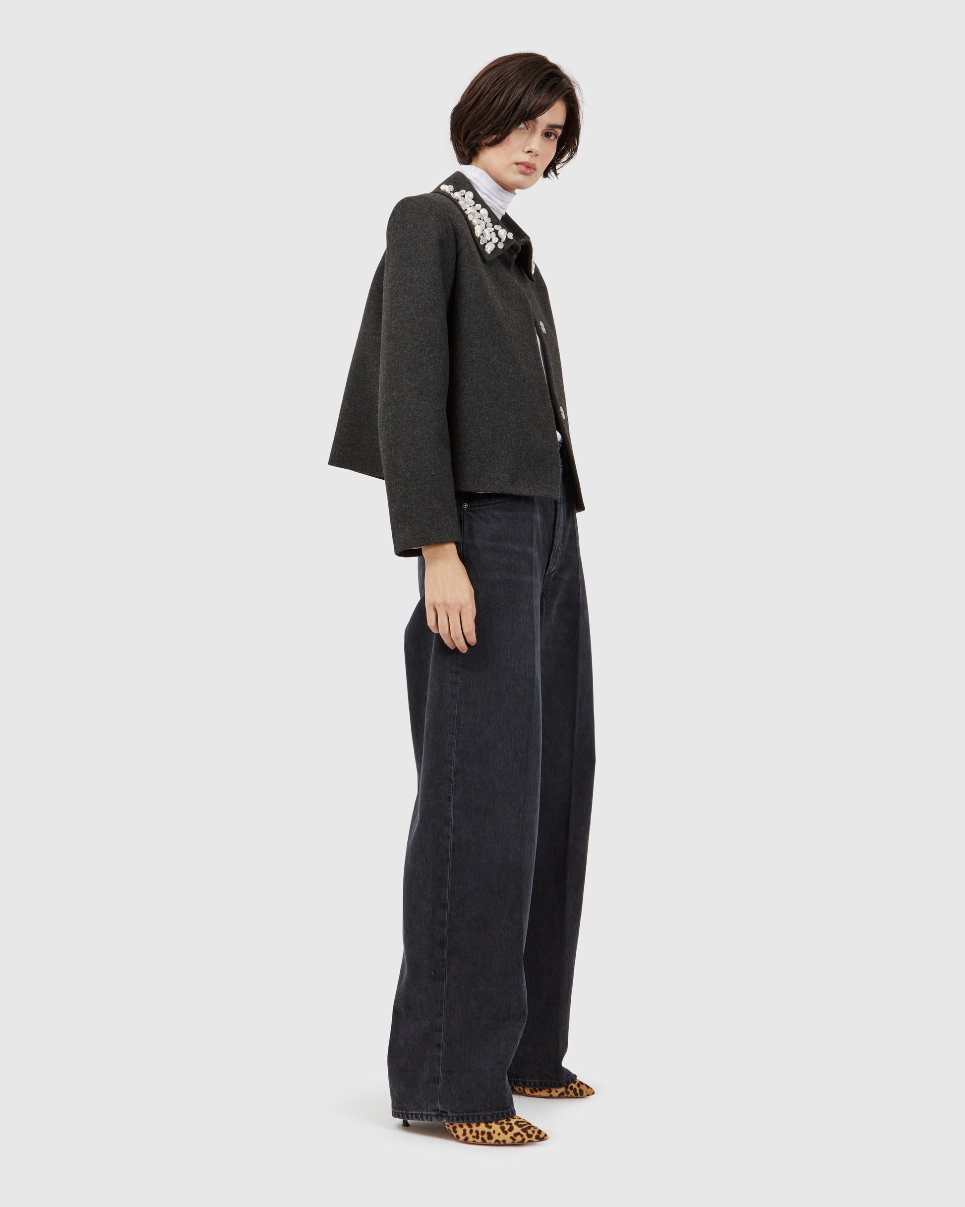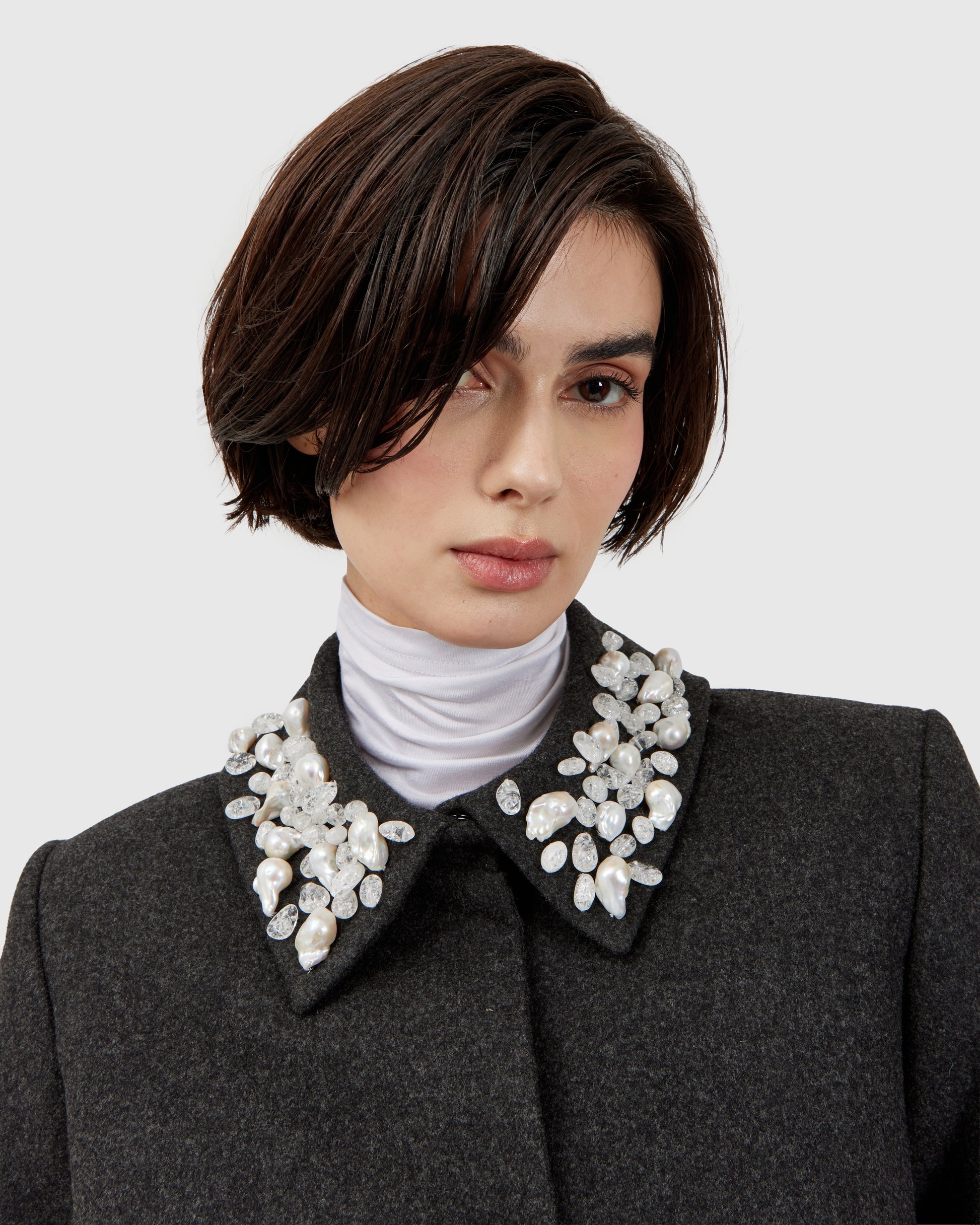 In this short coat, dark grey cashmere is enriched with river pearls and quartz crystals, creating a refined pattern of texture and detail. A pink lining adds a hidden warmth, turning each gesture into a delicate display of shimmer and sophistication.