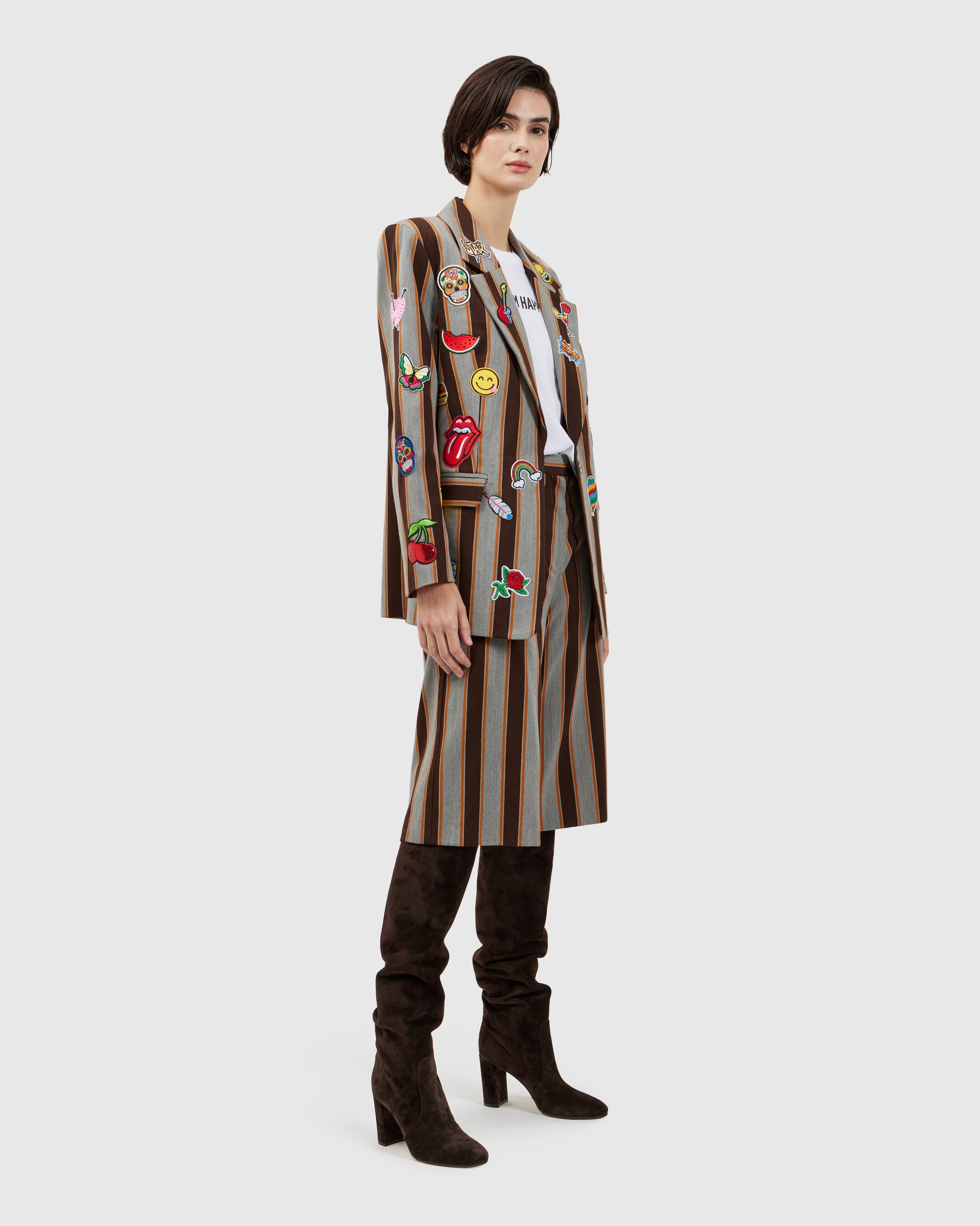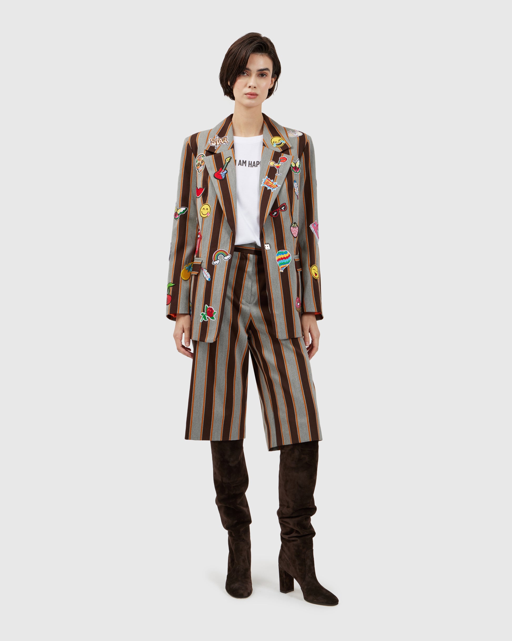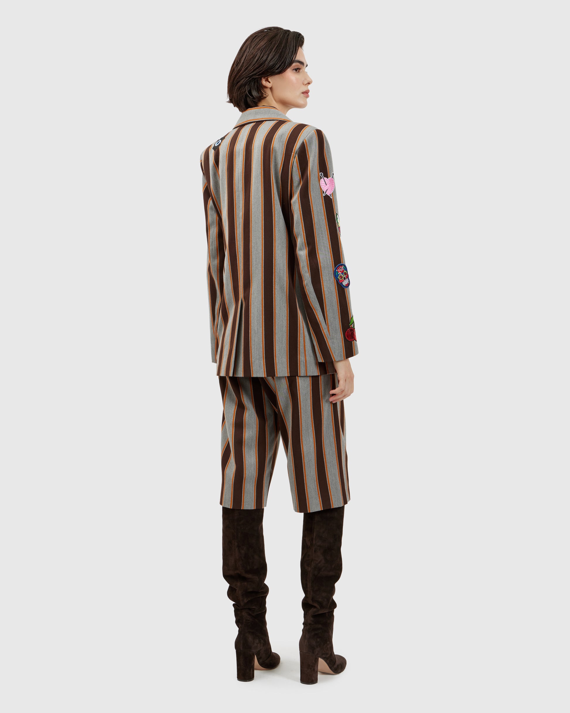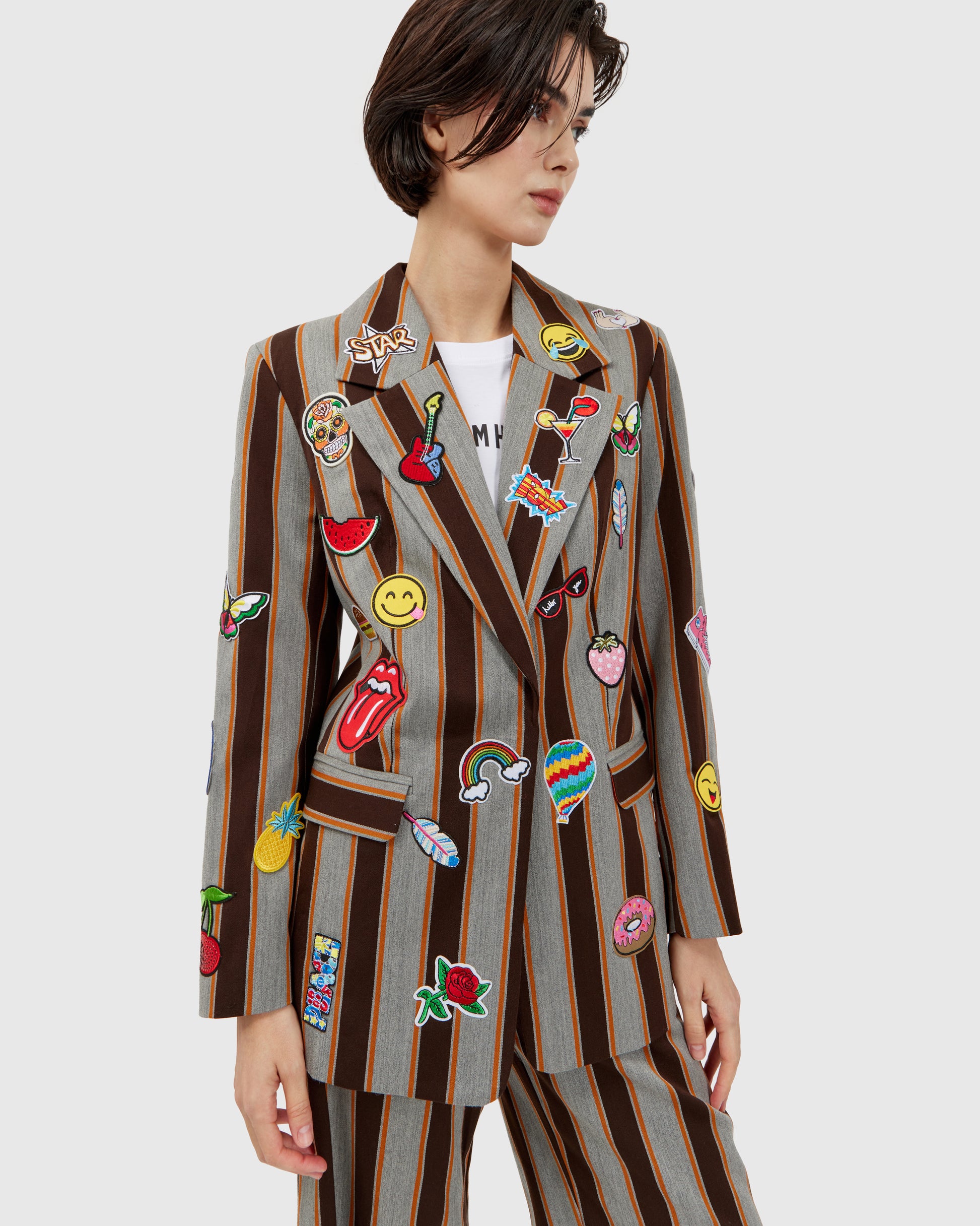 A rock inspired blazer takes shape in grey with brown stripes and a bold orange base, covered in patches that celebrate the raw spirit of rock and roll. The matching shorts keep the beat, completing a look that plays loud even in silence.