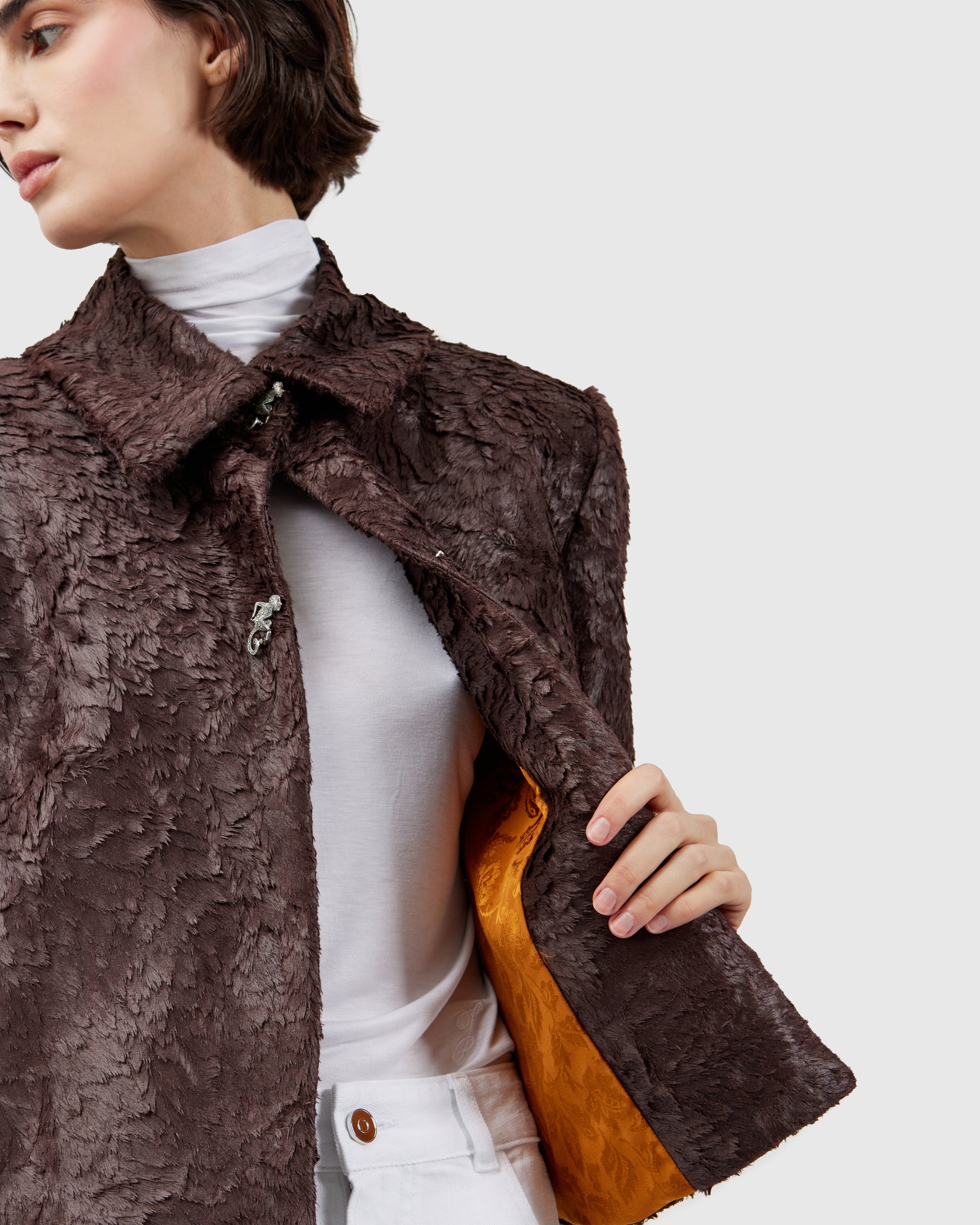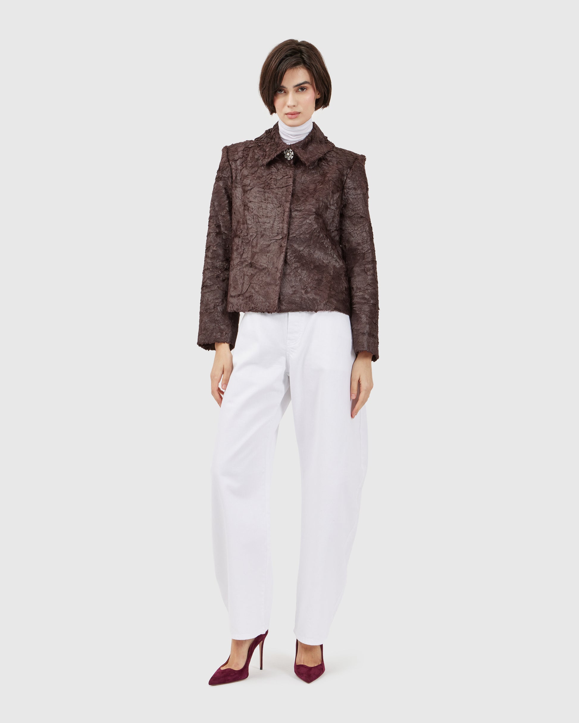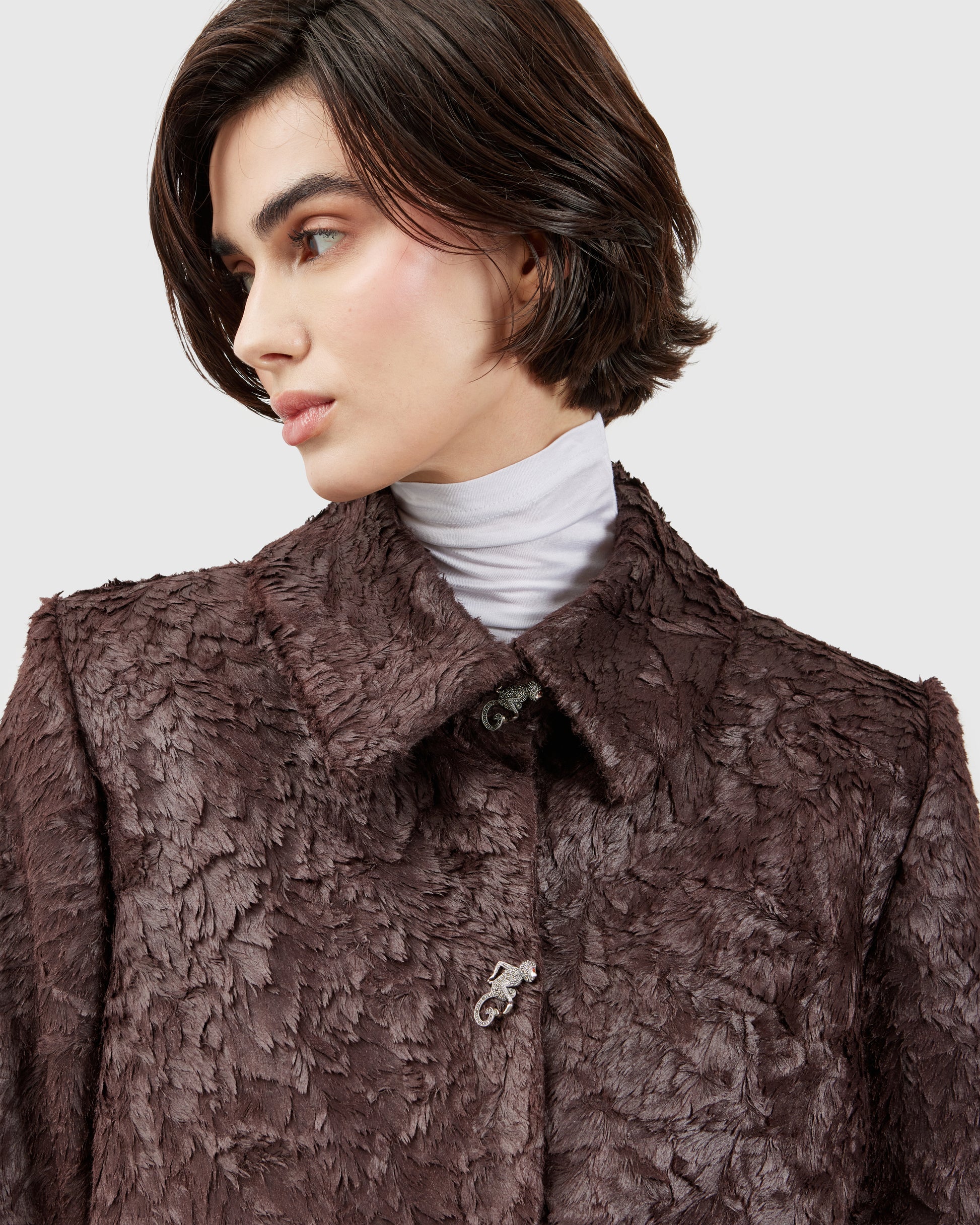 This deep burgundy jacket, textured like animal fur, is adorned with two silver monkey appliqués. The sculpted metallic details contrast with the soft, rich fabric, creating a balance between whimsy and refinement. Every gesture animates the piece, turning it into a subtle performance.