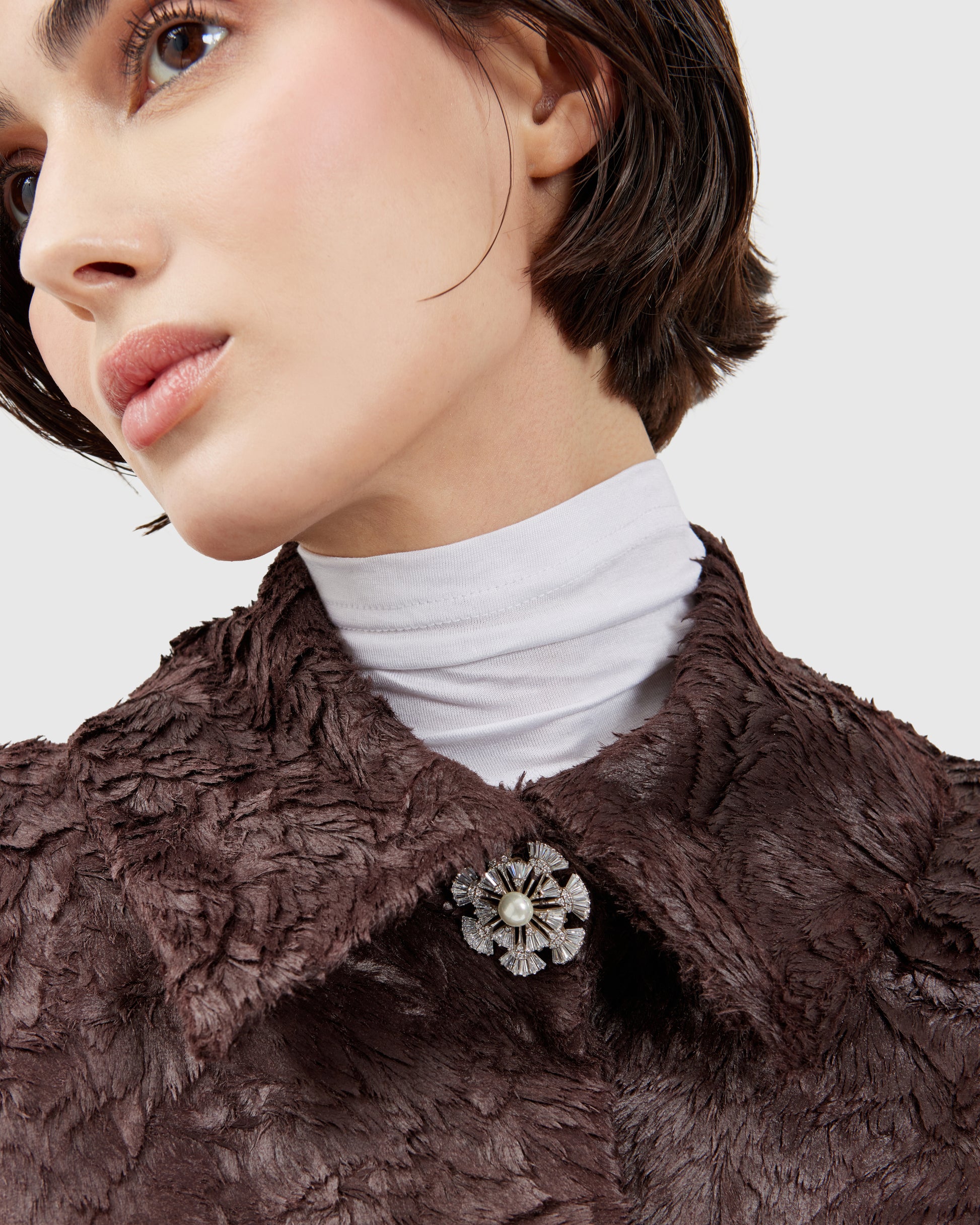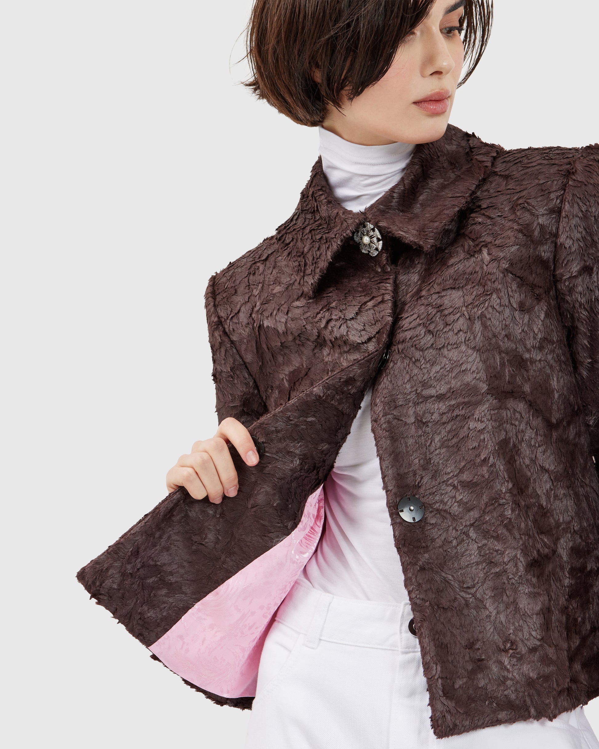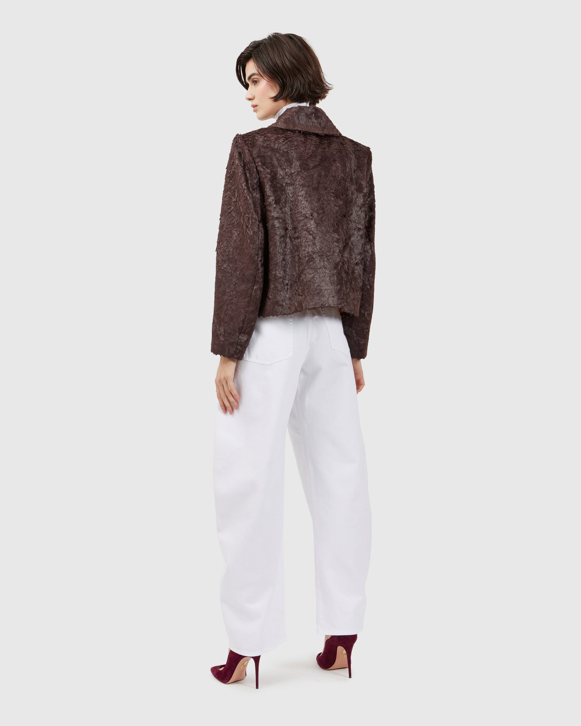 This deep burgundy jacket, textured like animal fur, is adorned with two silver monkey appliqués. The sculpted metallic details contrast with the soft, rich fabric, creating a balance between whimsy and refinement. Every gesture animates the piece, turning it into a subtle performance.