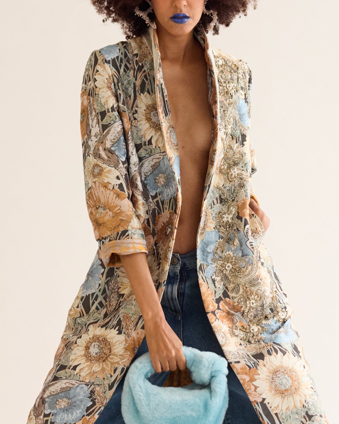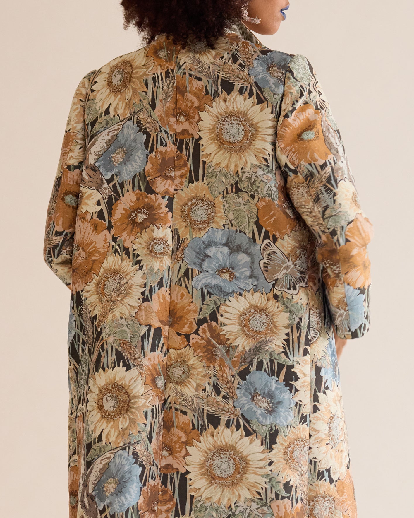 A charming play of sunflowers over sunflowers, mixed with other blooms, brought to life with metallic beads and shiny petals. Delicate ornaments scatter across the surface, making this long coat truly one of a kind. It’s a celebration of joy in every single detail.