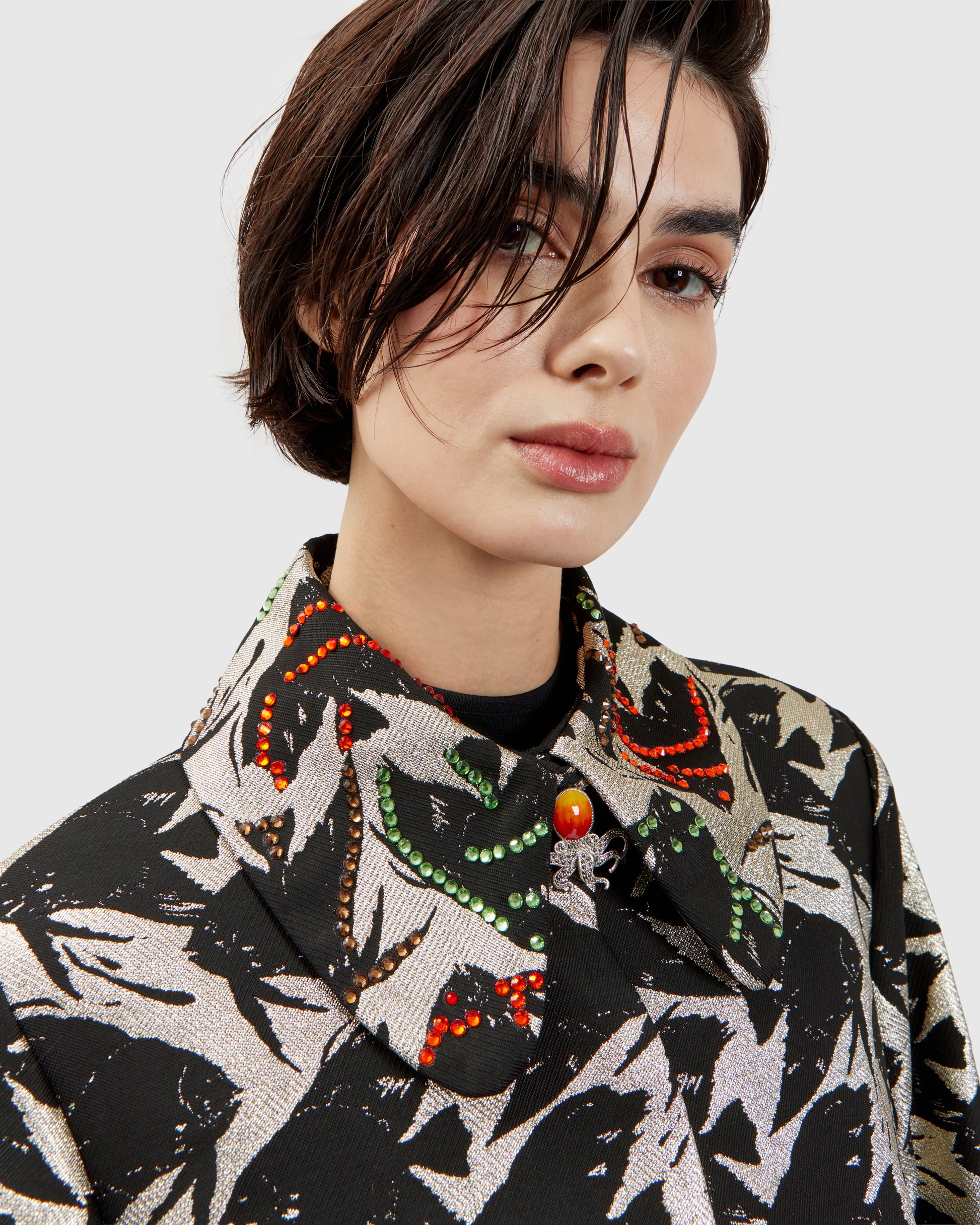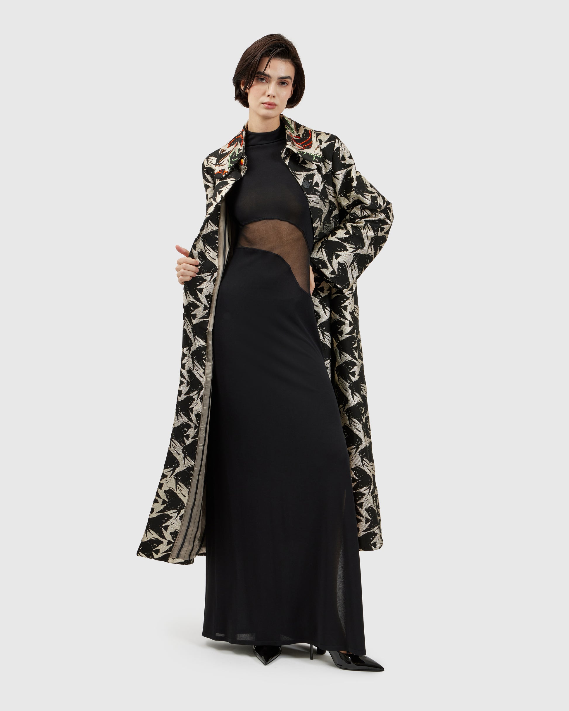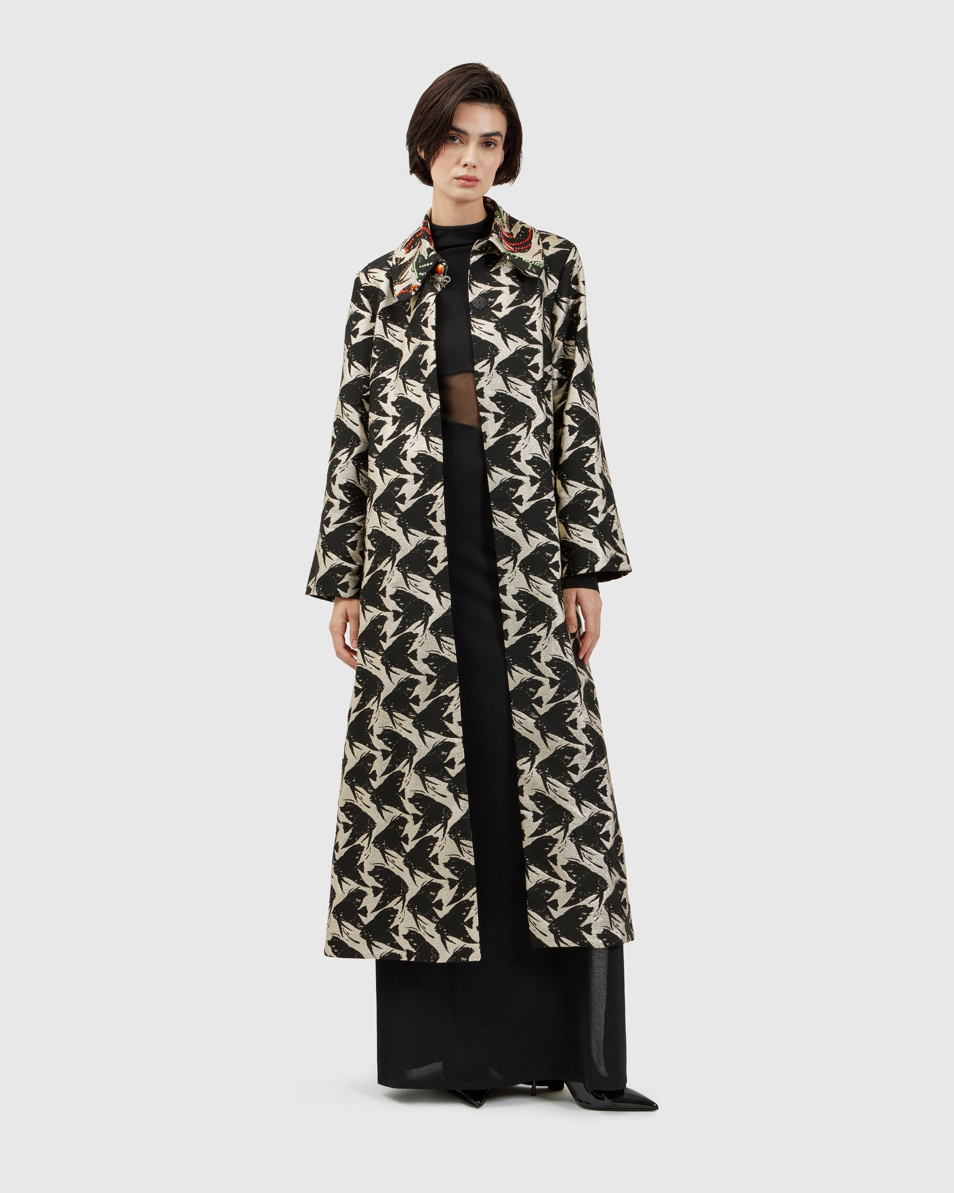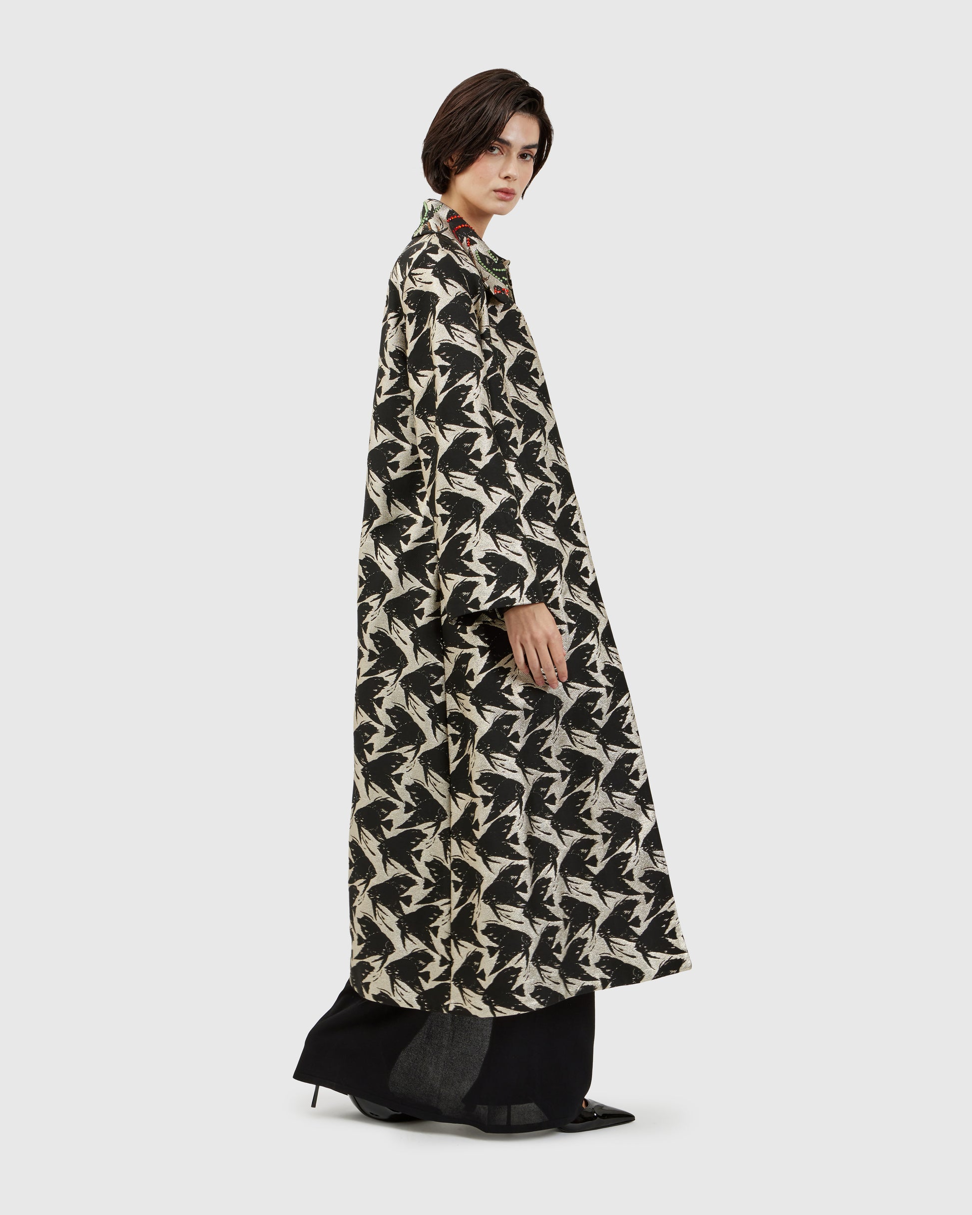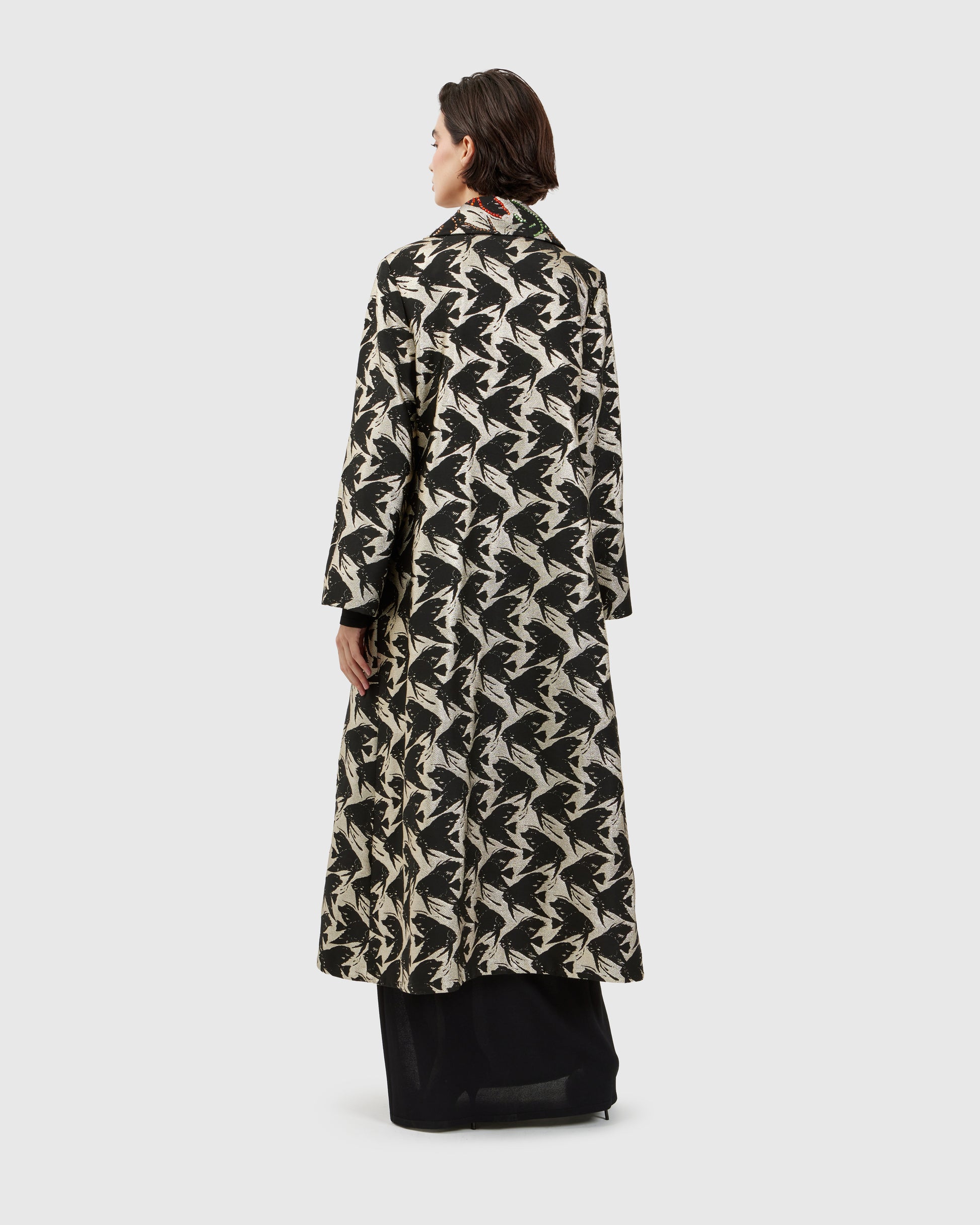 A fish-inspired pattern flows across the duster, while Swarovski crystal appliqués on the collar scatter light and color, creating a striking contrast against the flowing fabric. Each movement sets the crystals aglow, letting the jacket capture attention in subtle waves.