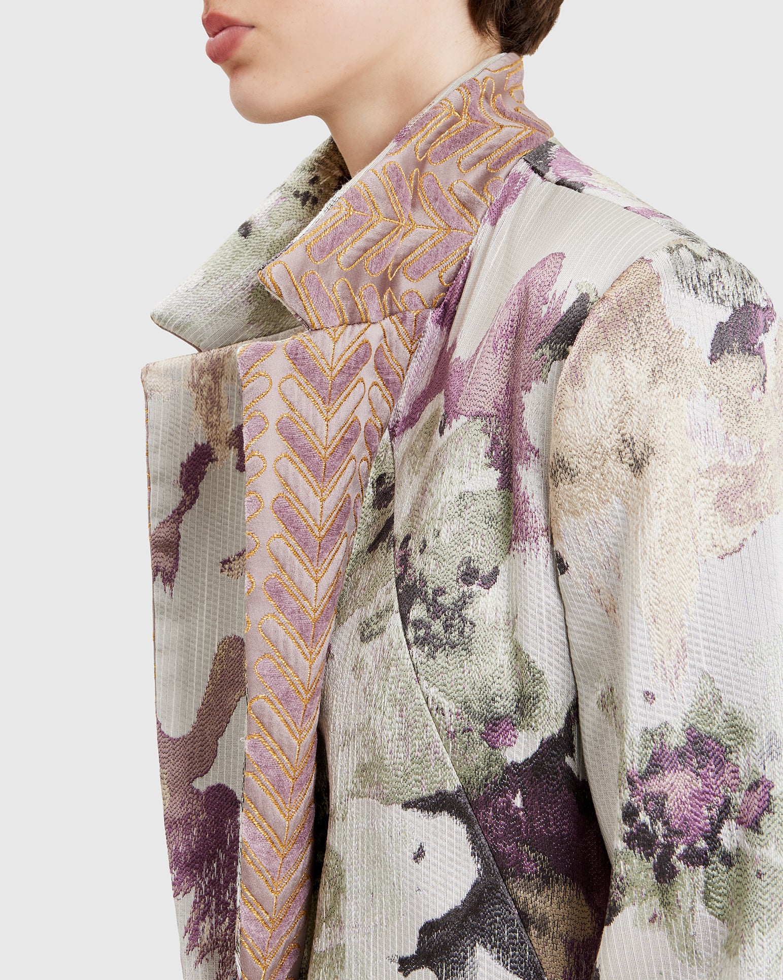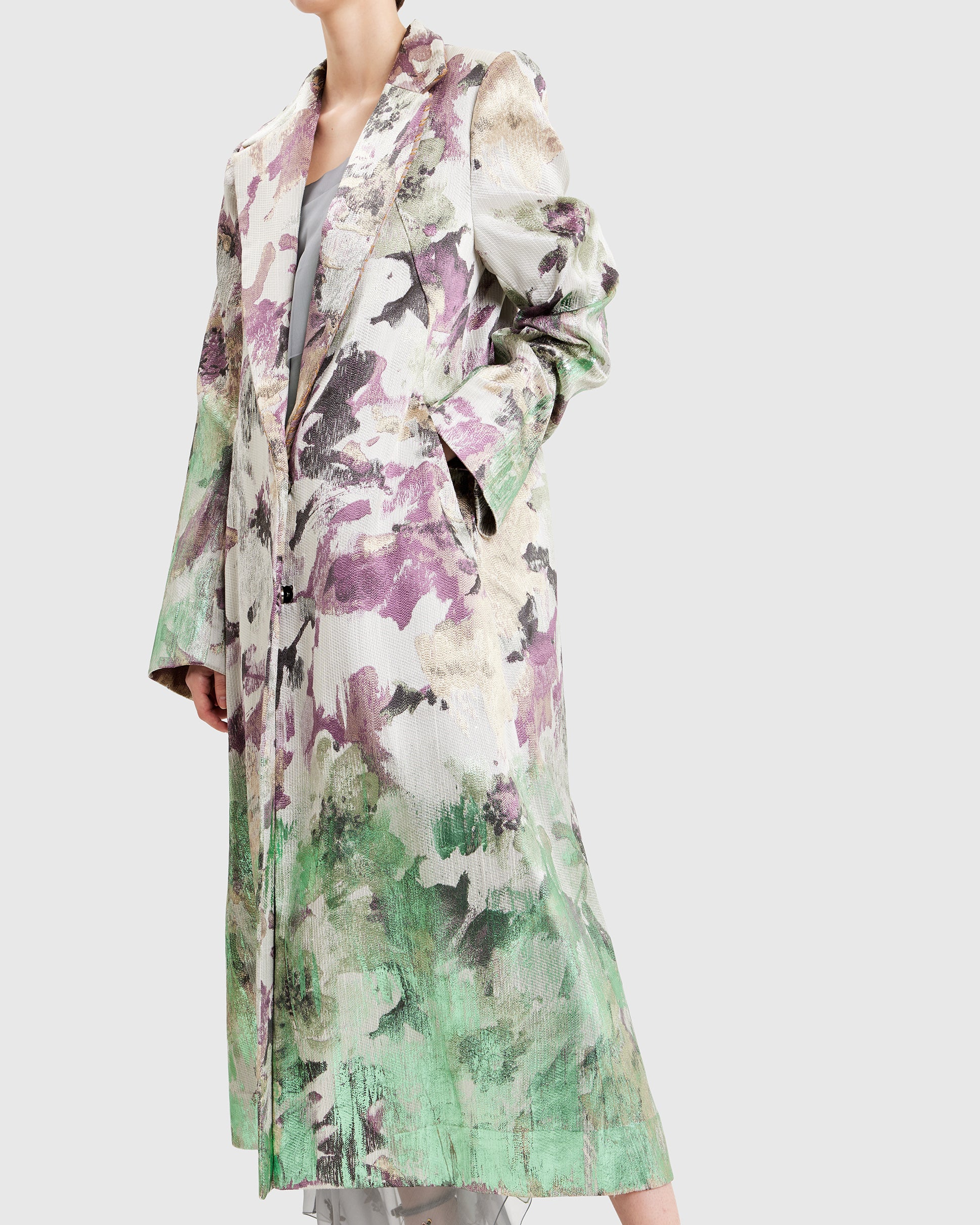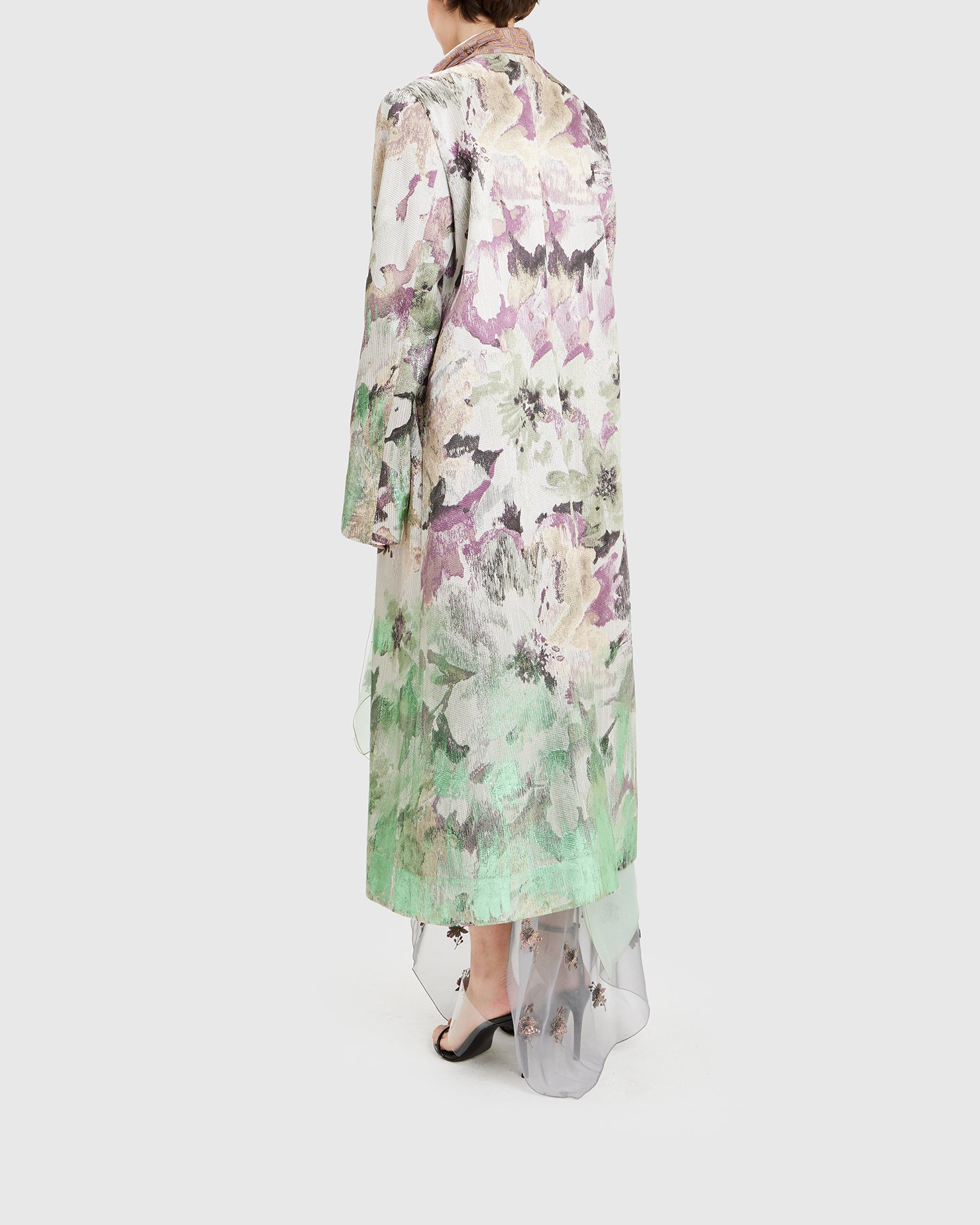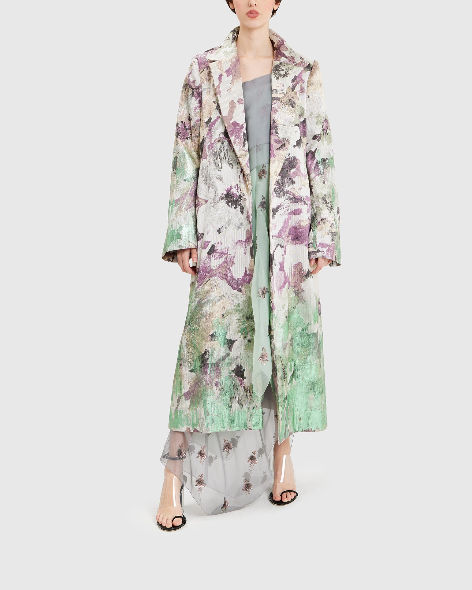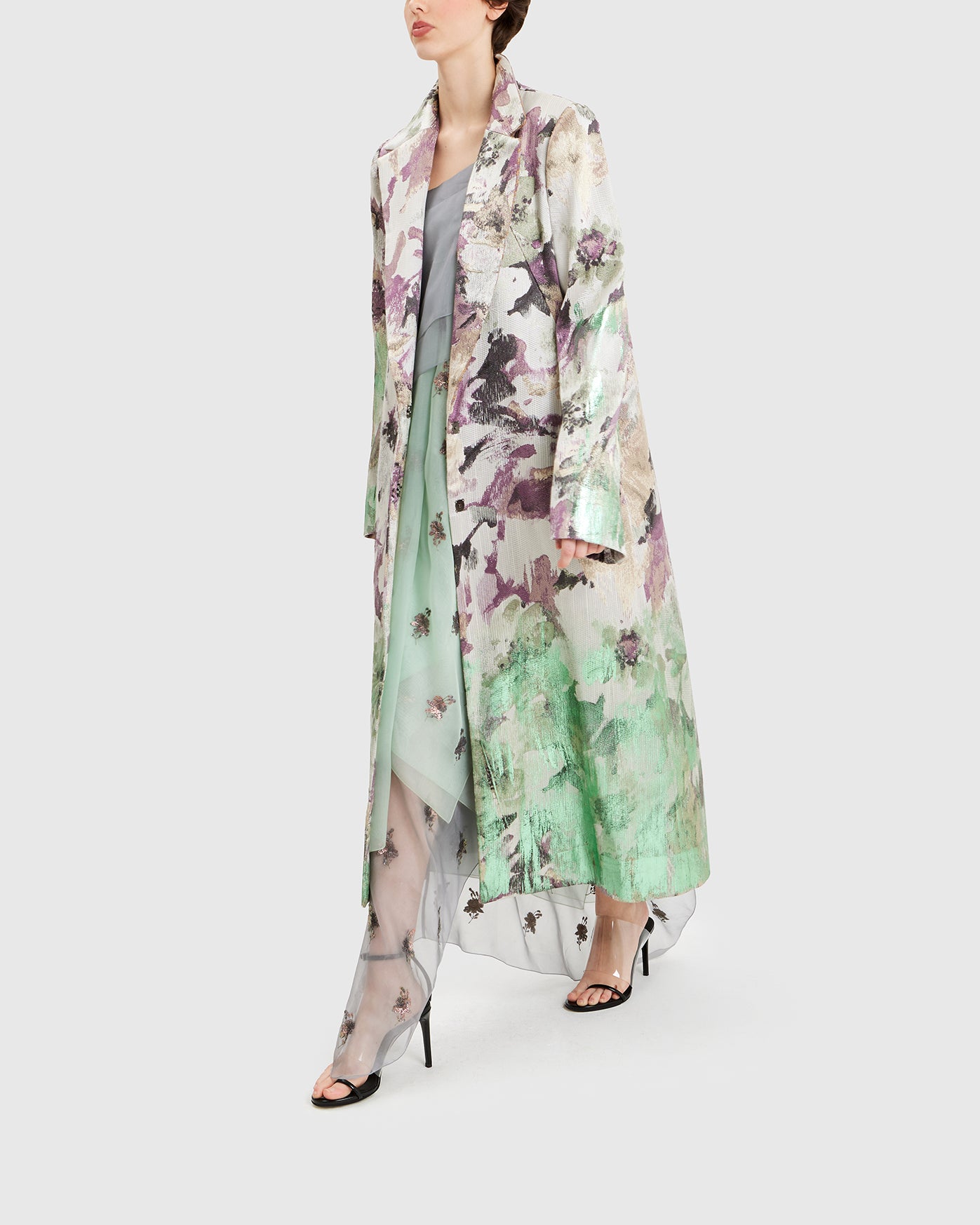 This long, lightweight coat in shimmering mint green creates a captivating contrast with the soft floral pattern woven into the fabric. Every detail evokes a gentle, natural beauty in a piece that effortlessly transitions from day to night. True elegance with a refreshing twist.