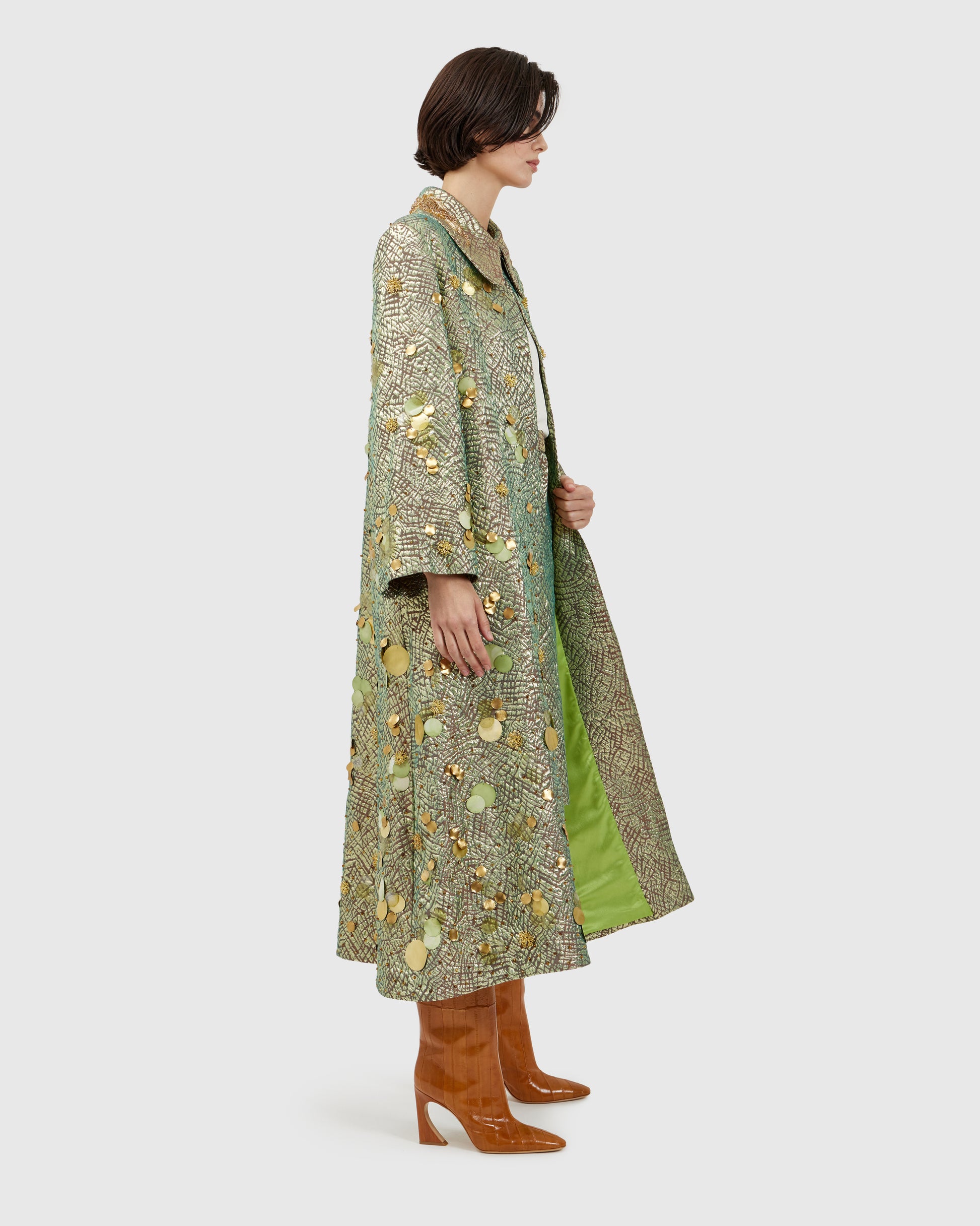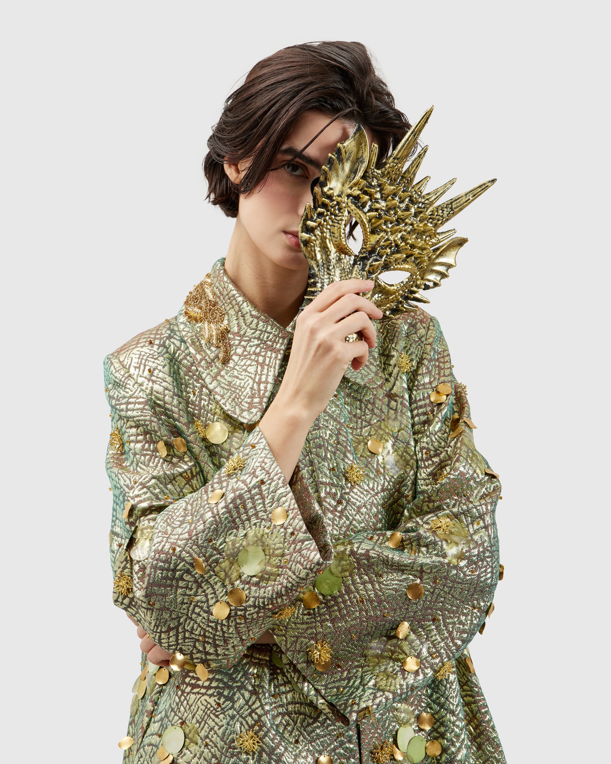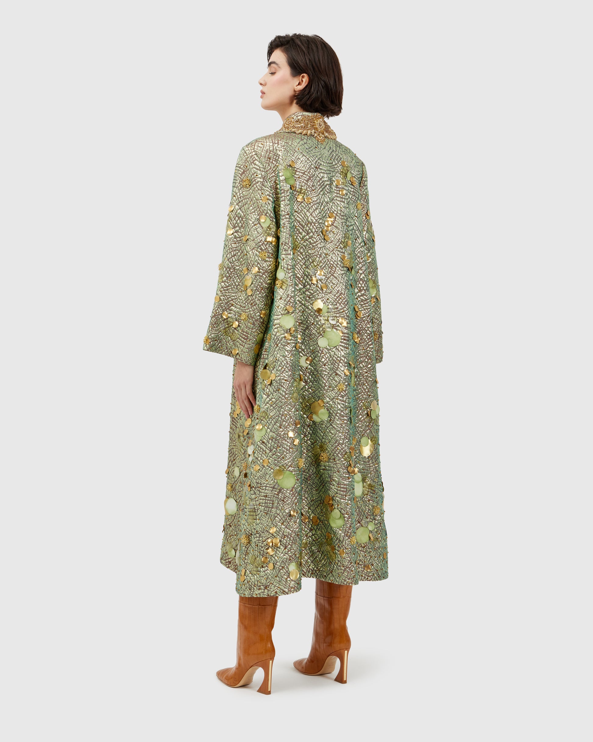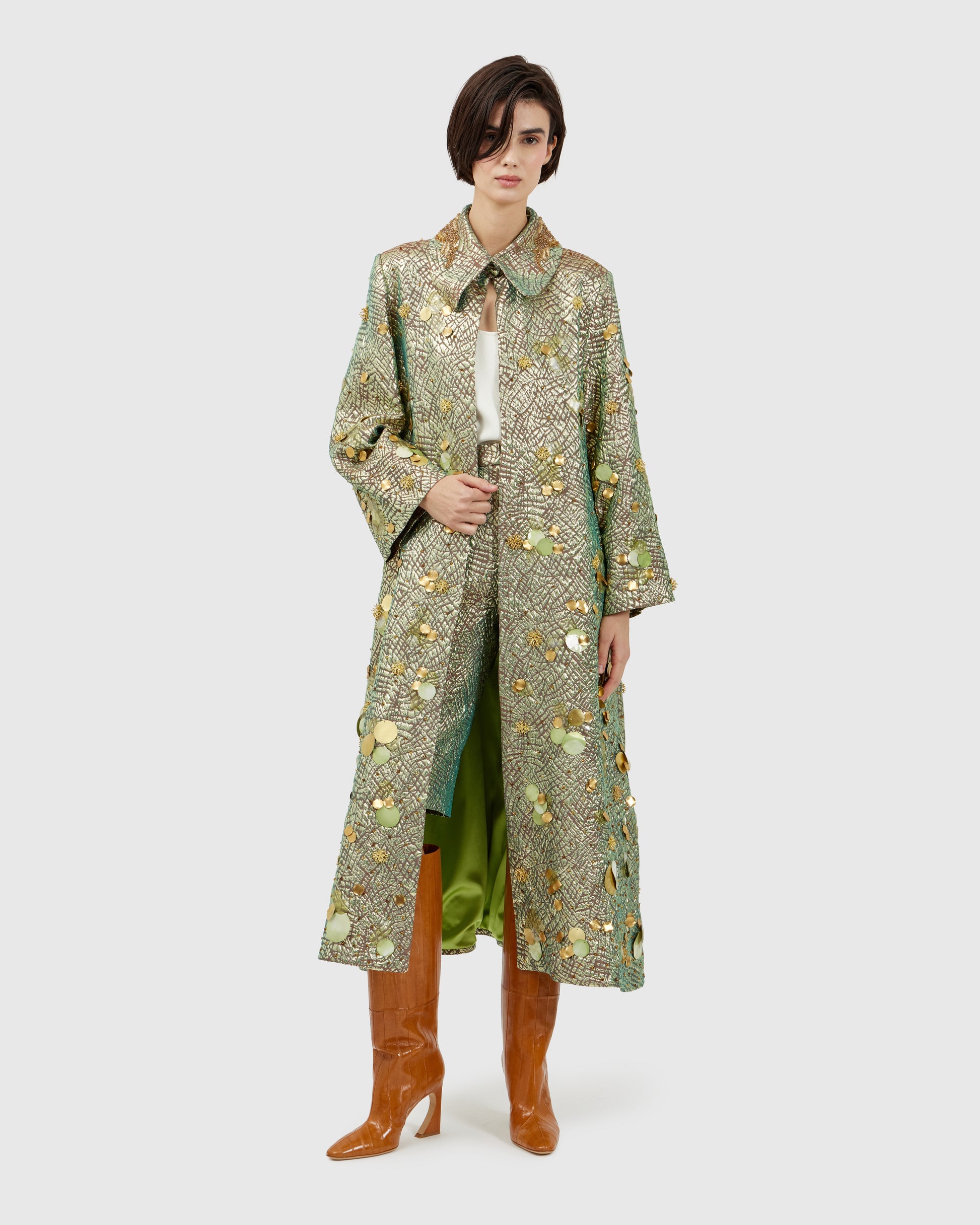 This long coat in shimmering green carries the primal echo of reptilian power, its texture recalling the scaled might of the legendary Godzilla. Gold and emerald appliqués ripple across its surface like a living armor, forming a second skin that moves with feral intent. Brace yourselves. The queen came out to play.